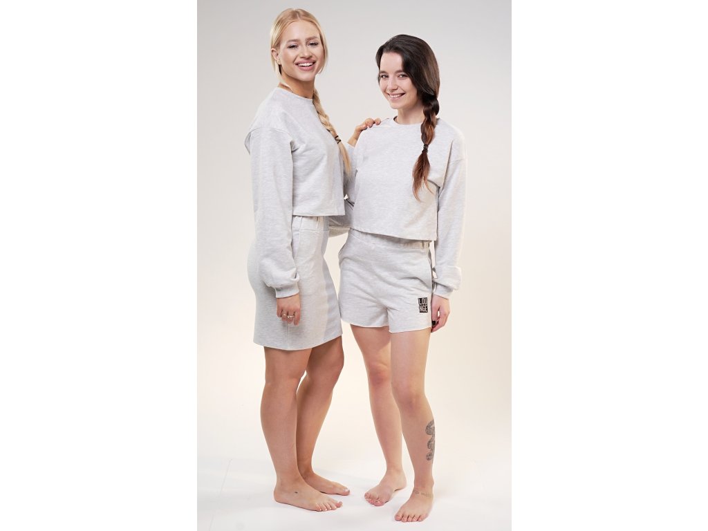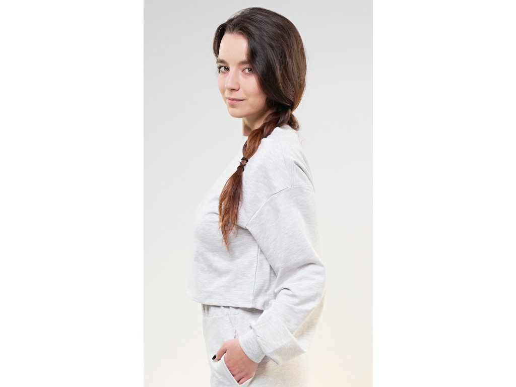 Dámská mikina Denisa. Světle šedá mikina má kulatý výstřih, rukávy zakončené panty a moderní zkrácenou délku. Použitý materiál s vysokým obsahem bavlny je příjemný a poddajný na dotek. Mikina je pohodlná a využijete ji téměř při všech volnočasových aktivitách.