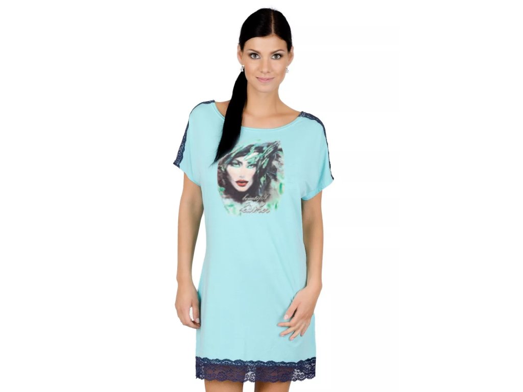 Dámská krajková noční košile s krátkým rukávem je ozdobená obrázkem dívky s pírky s nápisem ´Beautiful feather´. Krátké rukávy a spodní lem noční košile zdobí barevná krajka. Je možné používat i jako volné triko na doma.