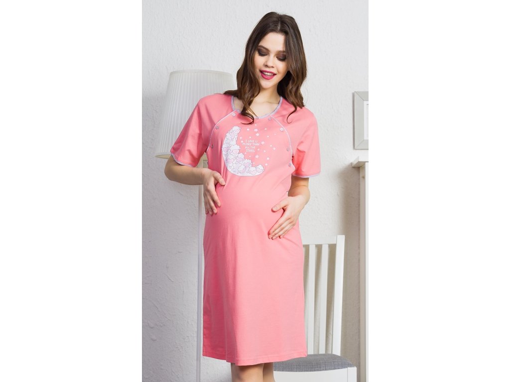 Dámská noční košile mateřská Beránci. Mateřská noční košile je svým střihem vhodná na dobu těhotenství, do porodnice, i ke kojení. Ke kojení slouží průstřihy po stranách košile. Na hrudi je obrázek půlměsíce složeného z roztomilých oveček, který obklopují drobné kytičky. Obrázek doplňuje nápis I love you more than stars. Použitý materiál je jemný a poddajný na dotek. Košile je vhodná i na denní nošení.