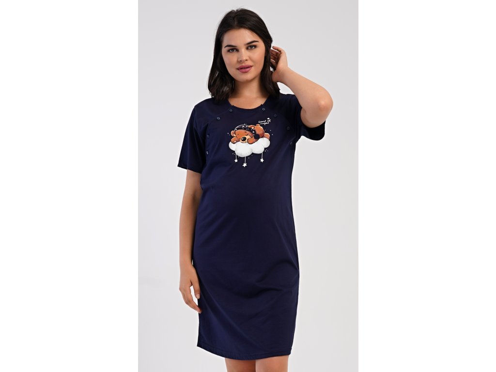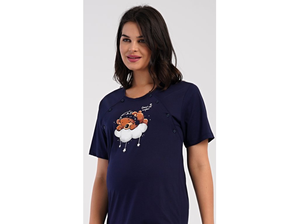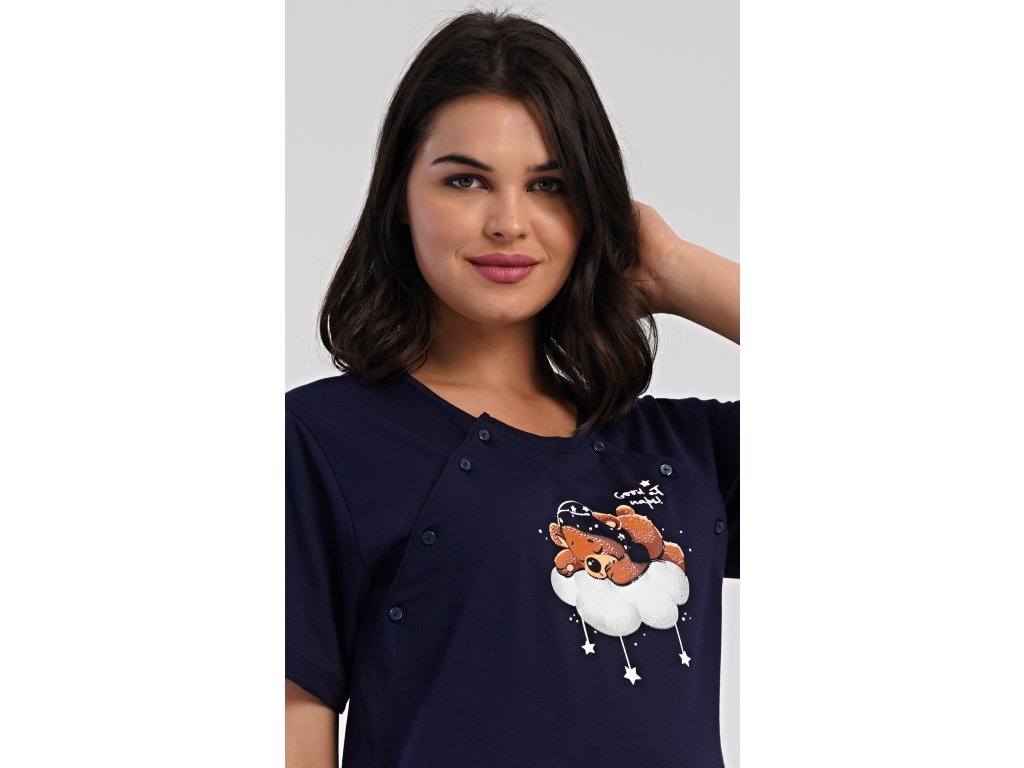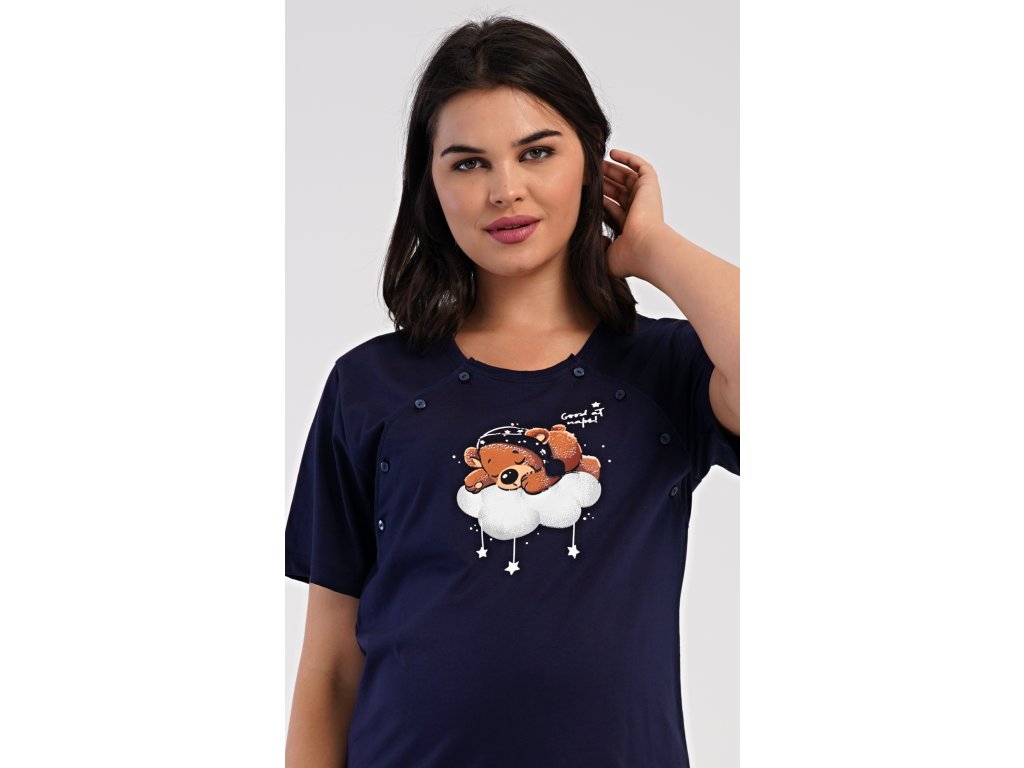 Dámská bavlněná mateřská noční košile s krátkým rukávem Méďa na obláčku. Noční košile je svým střihem určená na dobu těhotenství, do porodnice i ke kojení. Ke kojení slouží průstřihy po stranách košile, které jsou uzavíratelné na knoflíky. Jednobarevná košile je ozdobena obrázkem medvídka, který odpočívá na obláčku. Použitý materiál s podílem bavlny 100% je příjemný a poddajný na dotek.