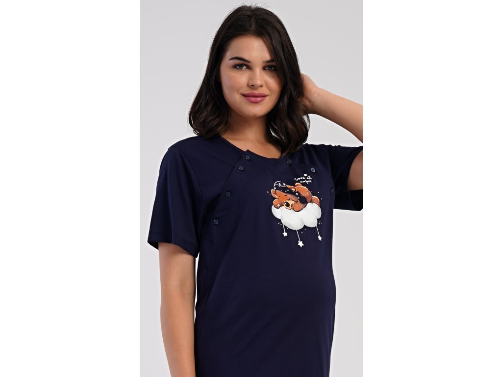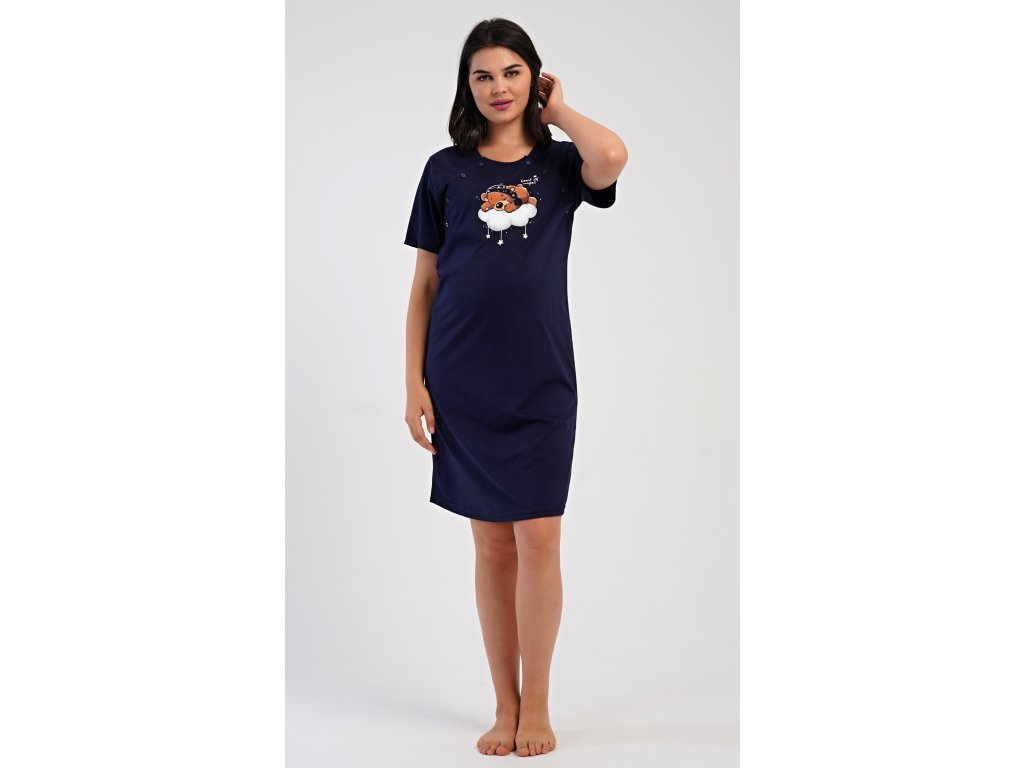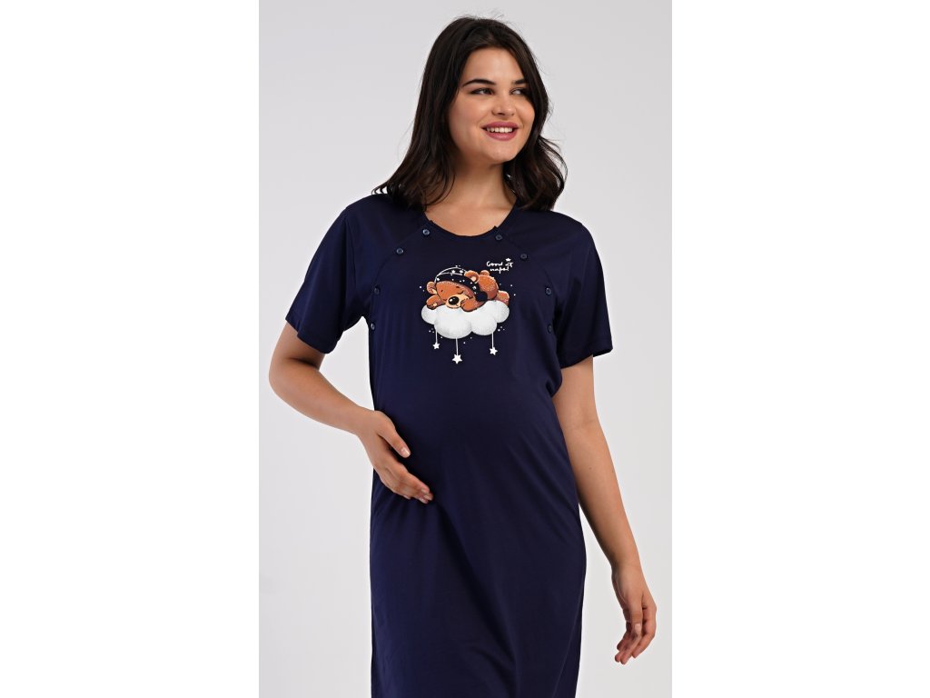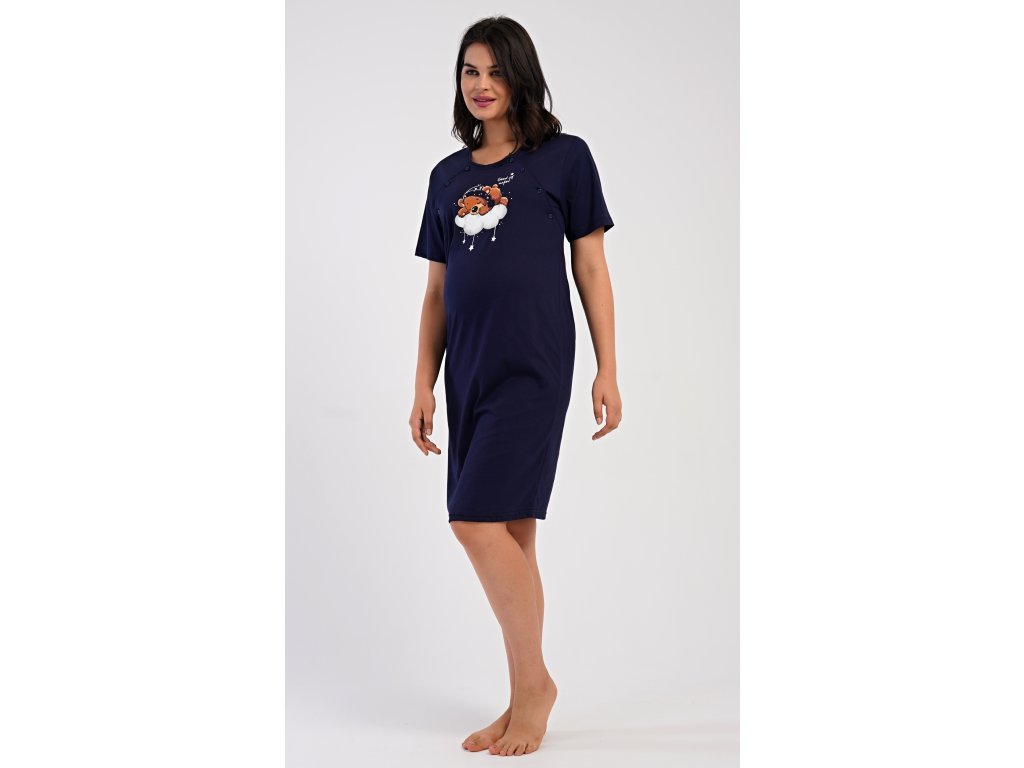 Dámská bavlněná mateřská noční košile s krátkým rukávem Méďa na obláčku. Noční košile je svým střihem určená na dobu těhotenství, do porodnice i ke kojení. Ke kojení slouží průstřihy po stranách košile, které jsou uzavíratelné na knoflíky. Jednobarevná košile je ozdobena obrázkem medvídka, který odpočívá na obláčku. Použitý materiál s podílem bavlny 100% je příjemný a poddajný na dotek.