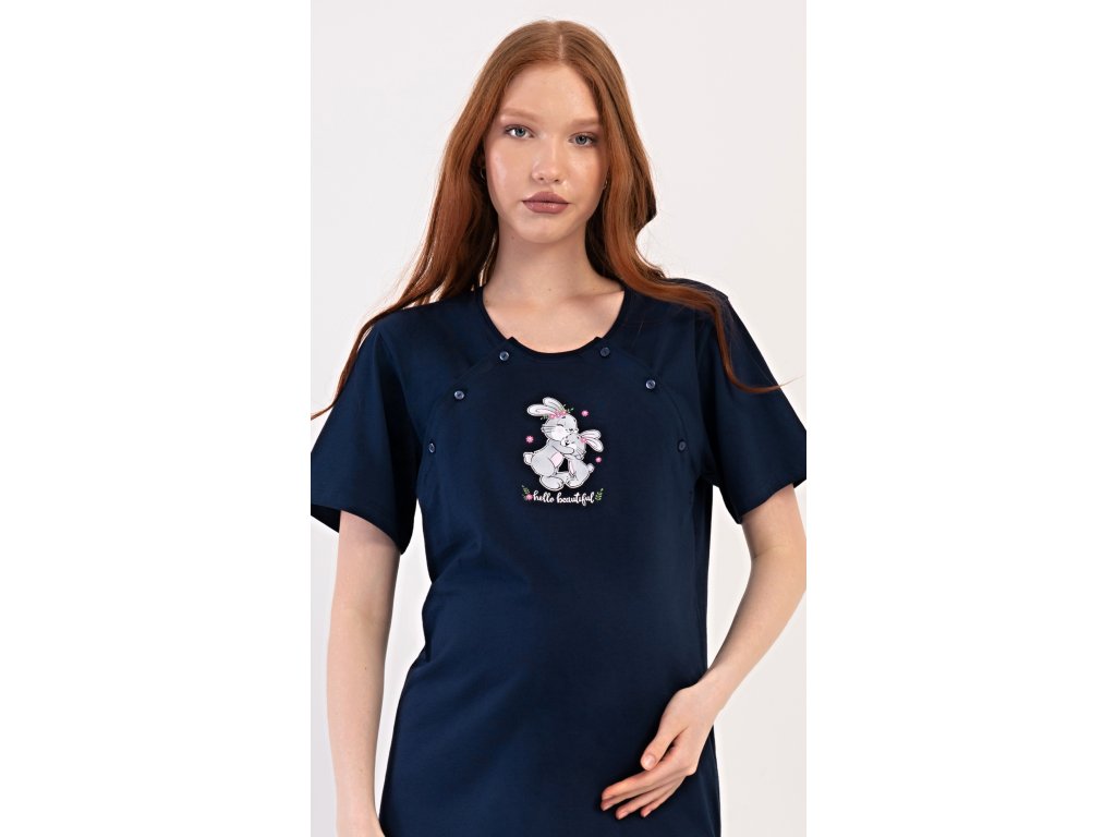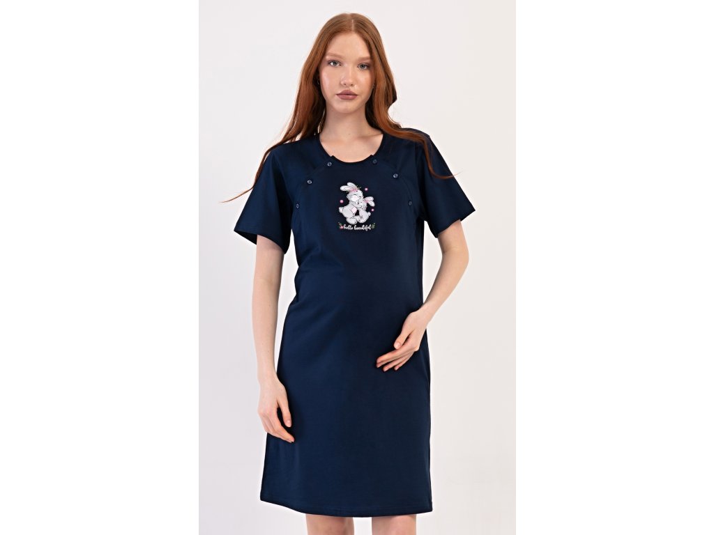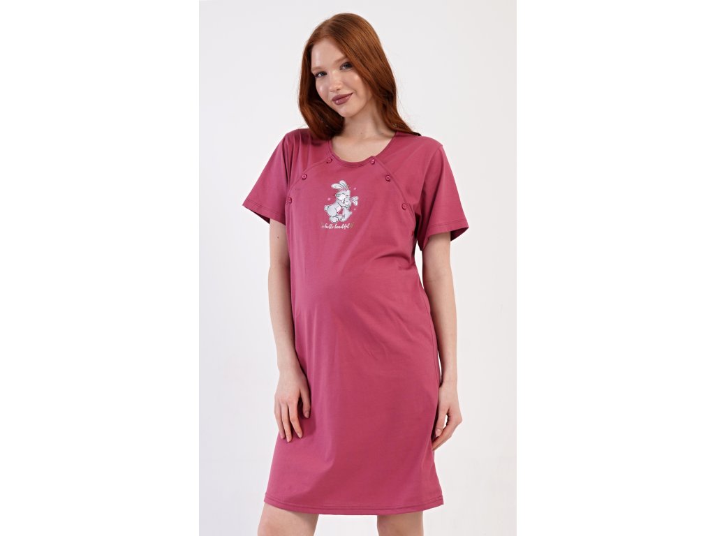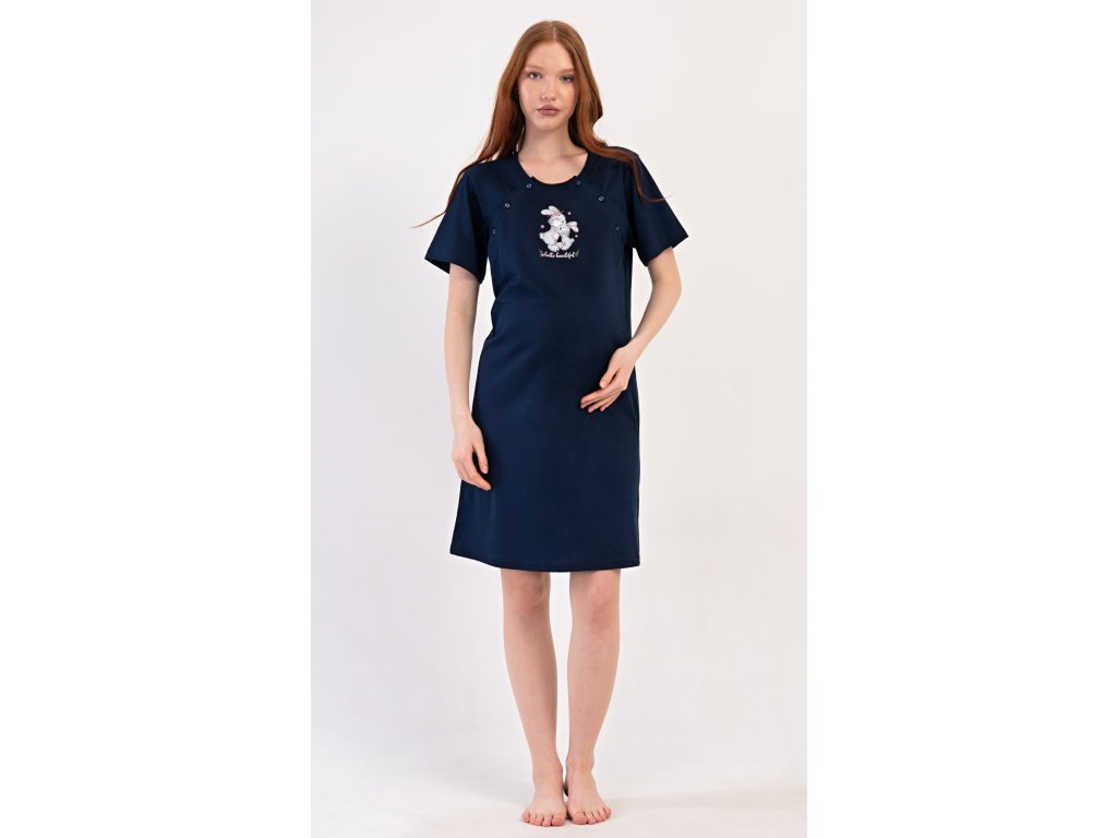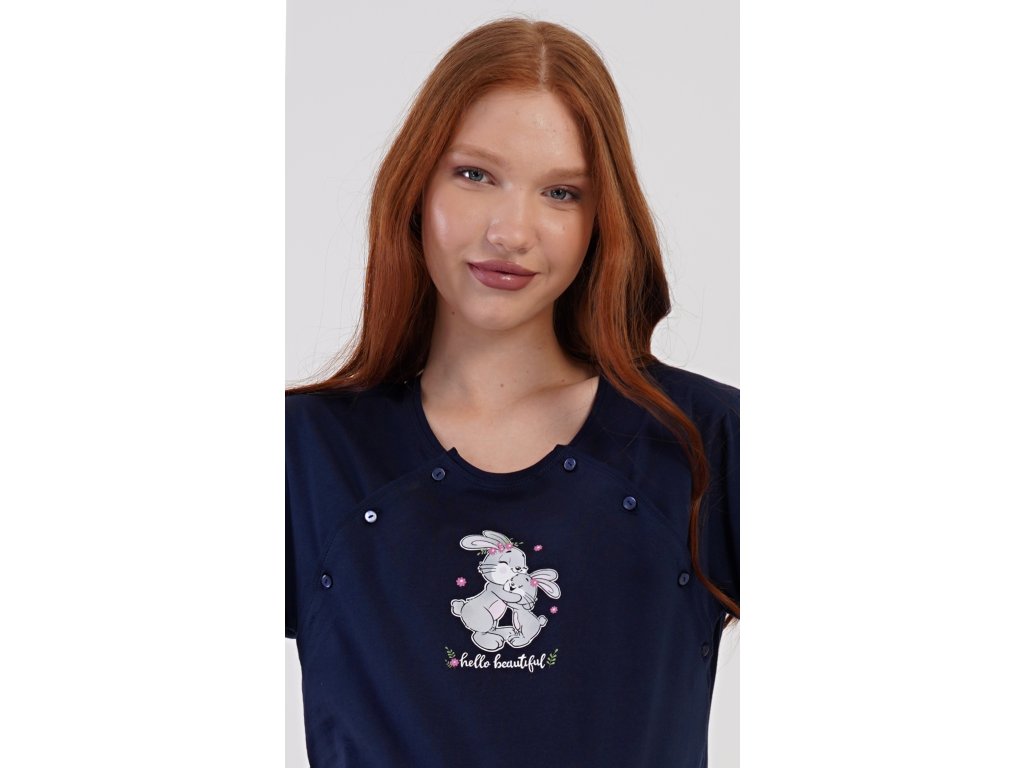 Dámská bavlněná mateřská noční košile Zajíčci. Noční košile je svým střihem určená na dobu těhotenství, do porodnice i ke kojení. Ke kojení slouží průstřihy po stranách košile, které jsou uzavíratelné na knoflíky. Přední díl košile zdobí obrázek veselých zajíčků. Použitý materiál s podílem bavlny 100% je příjemný a poddajný na dotek.