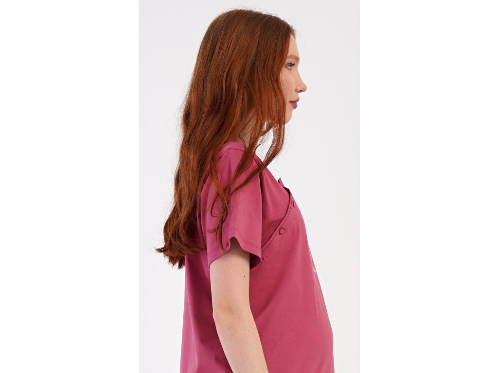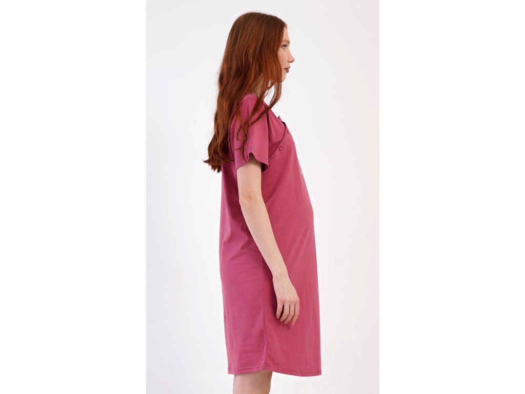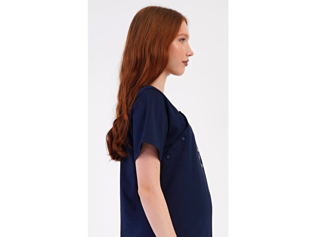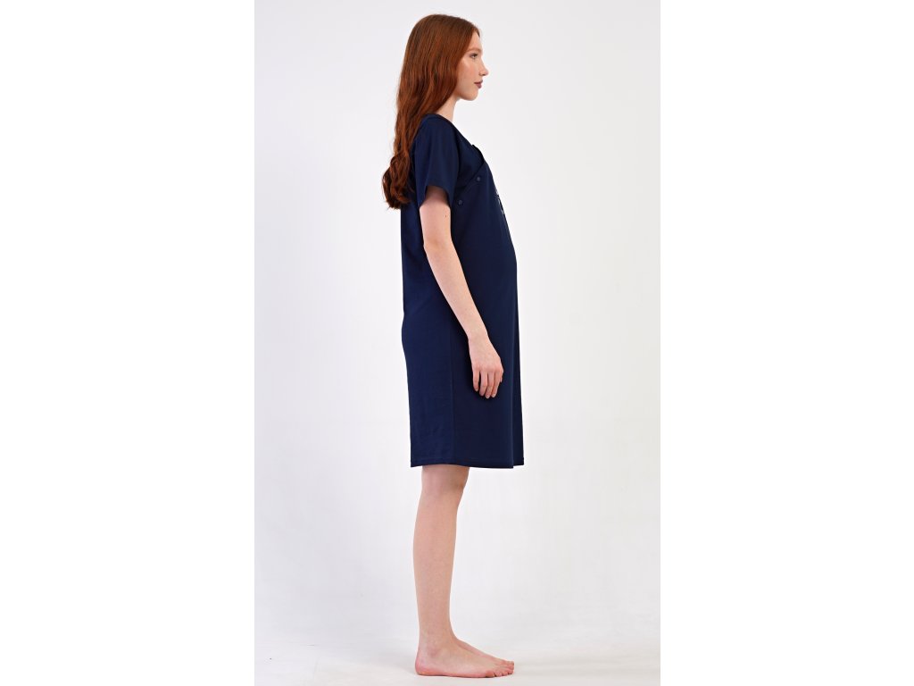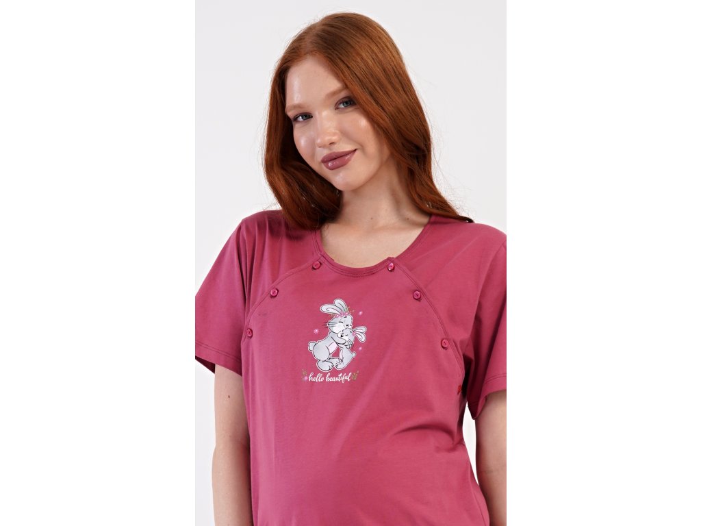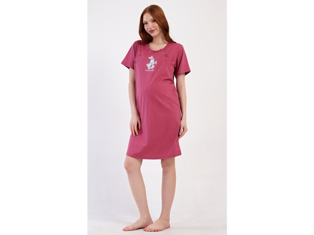 Dámská bavlněná mateřská noční košile Zajíčci. Noční košile je svým střihem určená na dobu těhotenství, do porodnice i ke kojení. Ke kojení slouží průstřihy po stranách košile, které jsou uzavíratelné na knoflíky. Přední díl košile zdobí obrázek veselých zajíčků. Použitý materiál s podílem bavlny 100% je příjemný a poddajný na dotek.