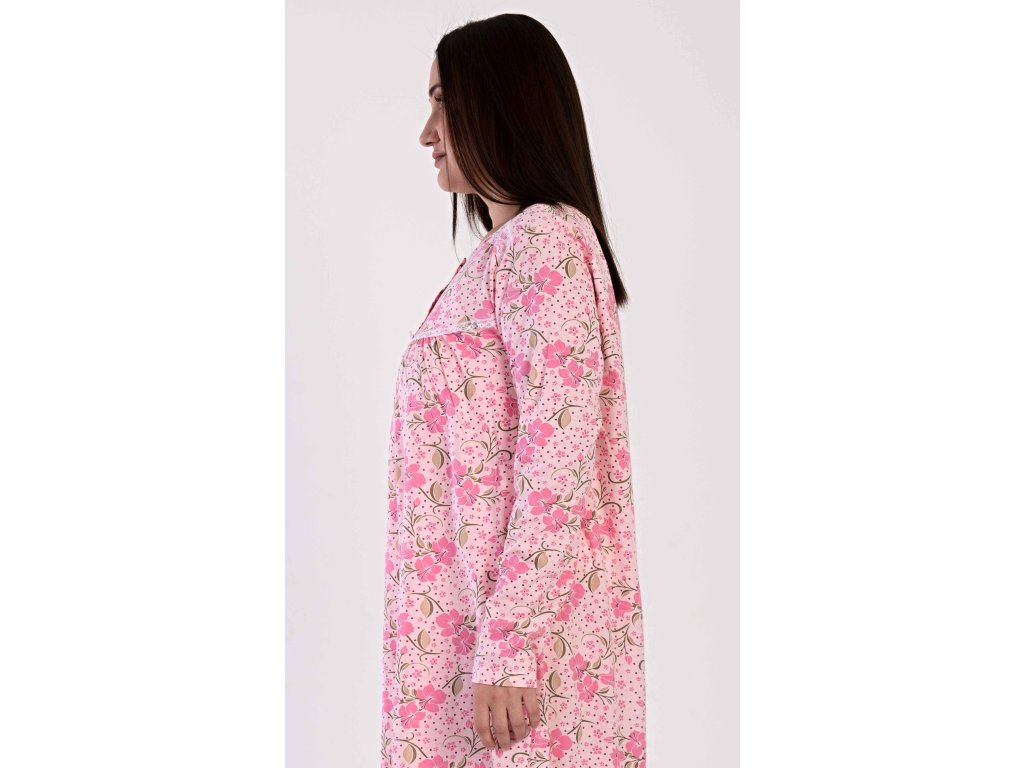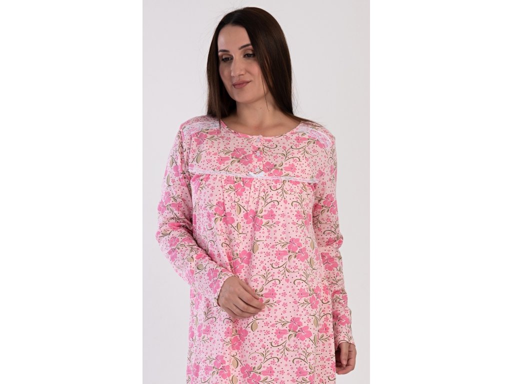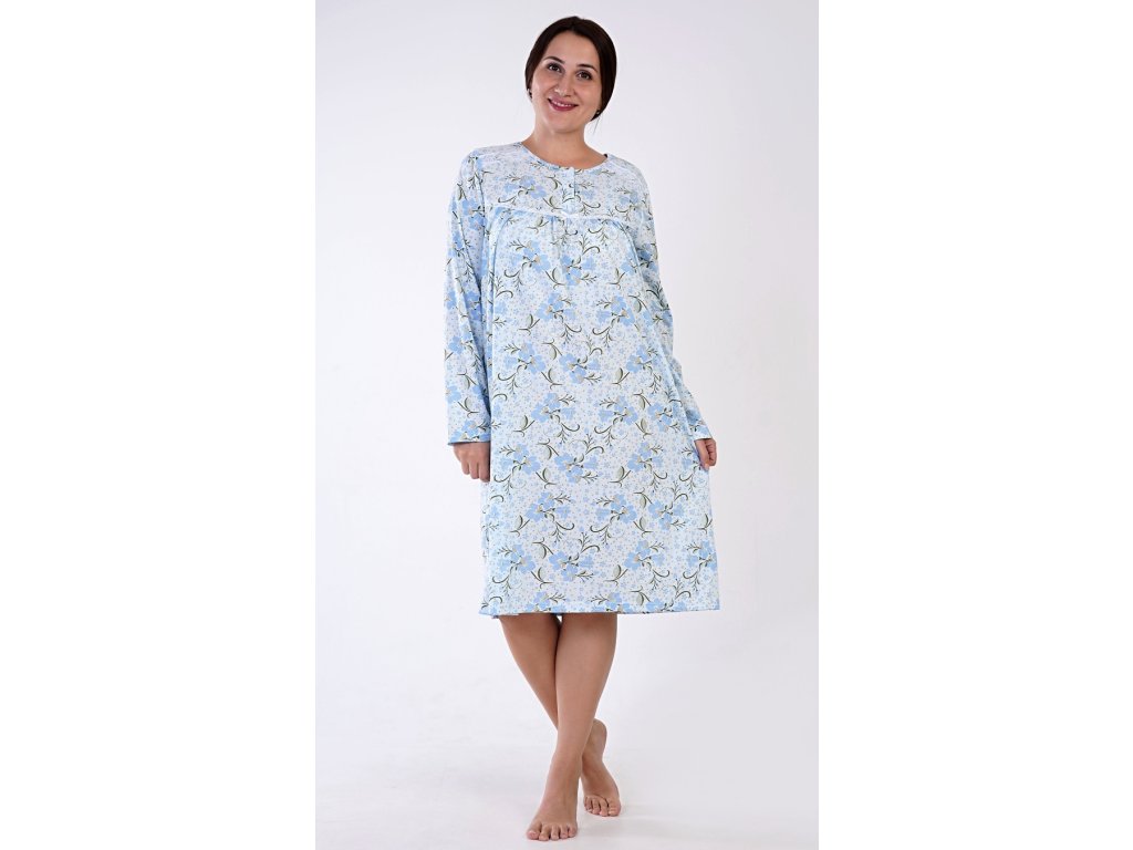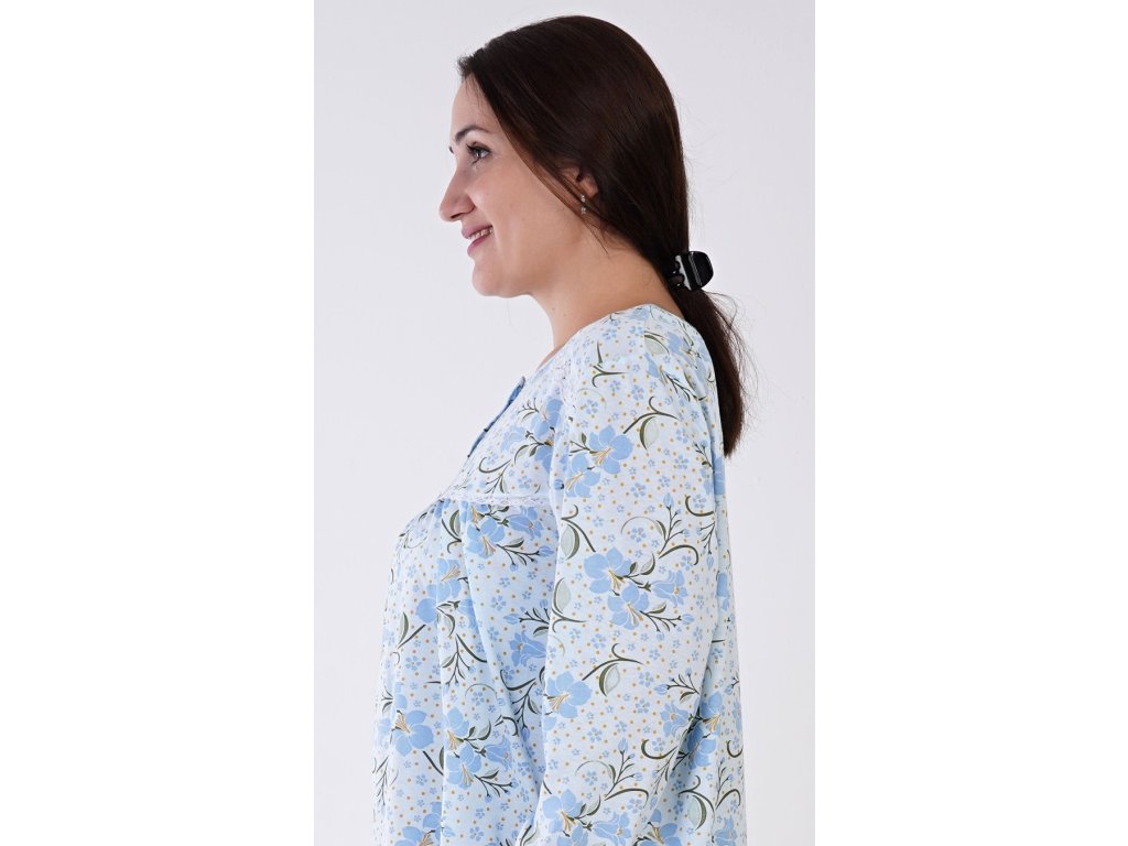 Dámská bavlněná noční košile s dlouhým rukávem Estela. Klasická dámská noční košile pro všechny milovnice starých časů a pohodlí v příjemné délce do půli lýtek. Látka košile je potištěna květy, ozvláštněna krajkou a krátkou légou se třemi knoflíčky. Použitý materiál s podílem bavlny 100% je příjemný a poddajný na dotek.