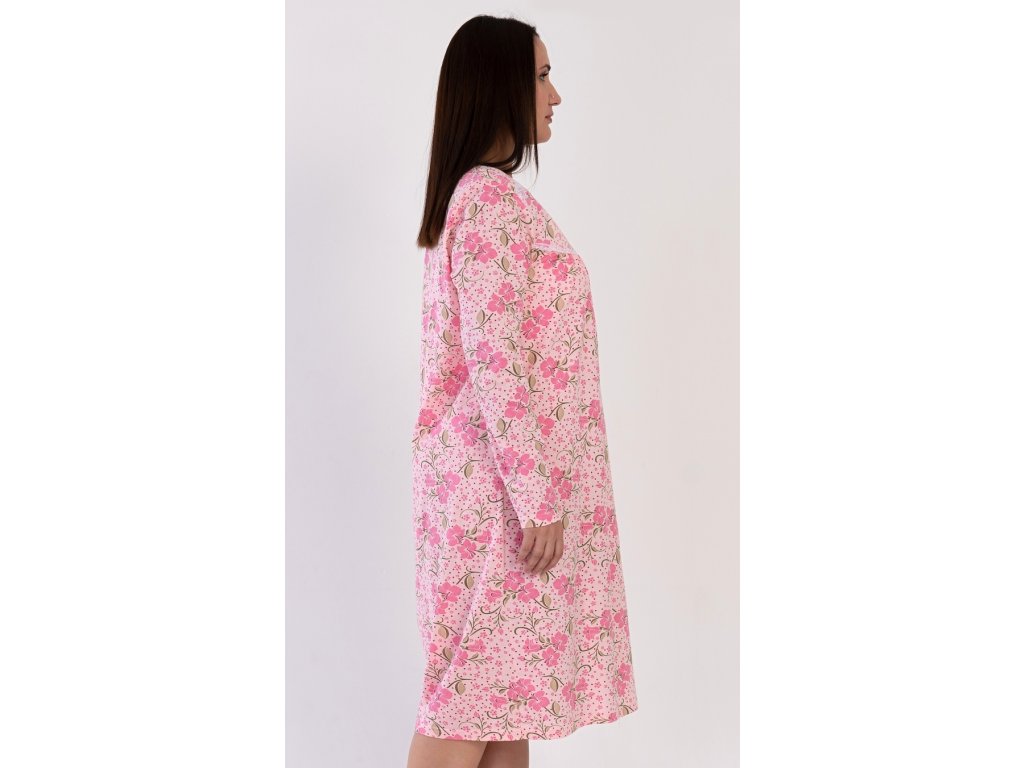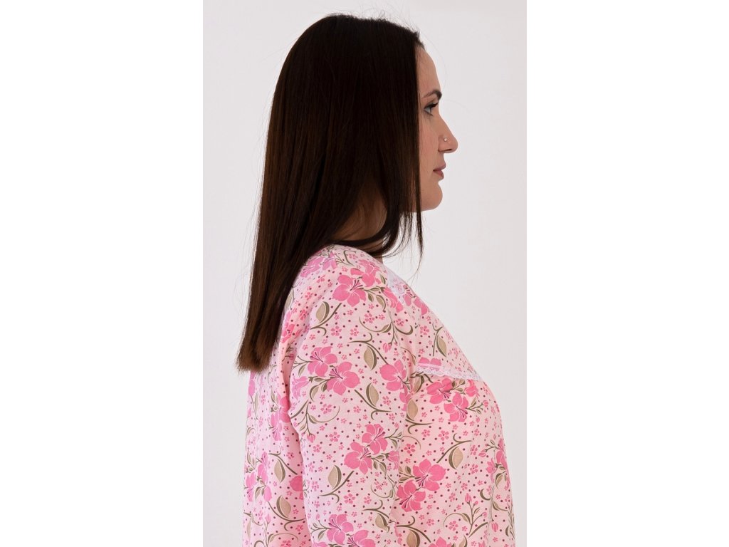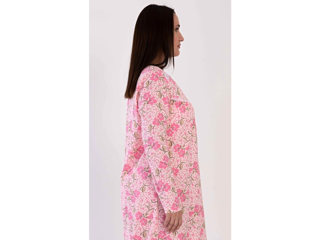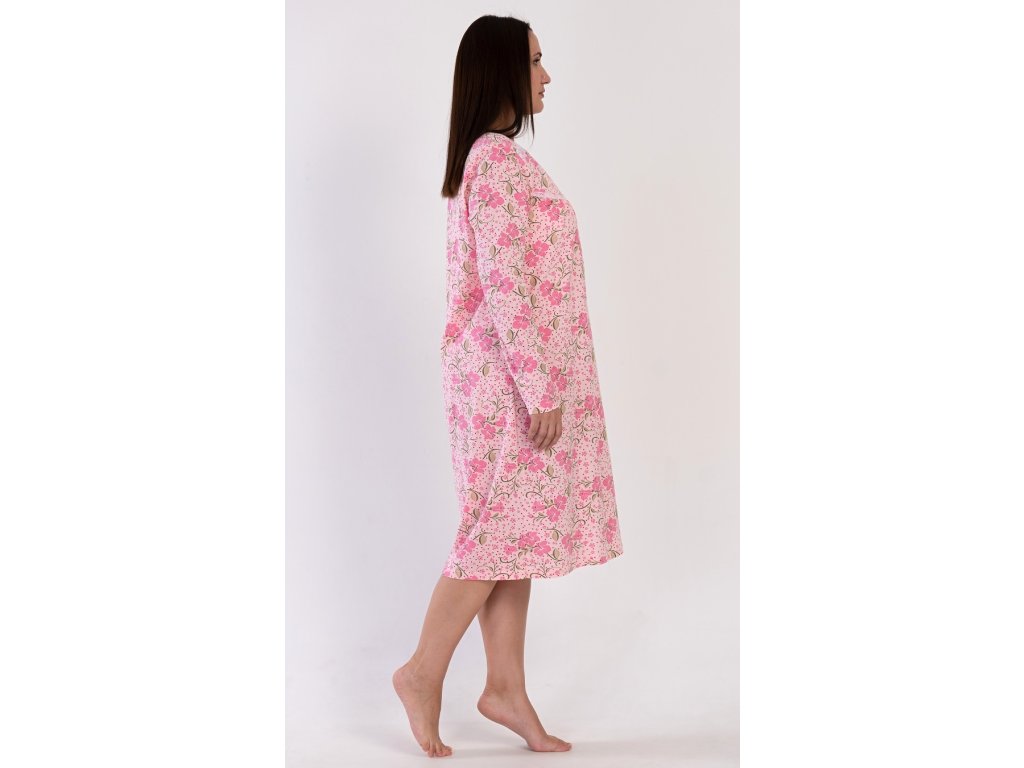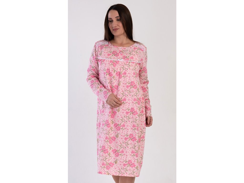 Dámská bavlněná noční košile s dlouhým rukávem Estela. Klasická dámská noční košile pro všechny milovnice starých časů a pohodlí v příjemné délce do půli lýtek. Látka košile je potištěna květy, ozvláštněna krajkou a krátkou légou se třemi knoflíčky. Použitý materiál s podílem bavlny 100% je příjemný a poddajný na dotek.