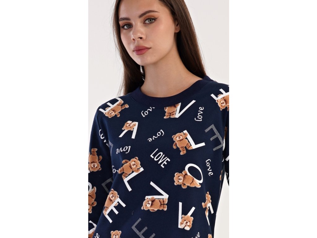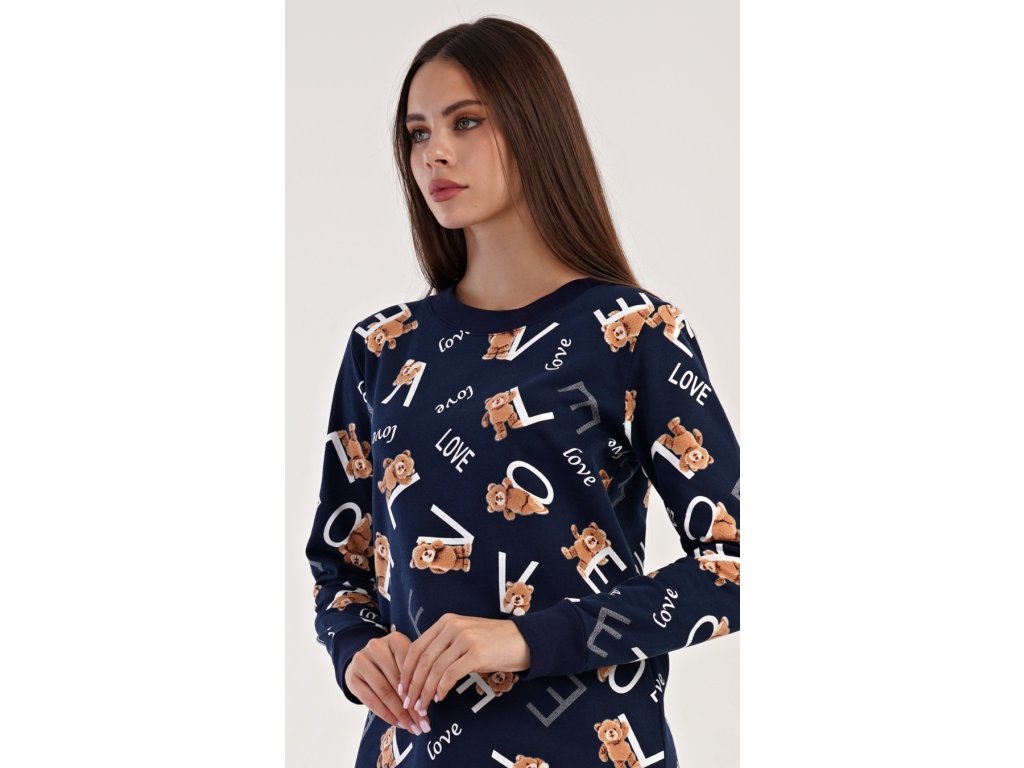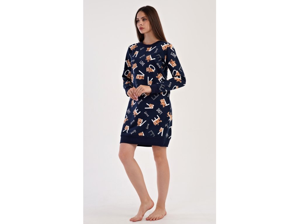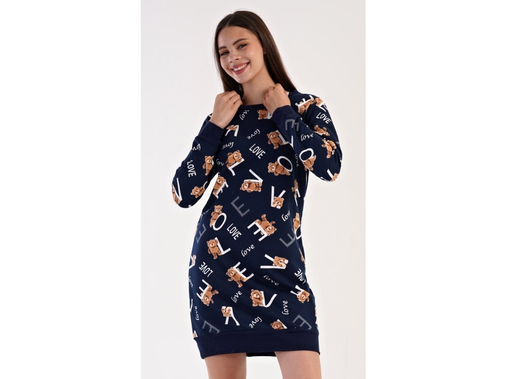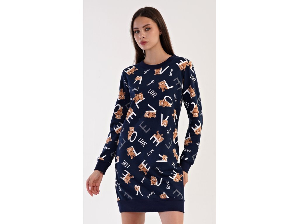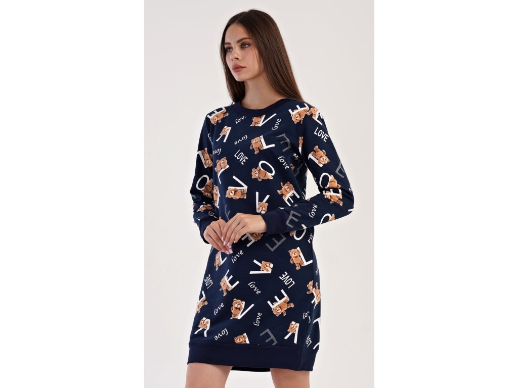 Dámská bavlněná noční košile s dlouhým rukávem Méďa. Silnější oteplený materiál je potištěný obrázky pyšových medvídků a nápisy LOVE. Rukávy a spodní lem jsou zakončeny pantem. Košile je vhodná i na denní nošení jako domácí šaty. Doplněnou o legíny ji oceníte v chladnějších dnech.