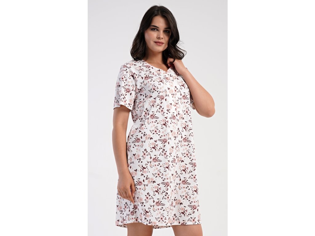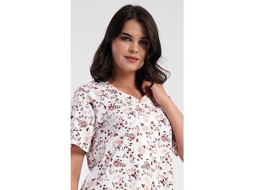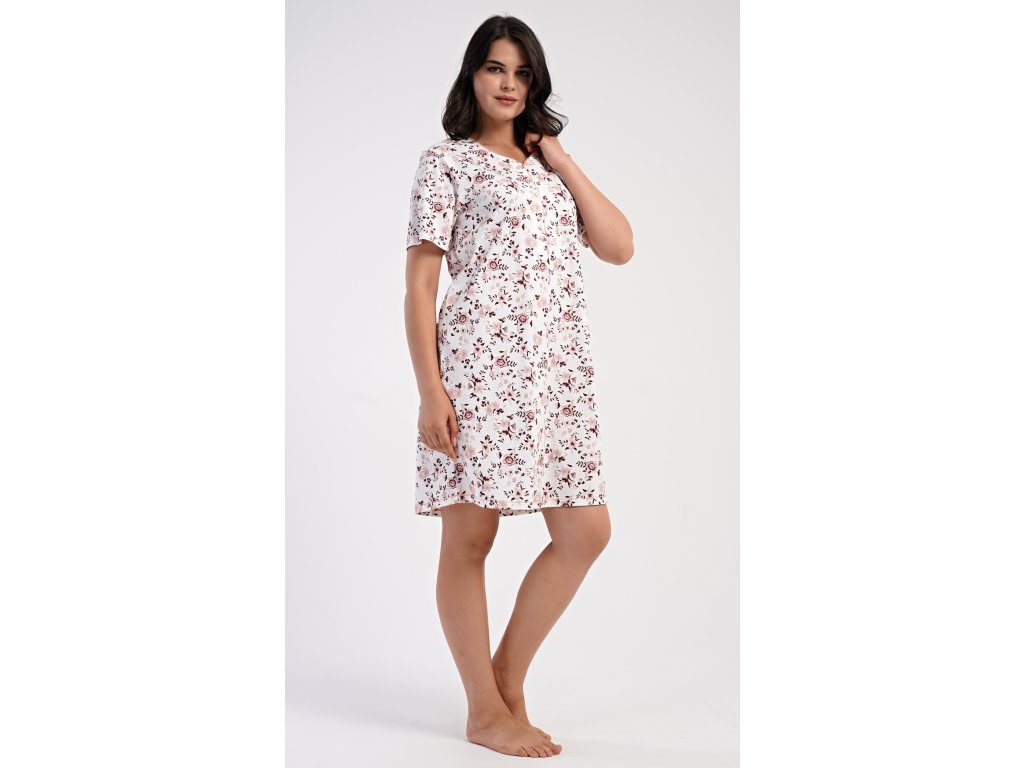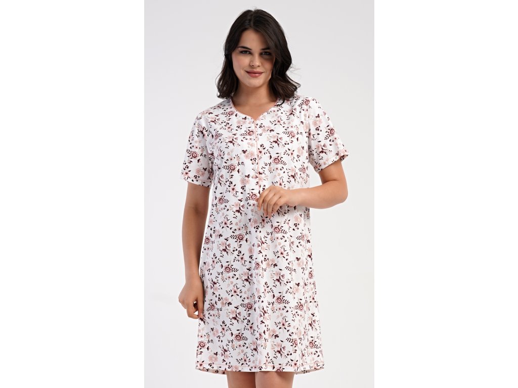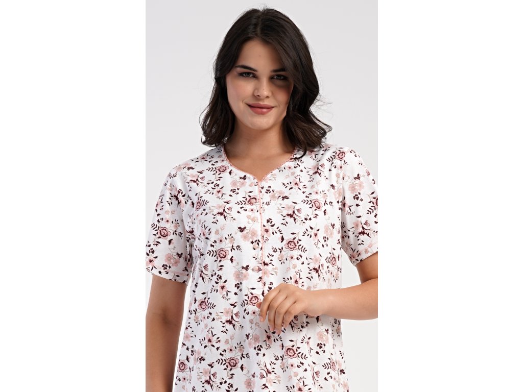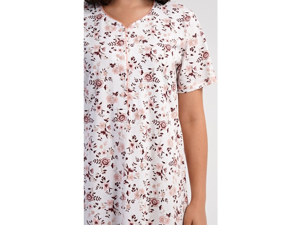 Dámská bavlněná noční košile s krátkým rukávem Růže. Dámská noční košile má příjemnou délkou po kolena a delší légu s pěti knoflíky. Košile s krátkým rukávem je potištěna růžemi v lososové barvě. Použitý materiál s podílem bavlny 100% je příjemný a poddajný na dotek.