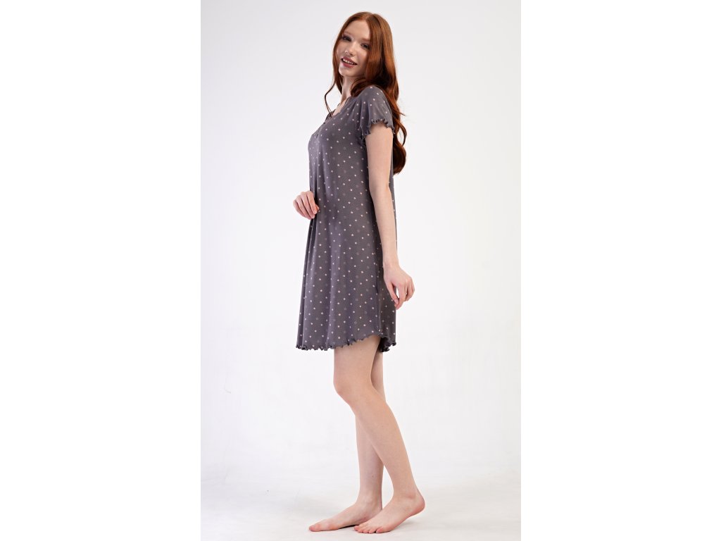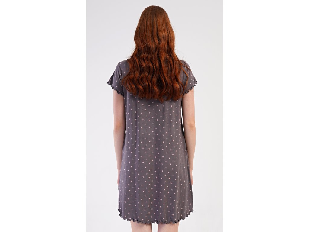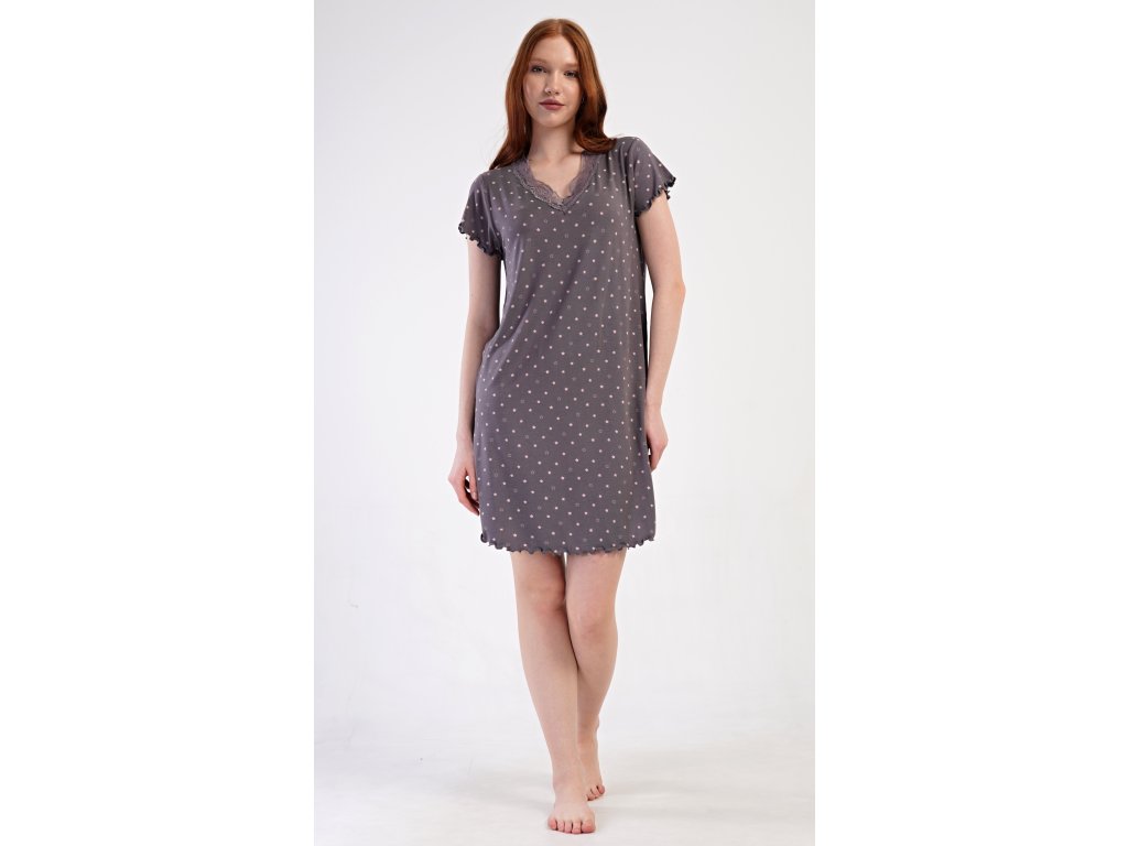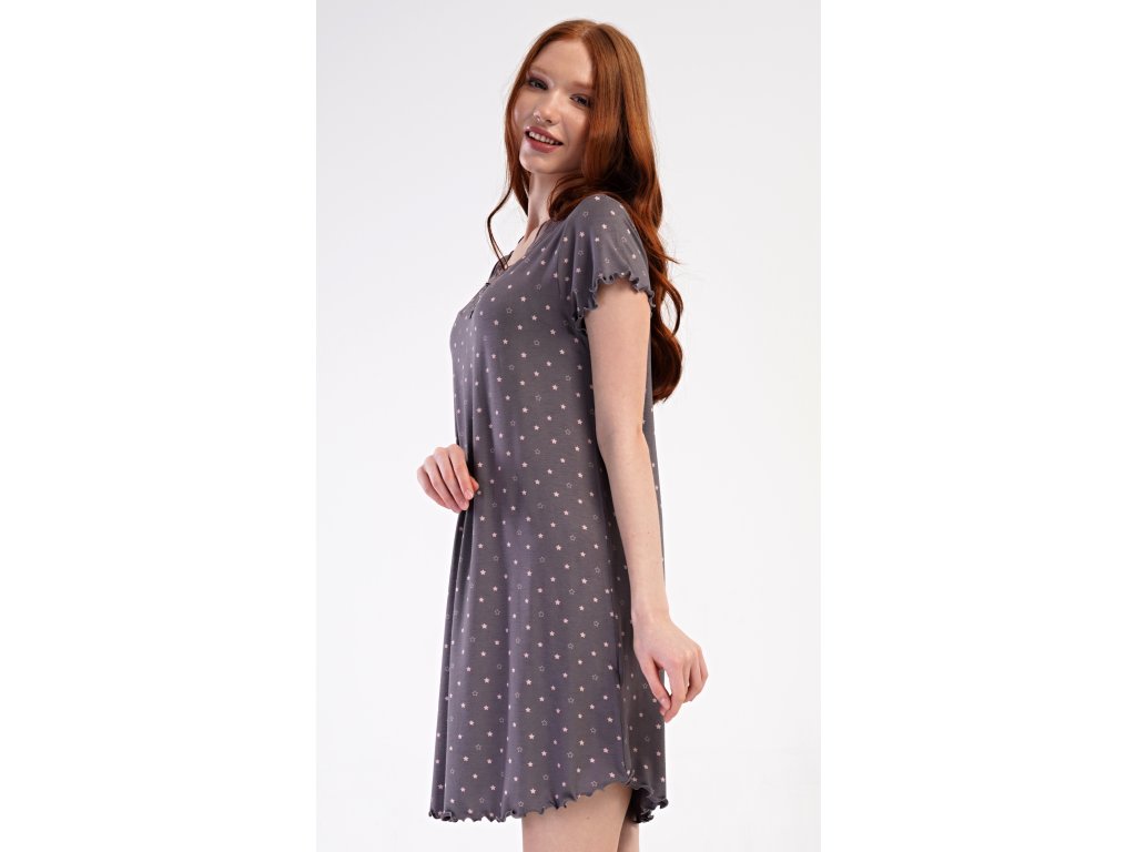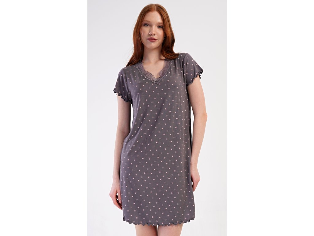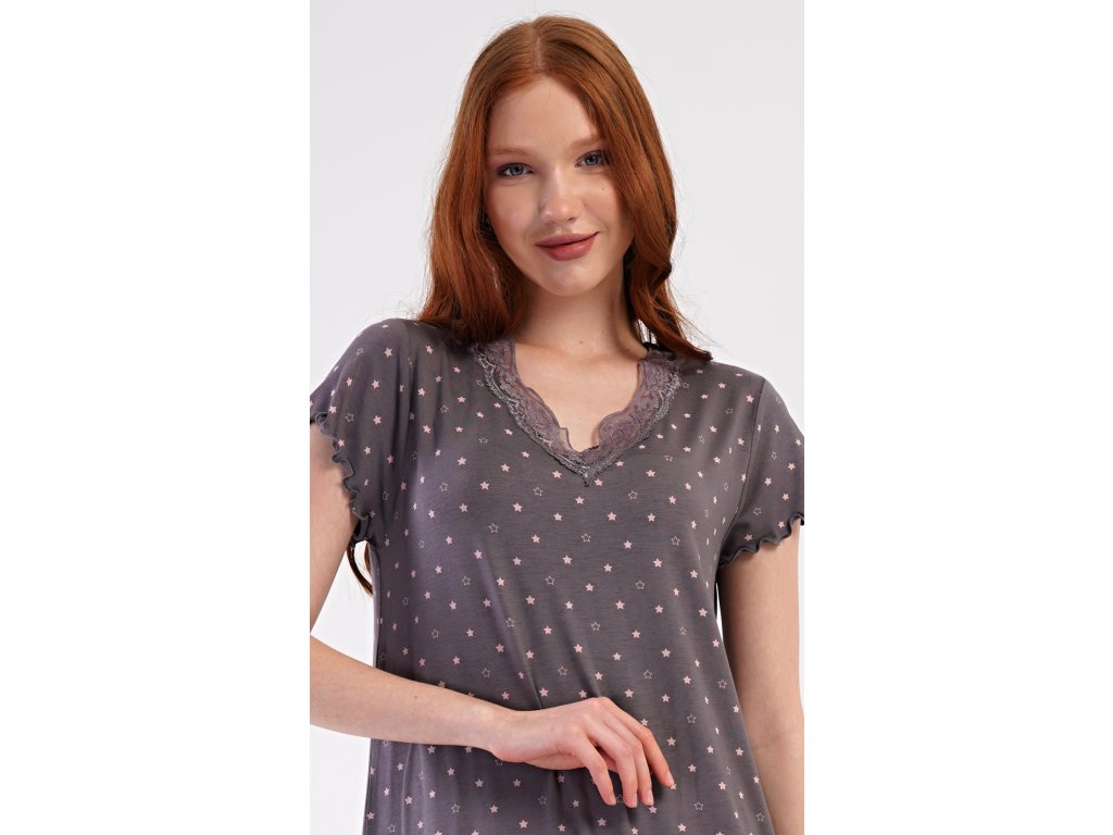 Dámská noční košile s krátkým rukávem Samanta. Noční košile má příjemnou délkou nad kolena a ozdobné žlábkování okolo rukávů a spodního lemu. Výstřih je ozvláštněn jemnou krajkou. Košile s krátkým rukávem je potištěna hvězdičkami. Použitý materiál ze směsi viskózy a lycry je příjemný a poddajný na dotek.