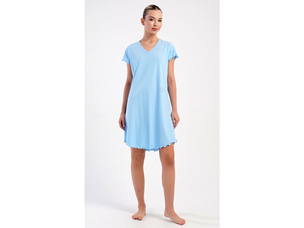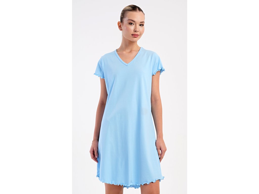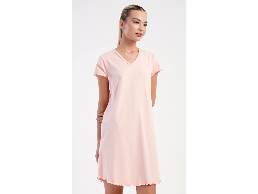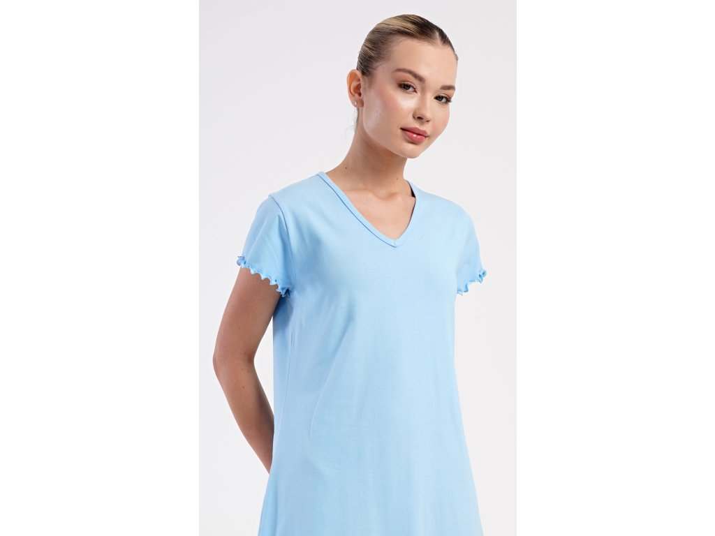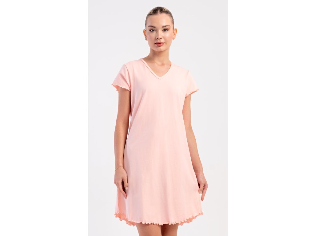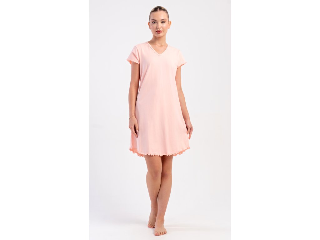 Dámská bavlněná noční košile s krátkým rukávem Sandra. Košile má příjemnou délkou nad kolena a výstřih do V, je ozdobena žlábkováním na rukávech a spodním lemu. Použitý materiál s podílem bavlny 95% je příjemný a poddajný na dotek.