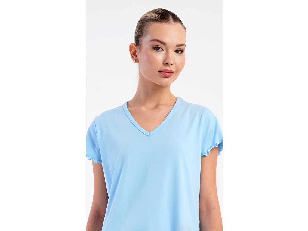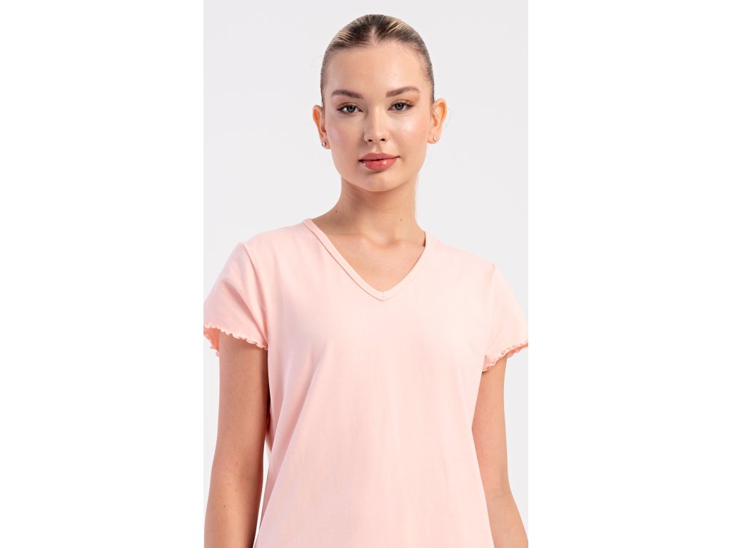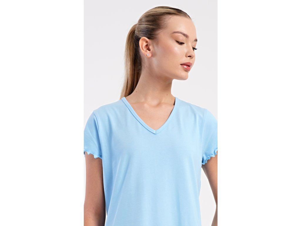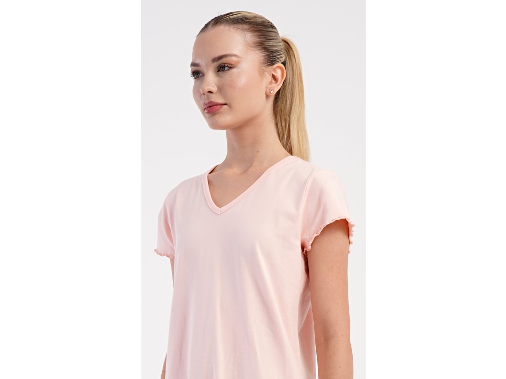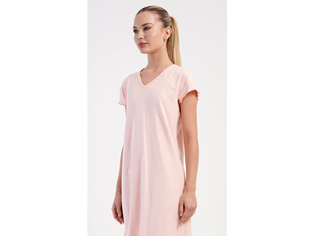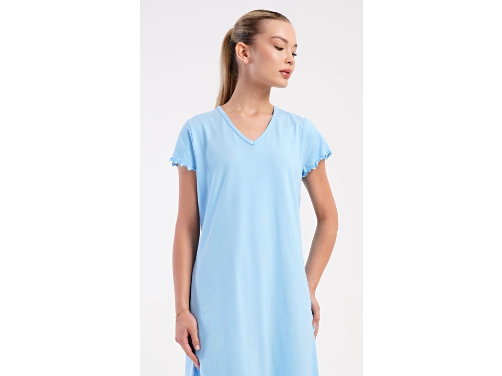 Dámská bavlněná noční košile s krátkým rukávem Sandra. Košile má příjemnou délkou nad kolena a výstřih do V, je ozdobena žlábkováním na rukávech a spodním lemu. Použitý materiál s podílem bavlny 95% je příjemný a poddajný na dotek.