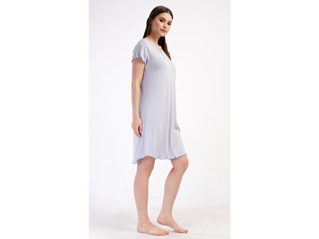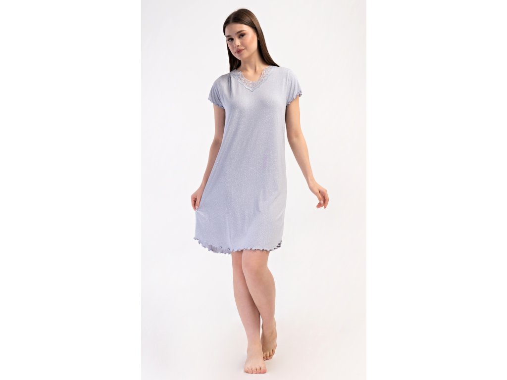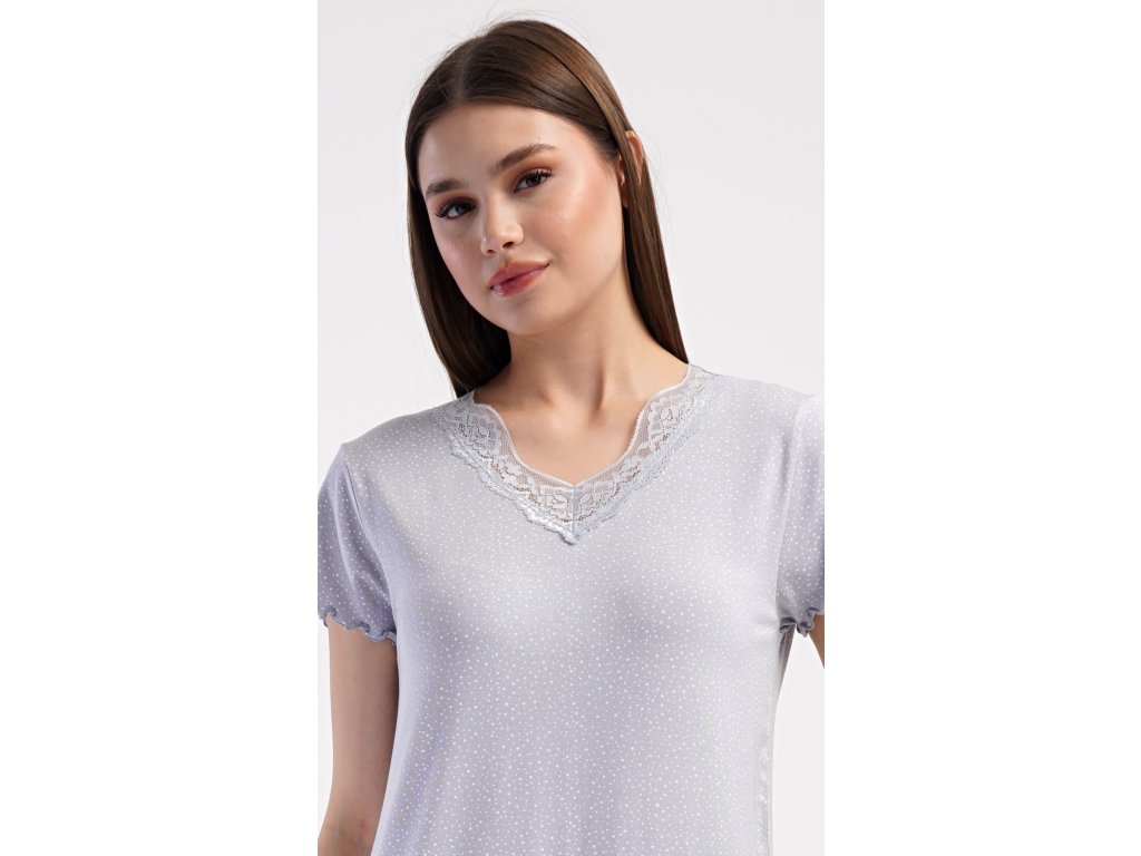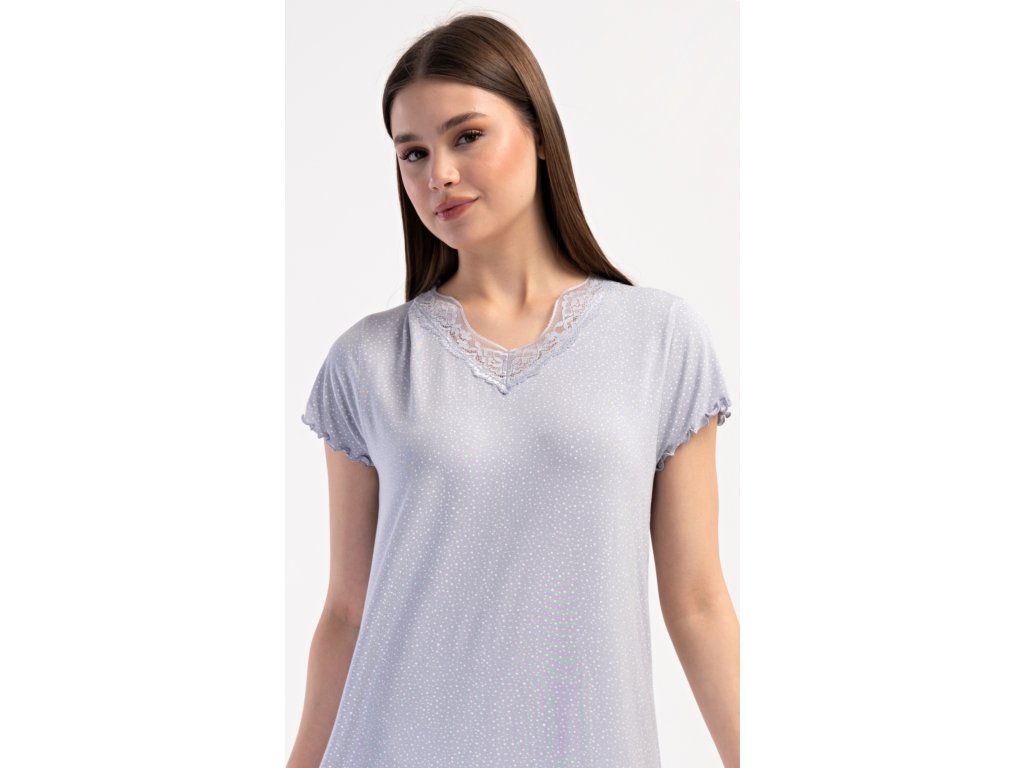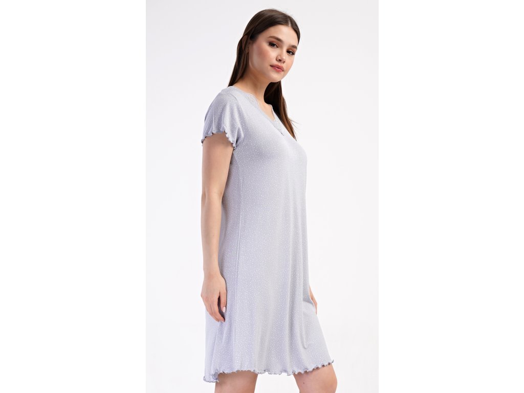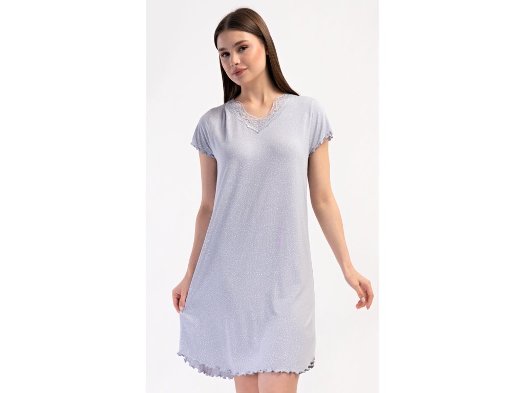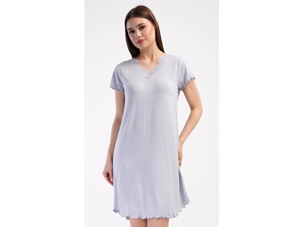 Dámská noční košile s krátkým rukávem Vločka. Noční košile s příjemnou délkou po kolena má žlábkování na rukávech a spodním lemu, výstřih je ozdoben krajkou. Na látce košile jsou natištěny drobné puntíky. Použitý viskózový materiál s příměsí lycry je příjemný a poddajný na dotek.