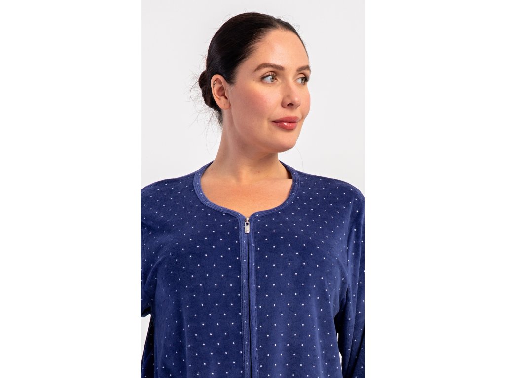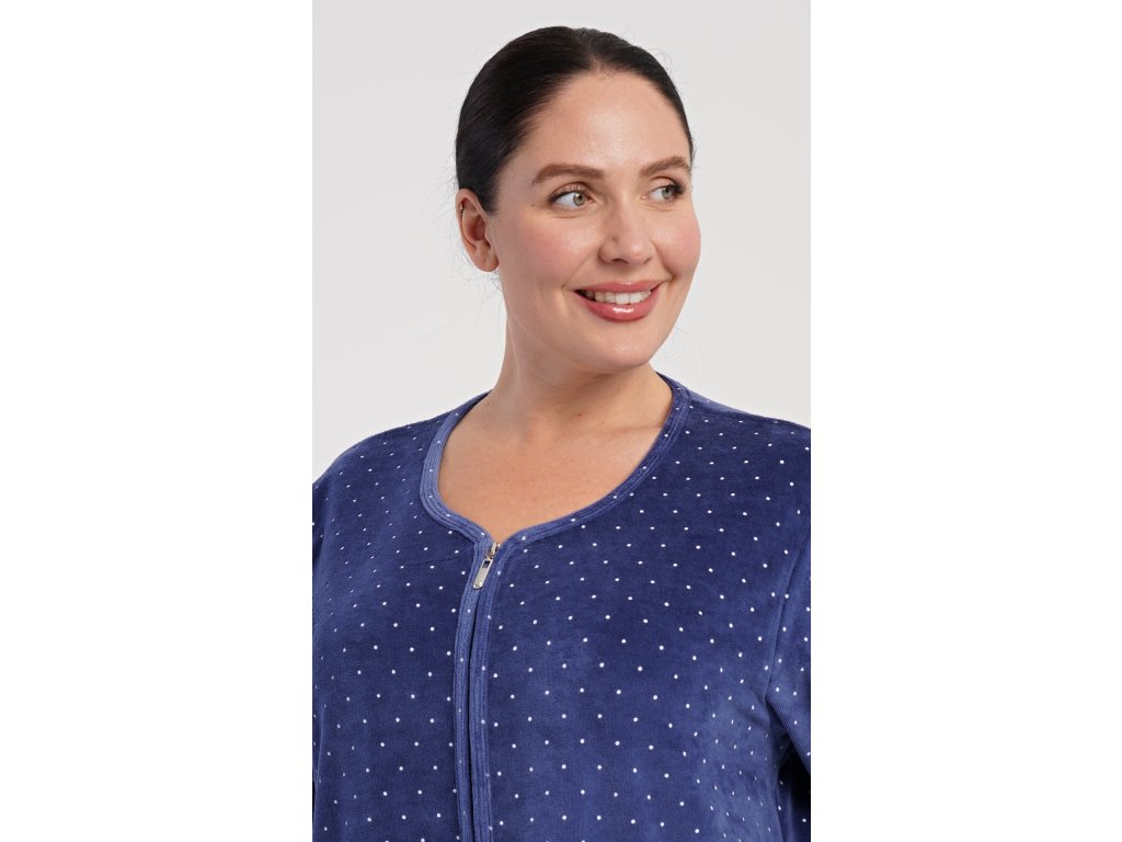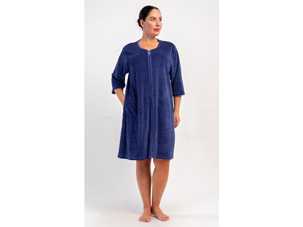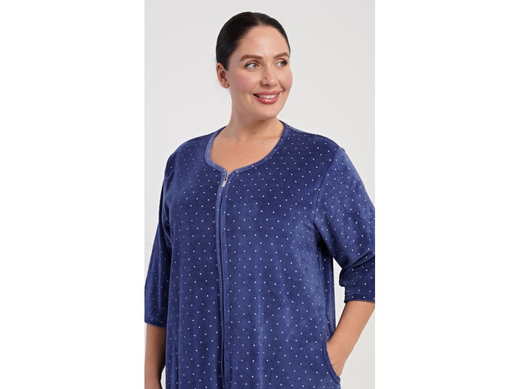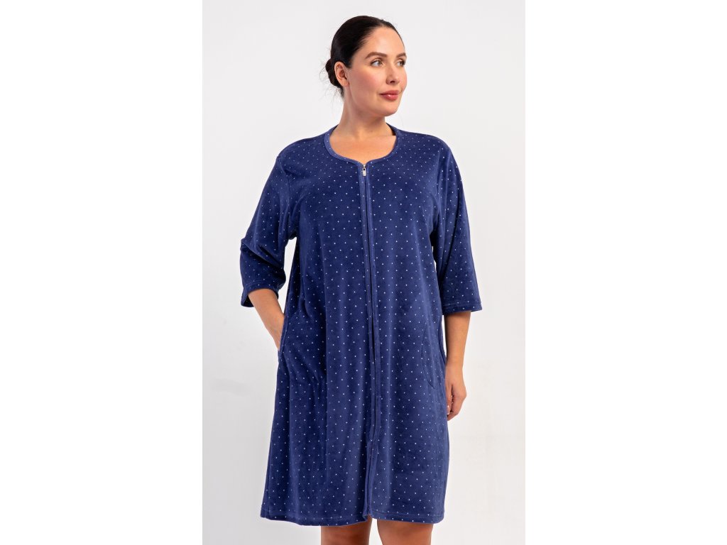 Dámské sametové domácí šaty s tříčtvrtečním rukávem Alex. Pohodlné rozepínací šaty v příjemné délce pod kolena využijete téměř při všech volnočasových aktivitách. Mají praktické kapsy a zapínání na zip. Použitý velurový materiál s obsahem bavlny 80% je příjemný a poddajný na dotek.