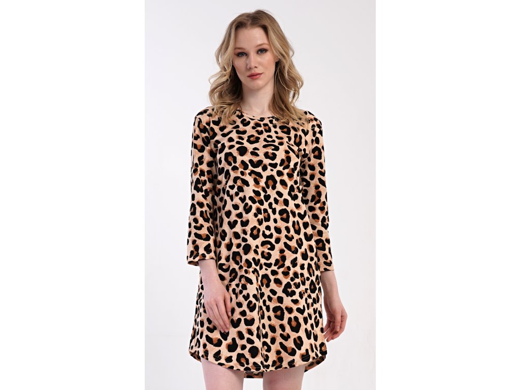 Dámské bavlněné domácí šaty s tříčtvrtečním rukávem Leona. Domácí bavlněné šaty s kulatým výstřihem a kapsami zdobí obrázky leopardí potisk. Použitý bavlněný materiál je příjemný a poddajný na dotek. Pohodlné domácí šaty jsou vhodné také na spaní.