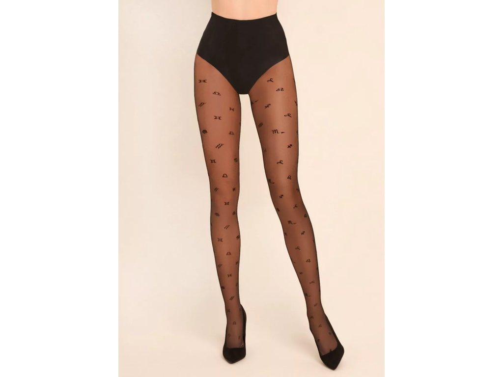 Dámské punčochové kalhoty Zodiac zdobené vzorem znamení zvěrokruhu po celé délce nohavic. Absence oddělené kalhotkové části, neviditelná výztuha na prstech a bavlněný klín s plochým švem zaručují pohodlí a komfort při nošení. Díky šití plochým švem nevynikají ani pod upnutým oblečením. Nevyditelná výztuha na prstech dělá punčochové kalhoty odolnější vůči poškození. Dvojité spletené polyamidové vlákno použité u tohoto modelu je díky své jemné, husté struktuře velmi měkké a sametové na dotek a zároveň činí punčochové kalhoty trvanlivějšími a odolnějšími proti obláčkům.