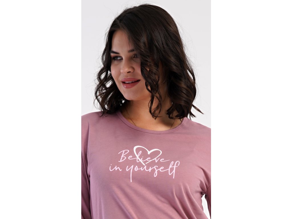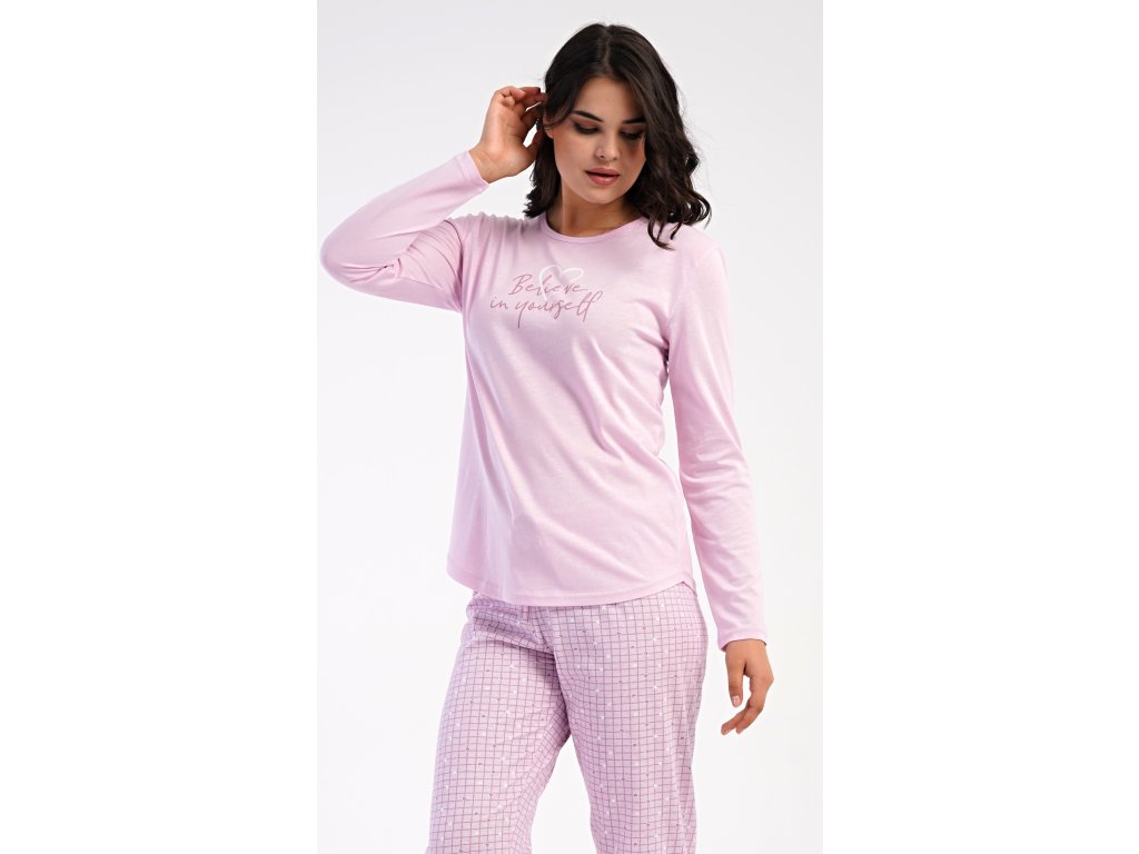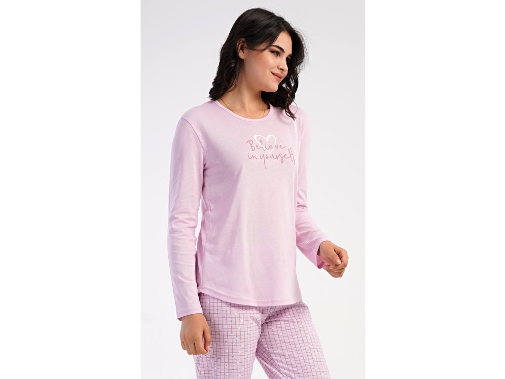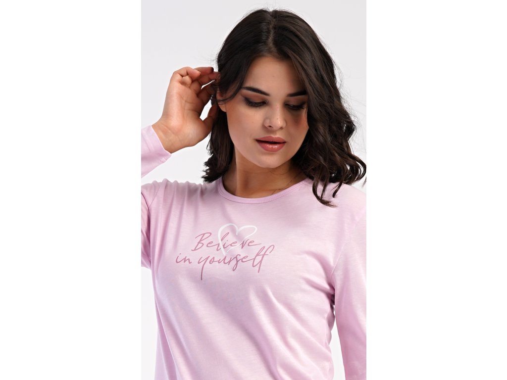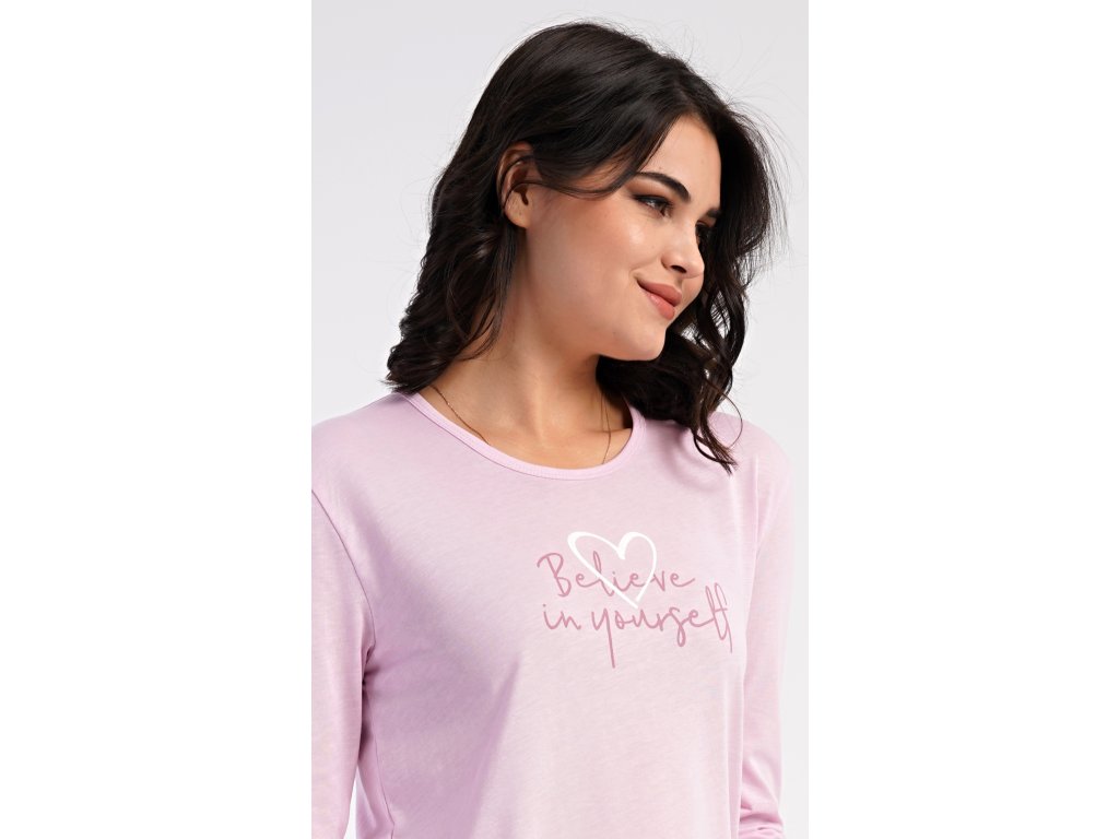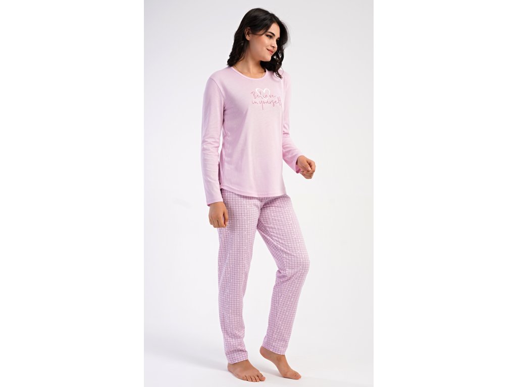 Dámské bavlněné dlouhé pyžamo Believe. Dámské pyžamo se skládá z trika s dlouhým rukávem a dlouhých kalhot. Jednobarevné triko je ozdobeno motivačním nápisem. Kalhoty potištěné srdíčky mají v pase gumu a šňůrku na stažení, nemají kapsy. Použitý bavlněný materiál je poddajný a příjemný na dotek.