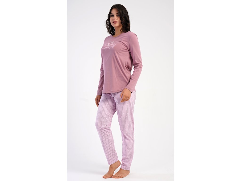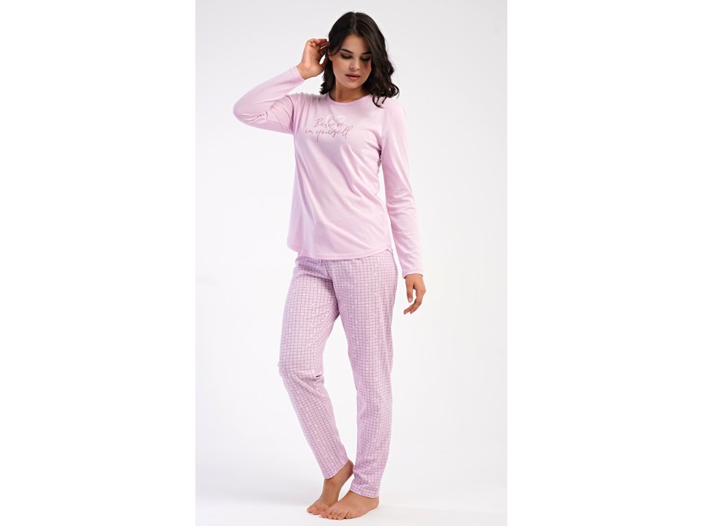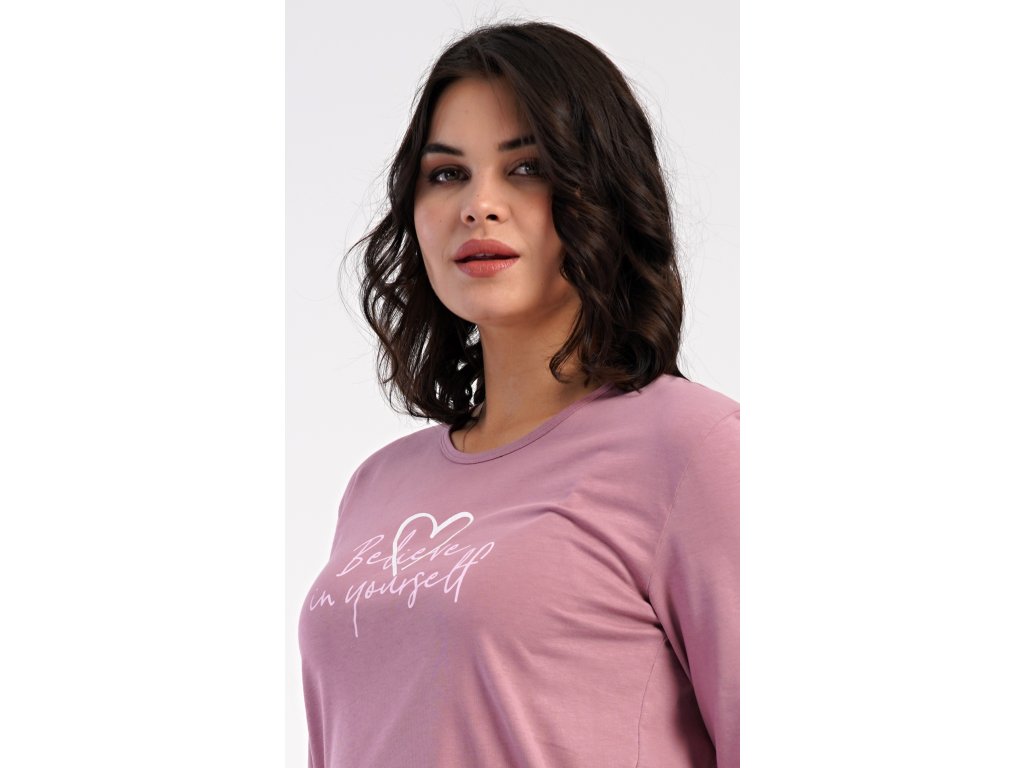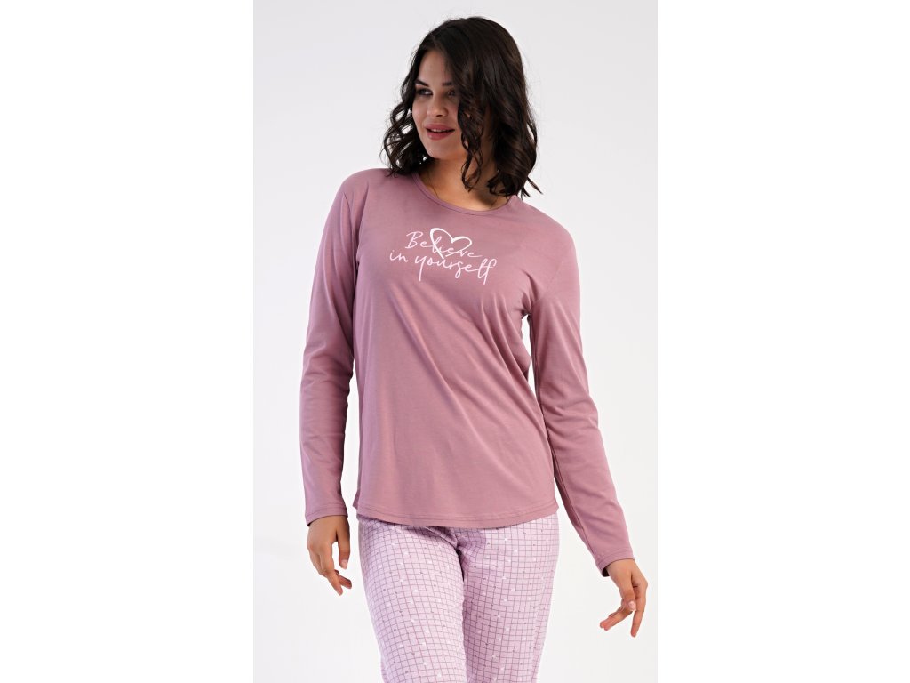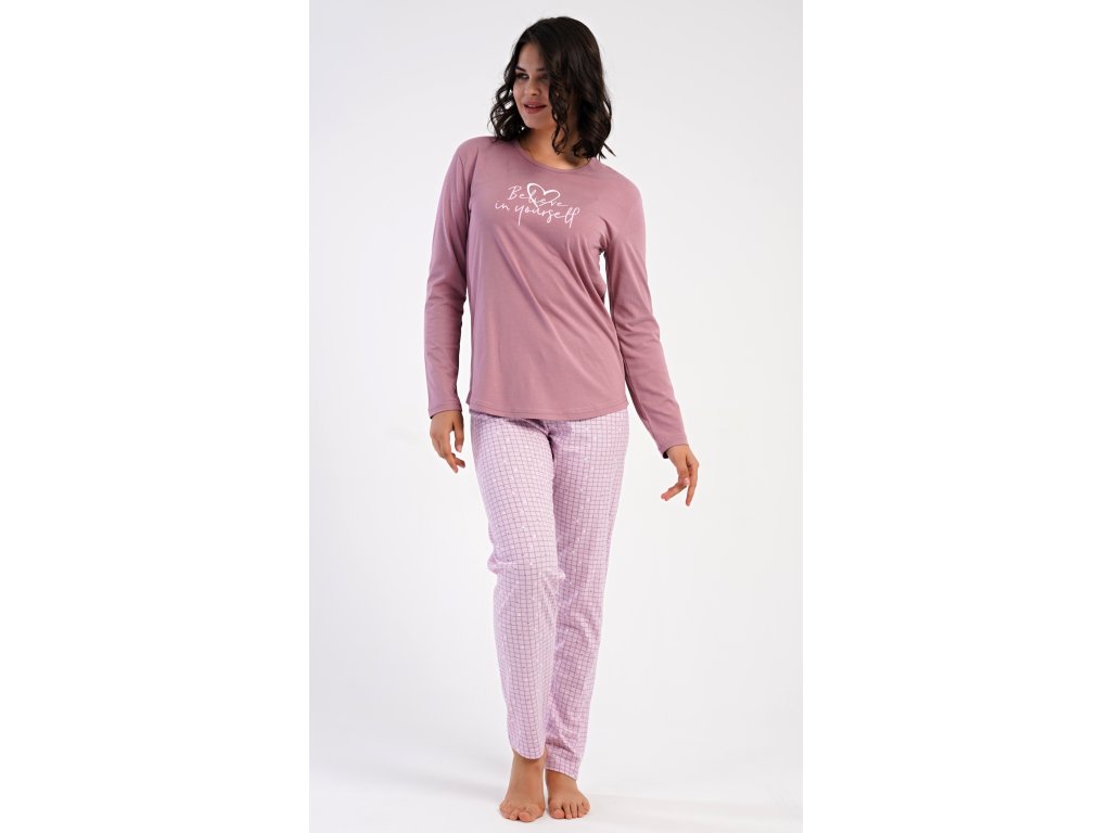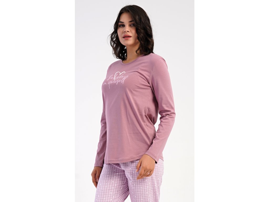 Dámské bavlněné dlouhé pyžamo Believe. Dámské pyžamo se skládá z trika s dlouhým rukávem a dlouhých kalhot. Jednobarevné triko je ozdobeno motivačním nápisem. Kalhoty potištěné srdíčky mají v pase gumu a šňůrku na stažení, nemají kapsy. Použitý bavlněný materiál je poddajný a příjemný na dotek.