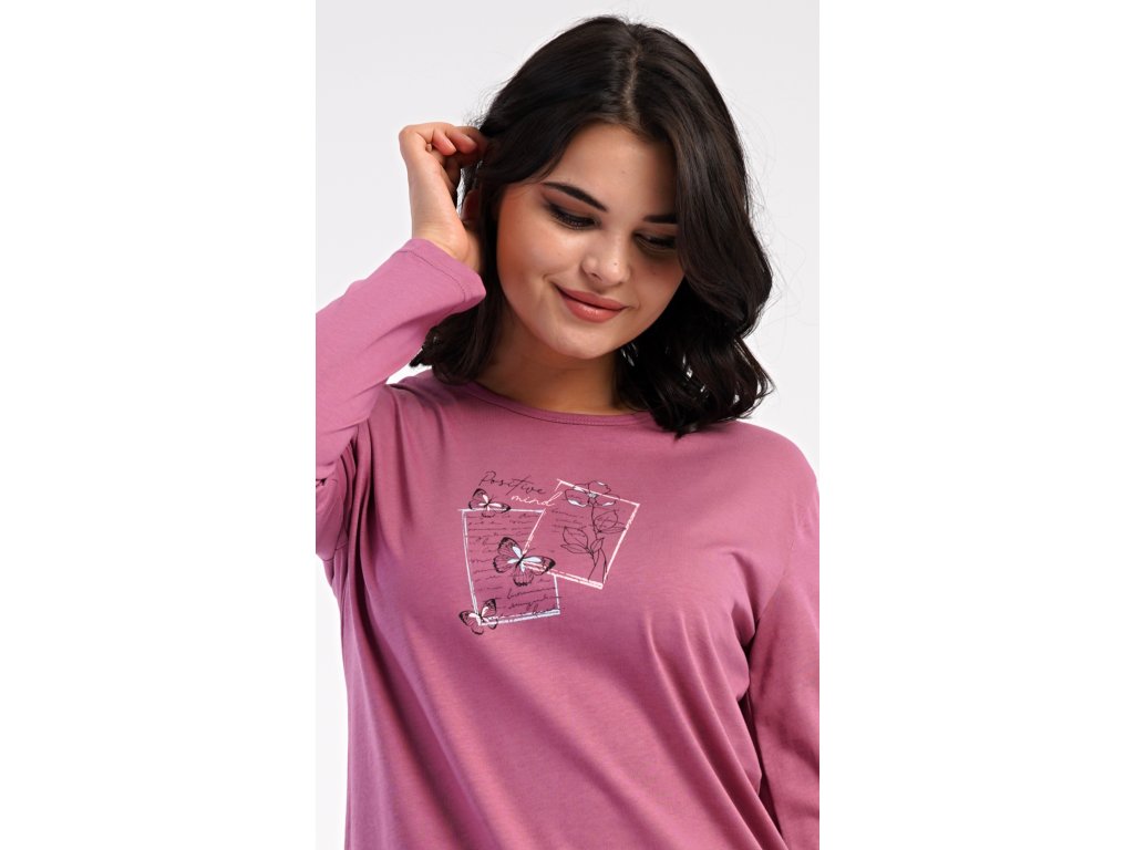 Dámské bavlněné dlouhé pyžamo Charlotte. Dámské pyžamo se skládá z trika s dlouhým rukávem a dlouhých kalhot. Jednobarevné triko s kulatým výstřihem zdobí na hrudi motýlci. Kárované kalhoty mají v pase gumu a šňůrku na stažení, nemají kapsy. Použitý bavlněný materiál je poddajný a příjemný na dotek.