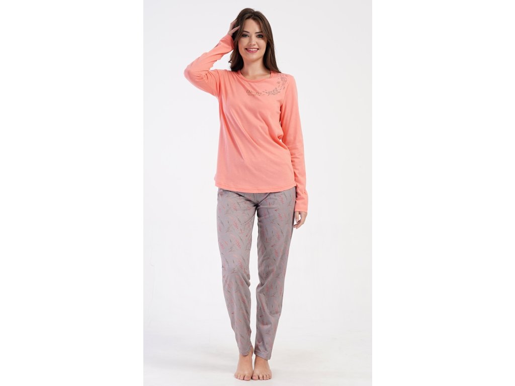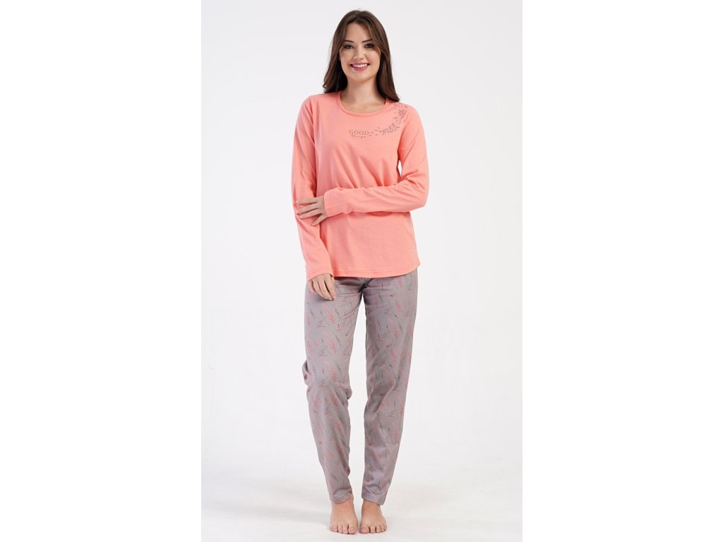 Dámské bavlněné dlouhé pyžamo Good things. Dámské pyžamo se skládá z trika s dlouhým rukávem a dlouhých kalhot. Triko je jednobarevné, zdobené menším obrázkem a nápisem 'Good things'. Kalhoty mají v pase gumu a šňůrku na stažení, nemají kapsy. Použitý bavlněný materiál je poddajný a příjemný na dotek.