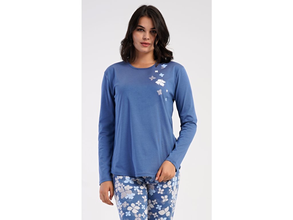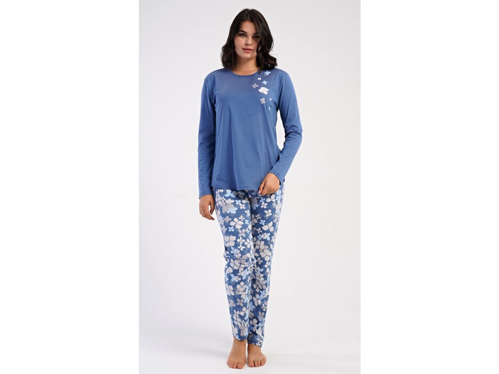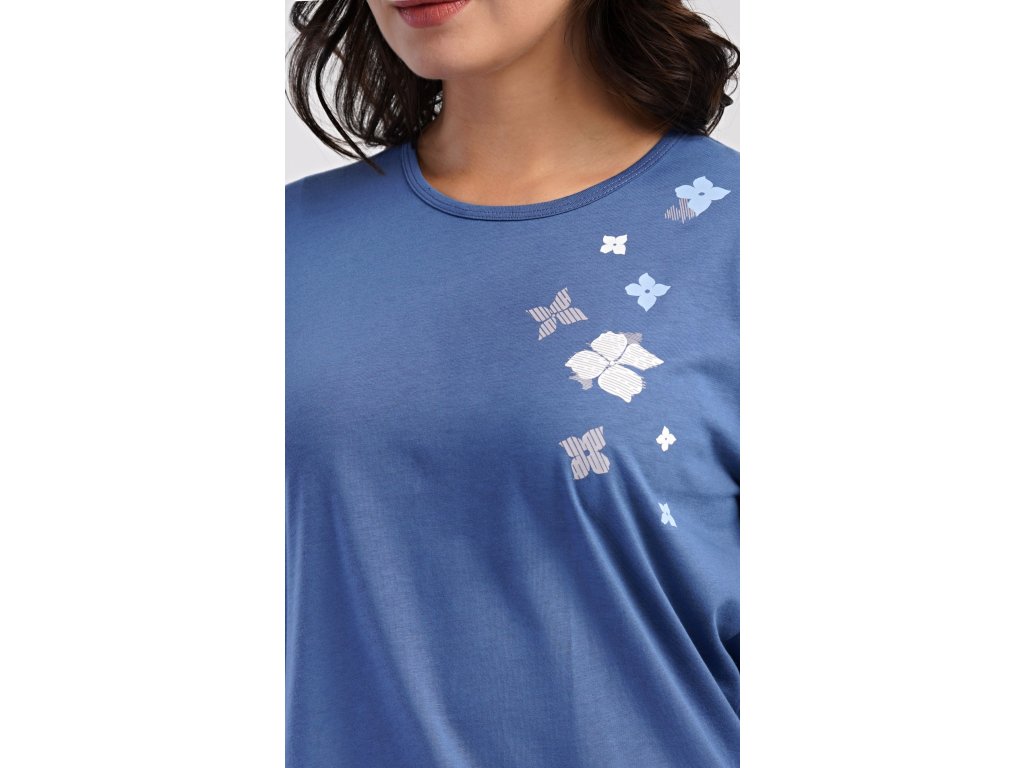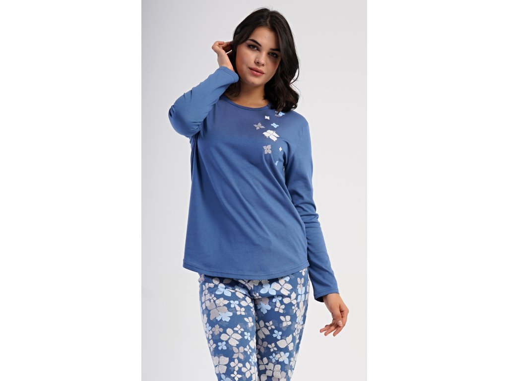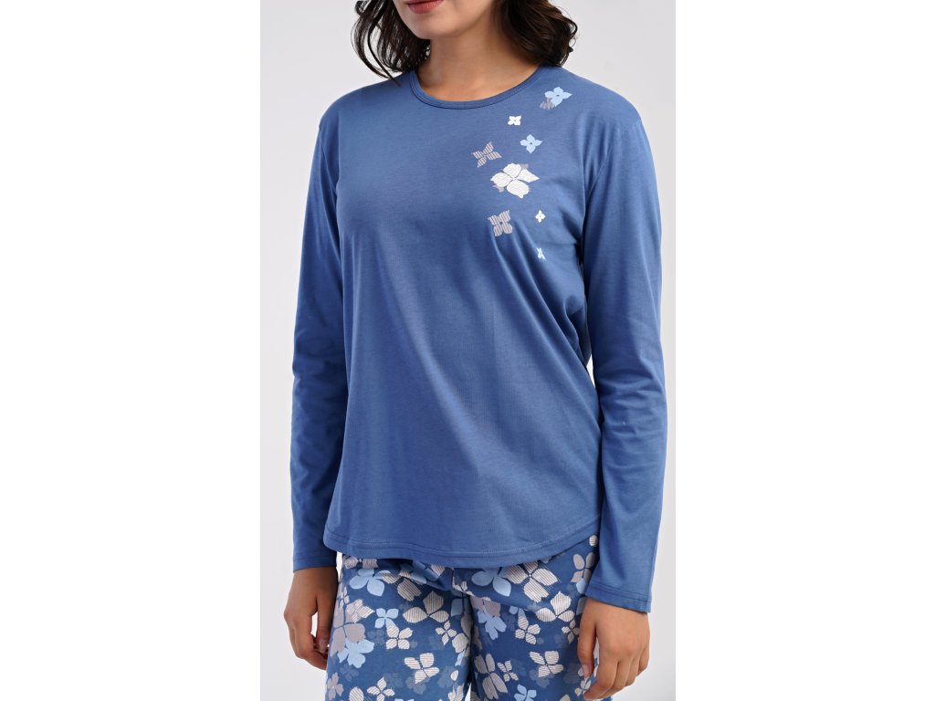 Dámské bavlněné dlouhé pyžamo Joanne. Dámské pyžamo se skládá z trika s dlouhým rukávem a dlouhých kalhot. Jednobarevné triko s kulatým výstřihem je ozdobeno obrázkem květů. Tento motiv se opakuje i na kalhotách, které mají v pase gumu a šňůrku na stažení, nemají kapsy. Použitý bavlněný materiál je poddajný a příjemný na dotek.