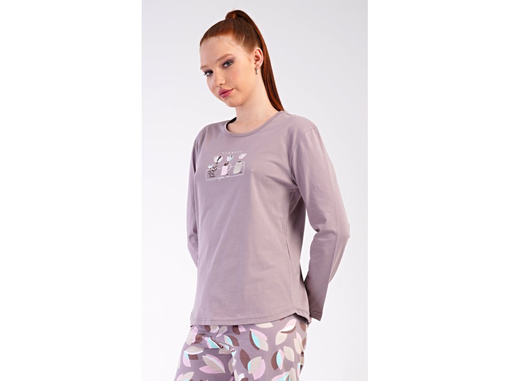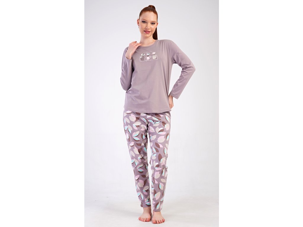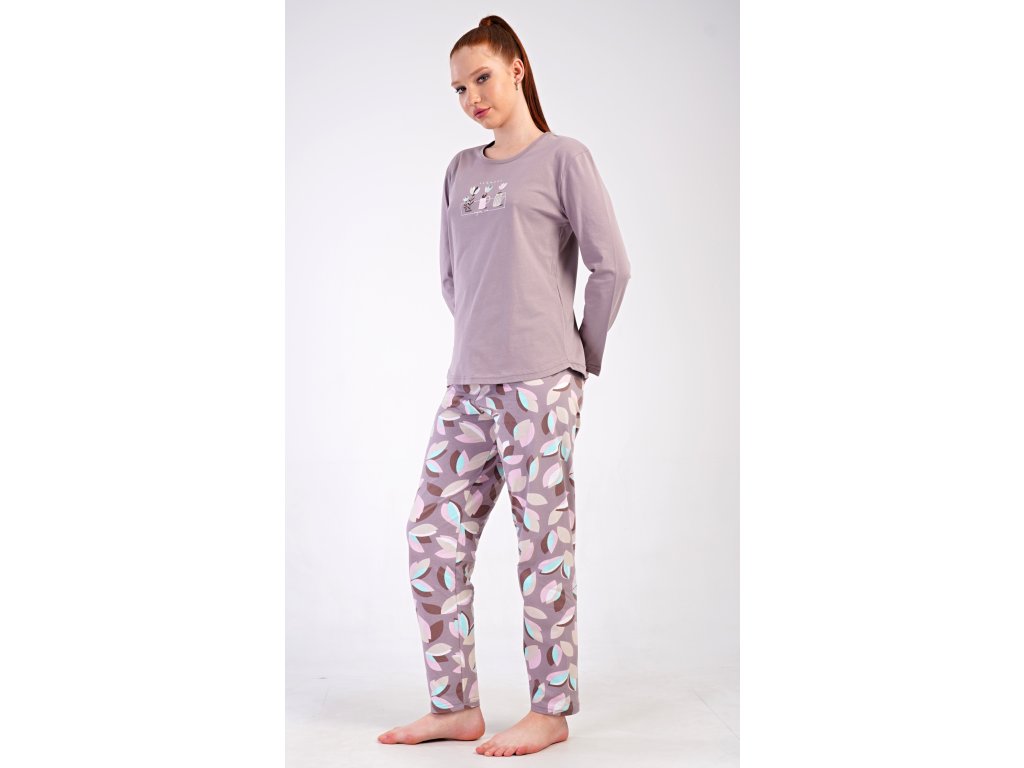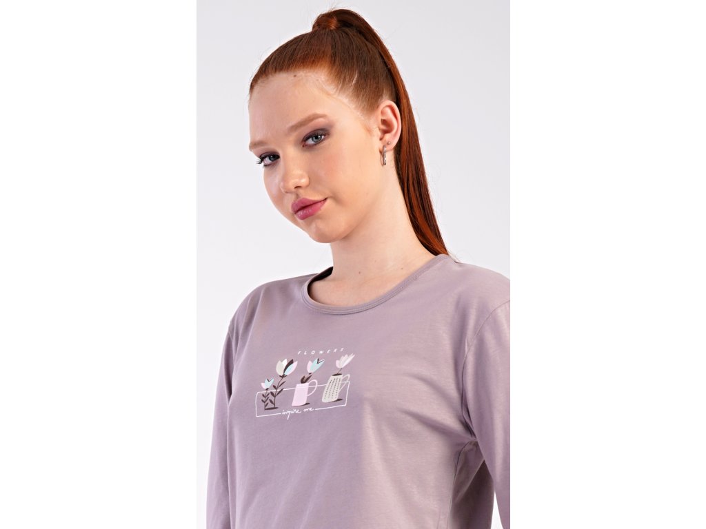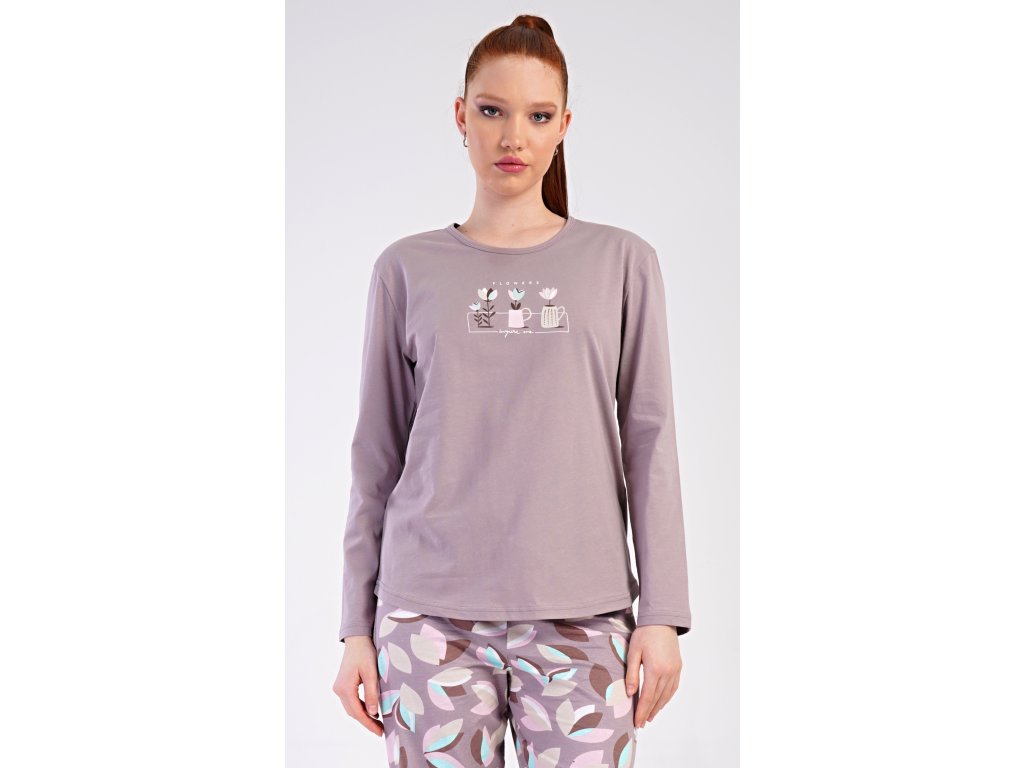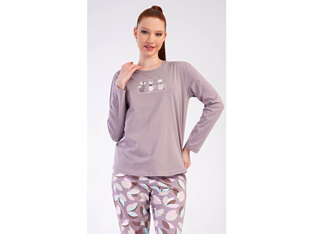 Dámské bavlněné dlouhé pyžamo Karla. Dámské pyžamo se skládá z trika s dlouhým rukávem a dlouhých kalhot. Jednobarevné triko je ozdobeno obrázkem květů. Tento motiv se opakuje i na kalhotách, které mají v pase gumu a šňůrku na stažení, nemají kapsy. Použitý bavlněný materiál je poddajný a příjemný na dotek.