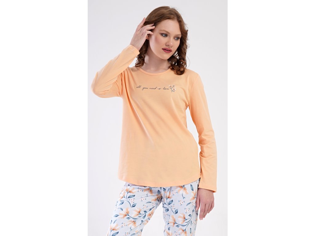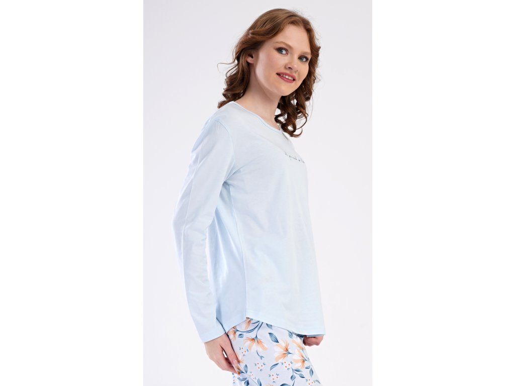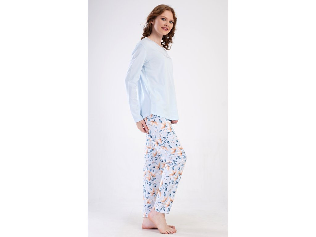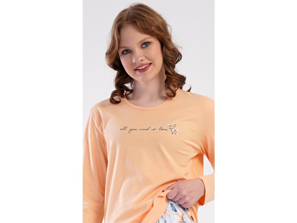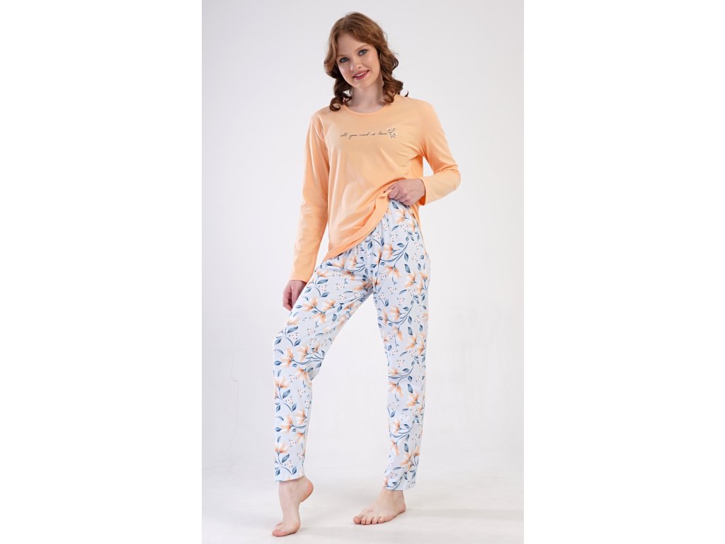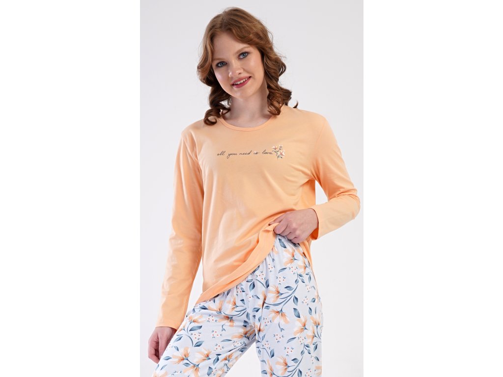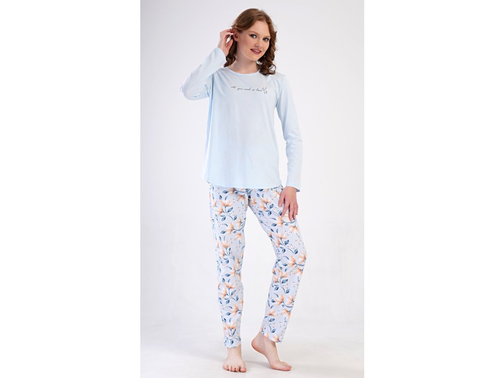 Dámské bavlněné dlouhé pyžamo Karolína. Dámské pyžamo se skládá z trika s dlouhým rukávem a dlouhých kalhot. Triko je jednobarevné, zdobené obrázkem drobných květů a nápisem 'all you need is love'. Květinový motiv se opakuje i na kalhotách, které mají v pase gumu a šňůrku na stažení, nemají kapsy. Použitý bavlněný materiál je poddajný a příjemný na dotek.