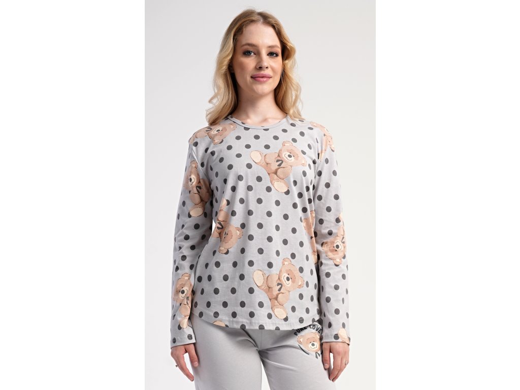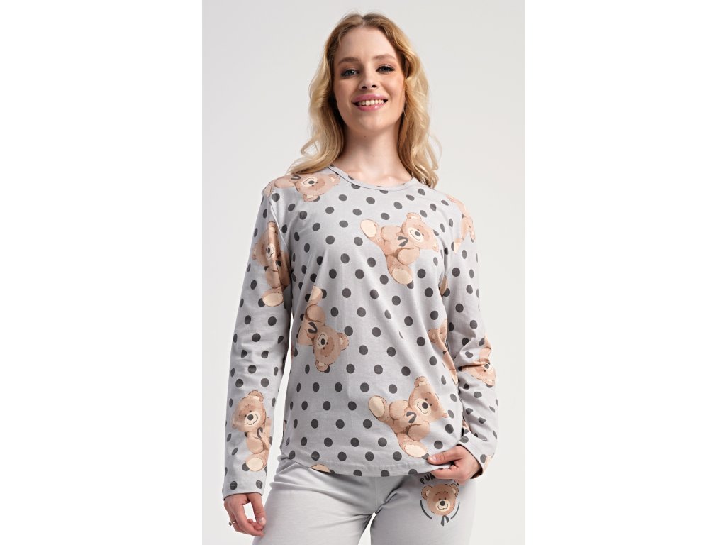 Dámské bavlněné dlouhé pyžamo Paula. Dámské pyžamo se skládá z trika s dlouhým rukávem a dlouhých kalhot. Jednobarevné triko je ozdobeno obrázkem medvědů. Tento motiv se opakuje i na kalhotách, které mají v pase gumu a šňůrku na stažení, nemají kapsy. Použitý bavlněný materiál je poddajný a příjemný na dotek.