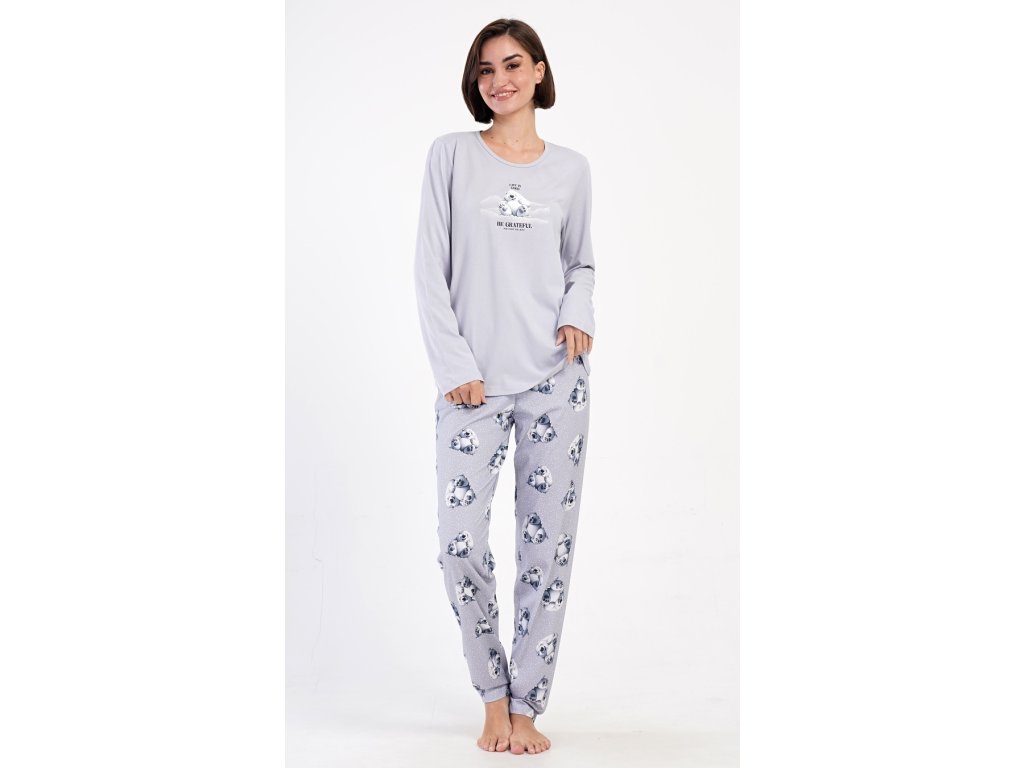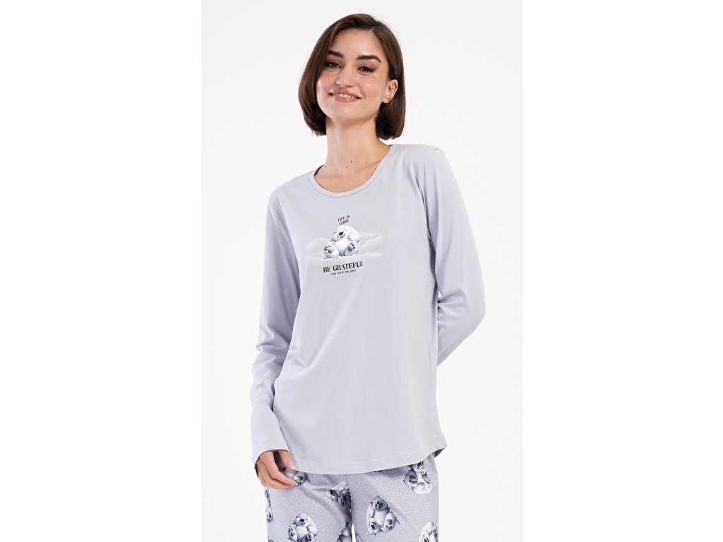 Dámské bavlněné dlouhé pyžamo Polar bear. Dámské pyžamo se skládá z trika s dlouhým rukávem a dlouhých kalhot. Triko je jednobarevné, zdobené obrázkem veselého ledního medvěda a nápisem 'Be grateful'. Obrázky medvědů se opakují i na kalhotách, které mají v pase gumu a šňůrku na stažení, nemají kapsy. Použitý bavlněný materiál je poddajný a příjemný na dotek.