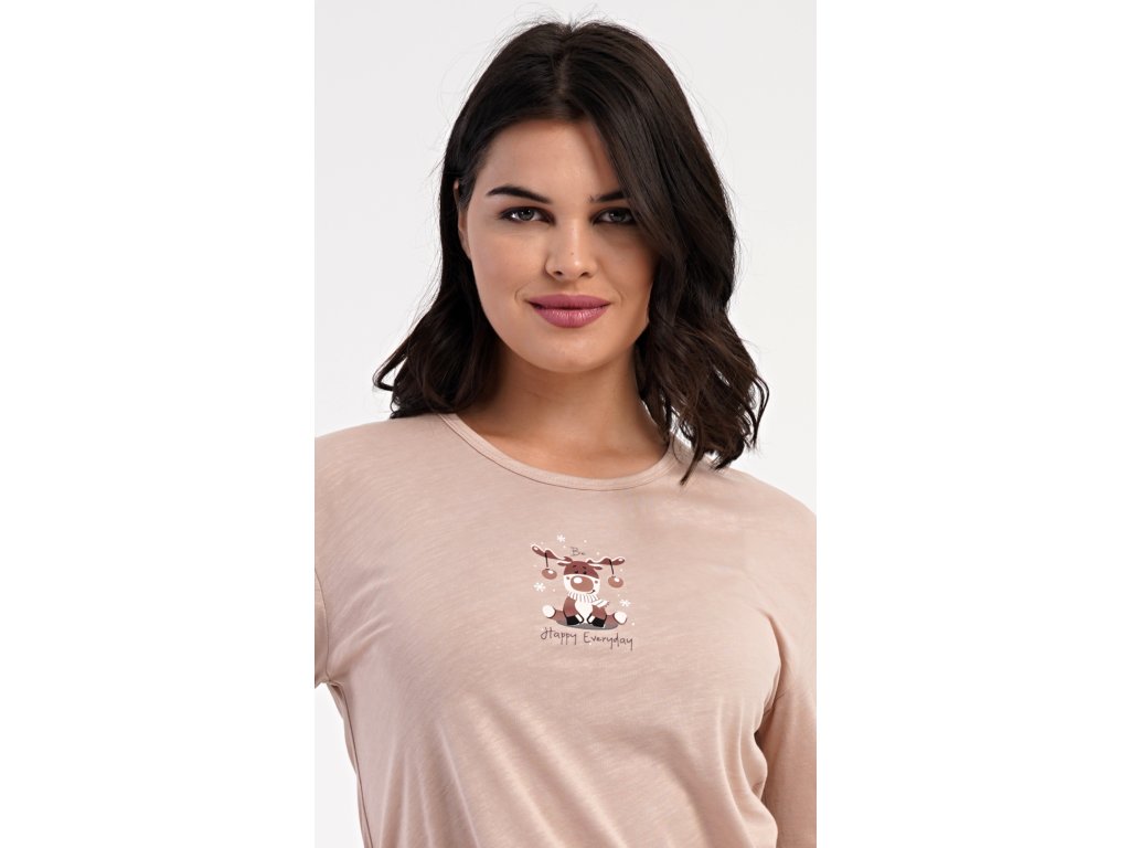 Dámské bavlněné dlouhé pyžamo Sobík. Dámské pyžamo se skládá z trika s dlouhým rukávem a dlouhých kalhot. Triko s kulatým výstřihem je na hrudi zdobeno obrázkem malého vánočního soba. Tento motiv se opakuje i na kalhotách, které mají v pase gumu a šňůrku na stažení, nemají kapsy. Použitý bavlněný materiál je poddajný a příjemný na dotek.