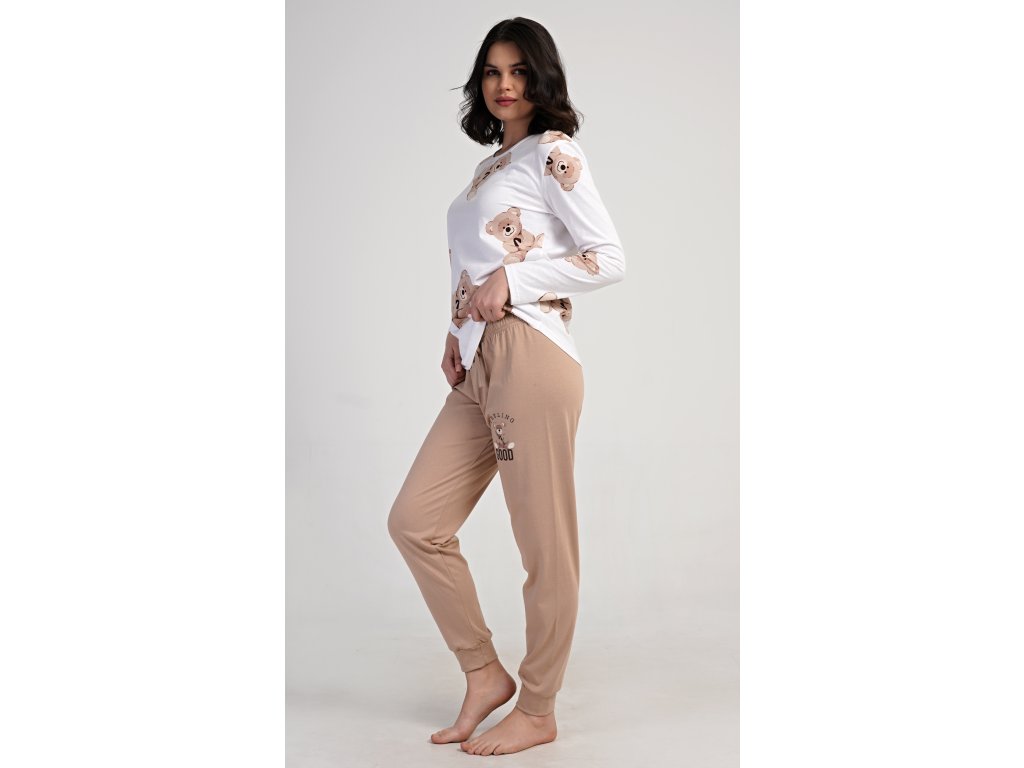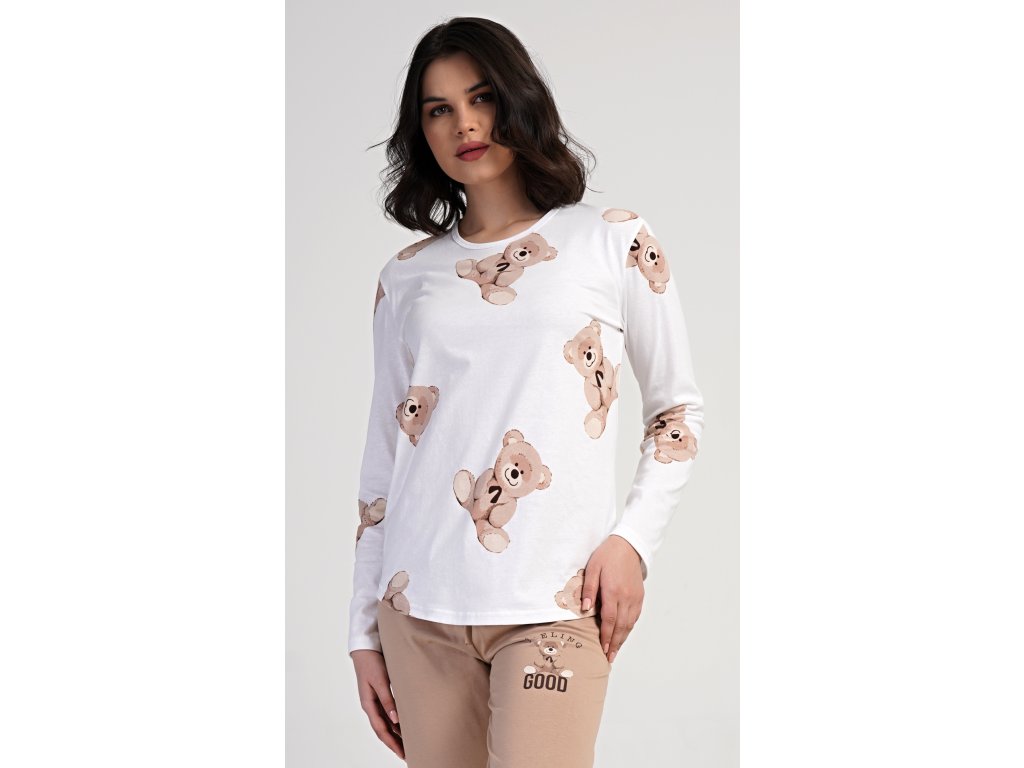 Dámské bavlněné dlouhé pyžamo Teddy bear. Dámské pyžamo se skládá z trika s dlouhým rukávem a dlouhých kalhot. Triko je potištěno plyšovými medvídky. Tento motiv se opakuje i na kalhotách, které mají v pase gumu a šňůrku na stažení, nemají kapsy. Použitý bavlněný materiál je poddajný a příjemný na dotek.