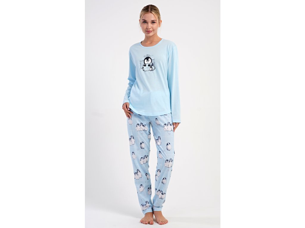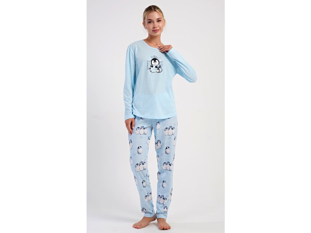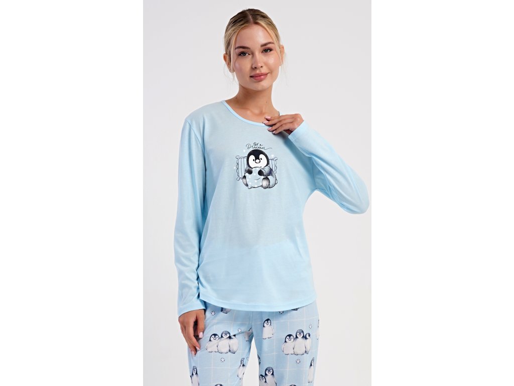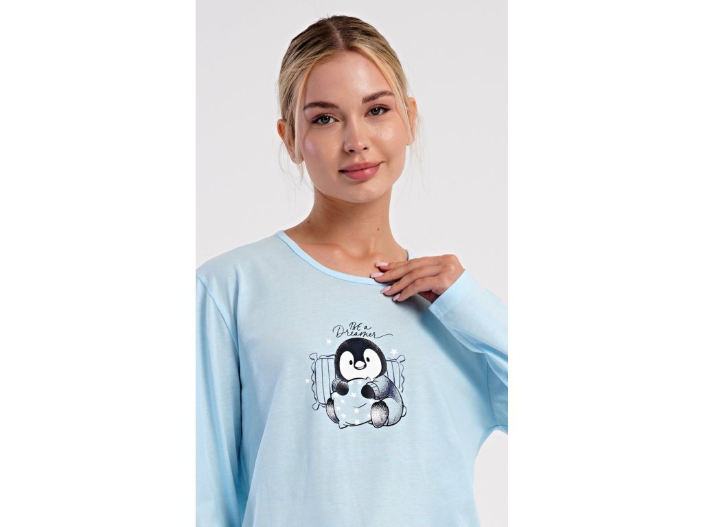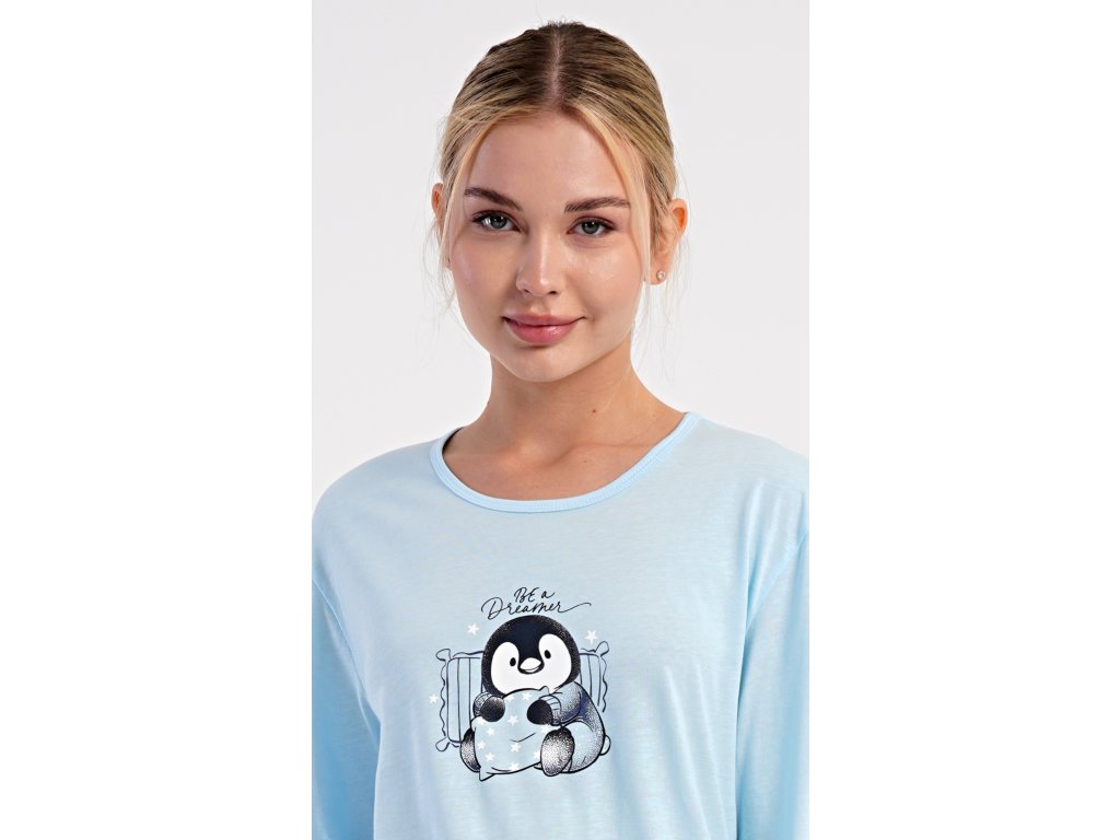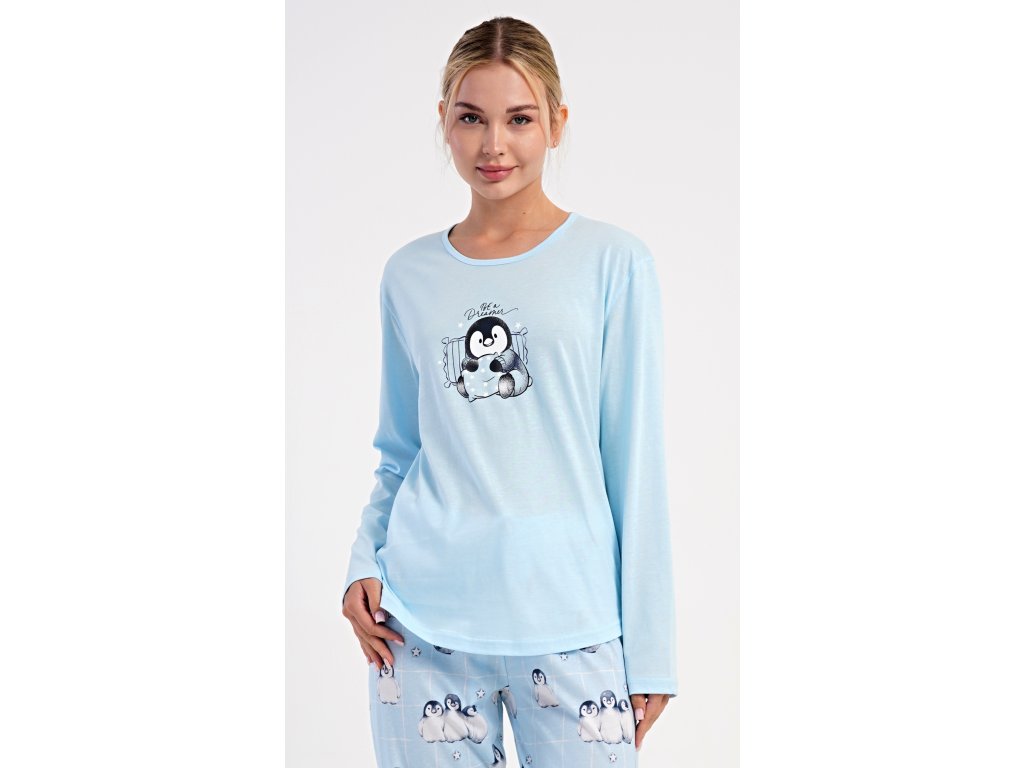 Dámské bavlněné dlouhé pyžamo Tučkák. Dámské pyžamo se skládá z trika s dlouhým rukávem a dlouhých kalhot. Jednobarevné triko je ozdobeno obrázkem tučňáka s polštářem. Motiv tučňáků se opakuje i na kalhotách, které mají v pase gumu a šňůrku na stažení, nemají kapsy. Použitý bavlněný materiál je poddajný a příjemný na dotek.