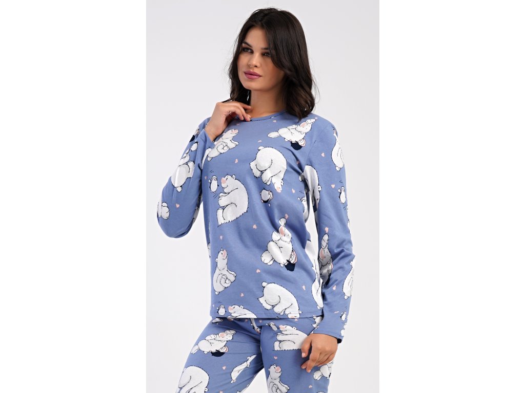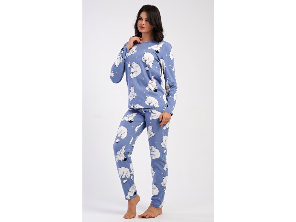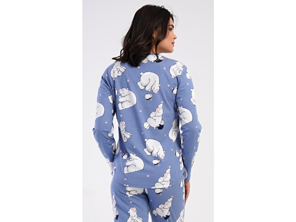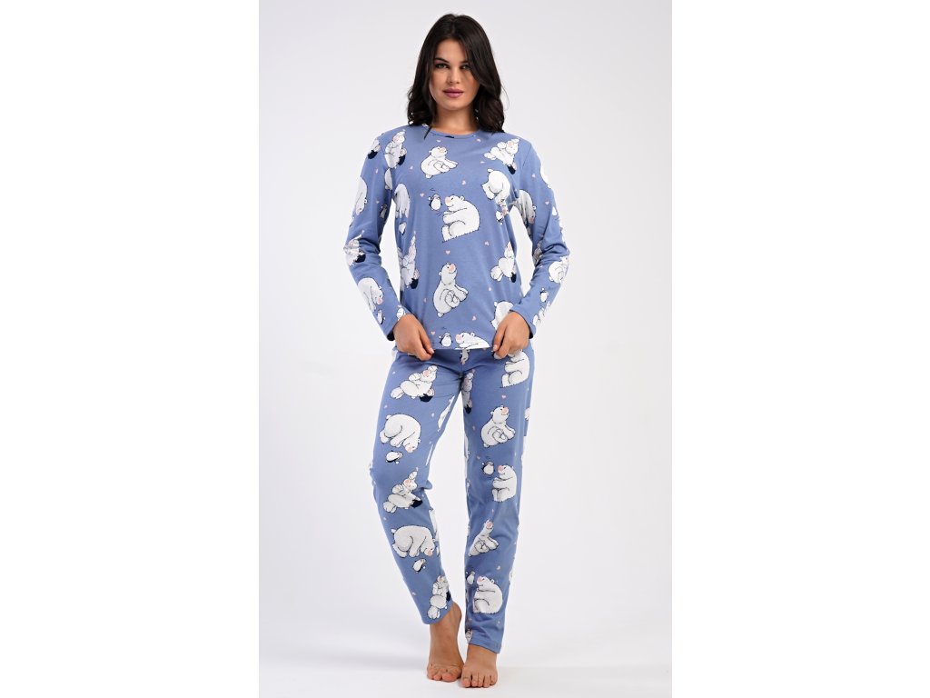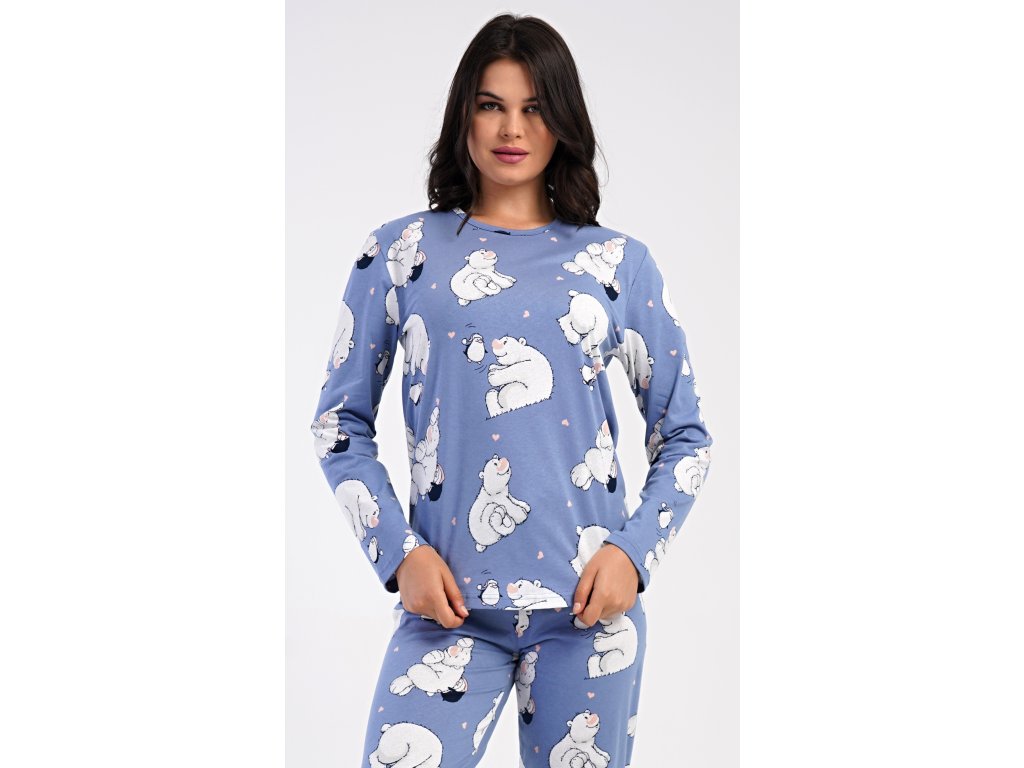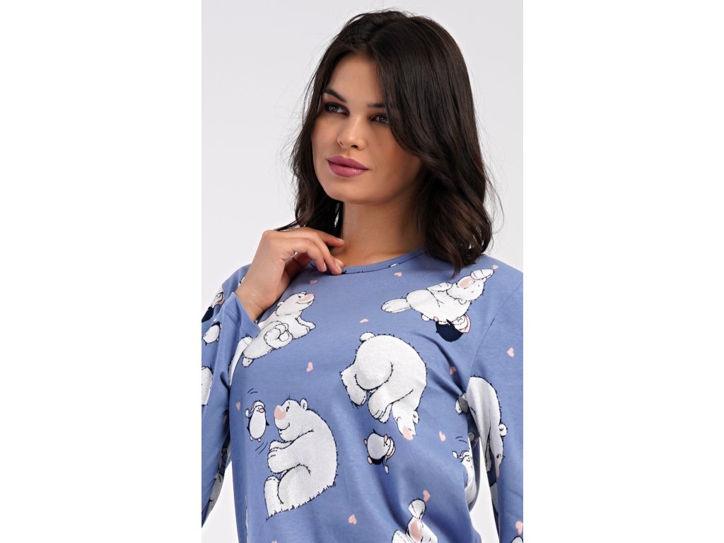 Dámské bavlněné dlouhé pyžamo Tučňák a méďa. Dámské pyžamo se skládá z trika s dlouhým rukávem a dlouhých kalhot. Triko s kulatým výstřihem je ozdobeno obrázky ledních medvědů. Tento motiv se opakuje i na kalhotách, které mají v pase gumu a šňůrku na stažení, nemají kapsy. Použitý bavlněný materiál je poddajný a příjemný na dotek.