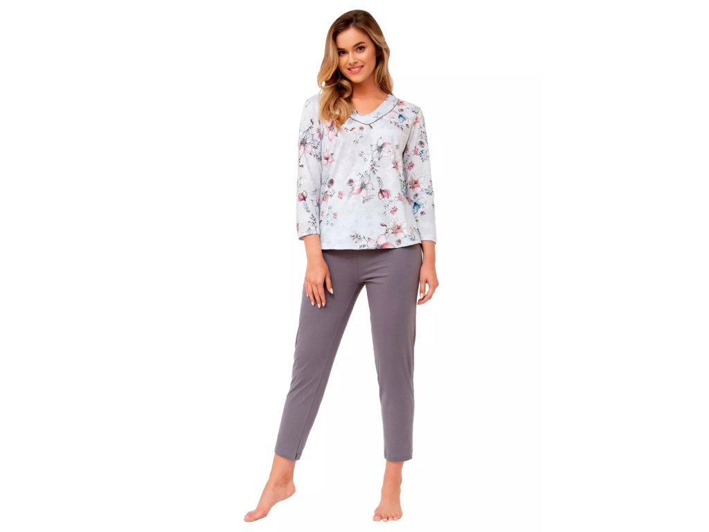 Dámské vzorované pyžamo s dlouhým rukávem a dlouhými kalhotami. Tričko s dlouhým rukávem je ozdobené květinovým vzorem. Jednoabrevné kalhoty jsou šité bez kapes a mají volnou gumu v pase. Pyžamo je možné používat i jako běžné oblečení na doma.