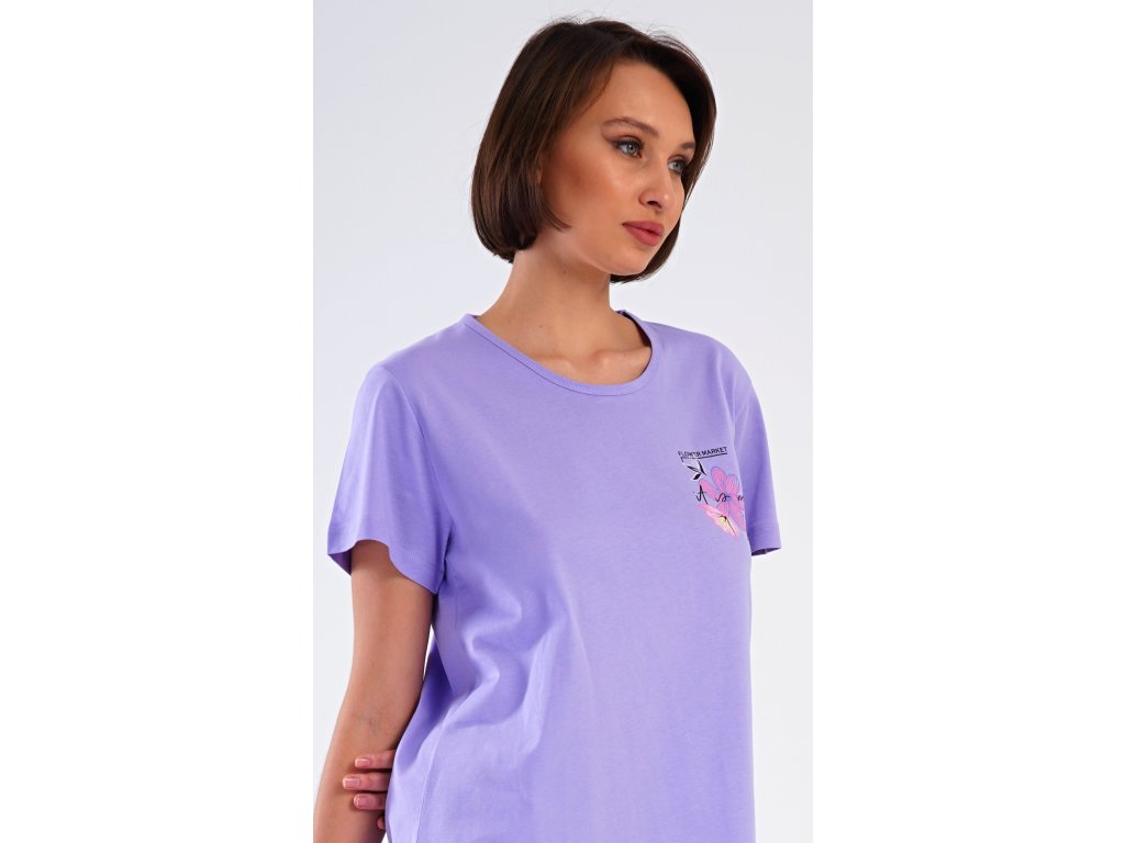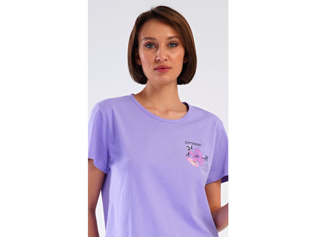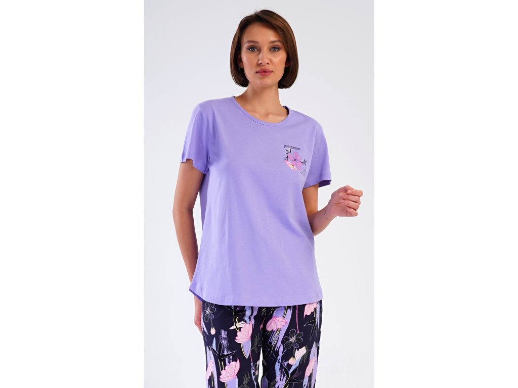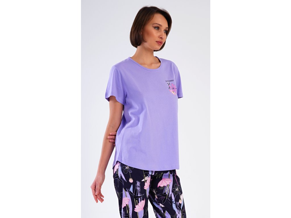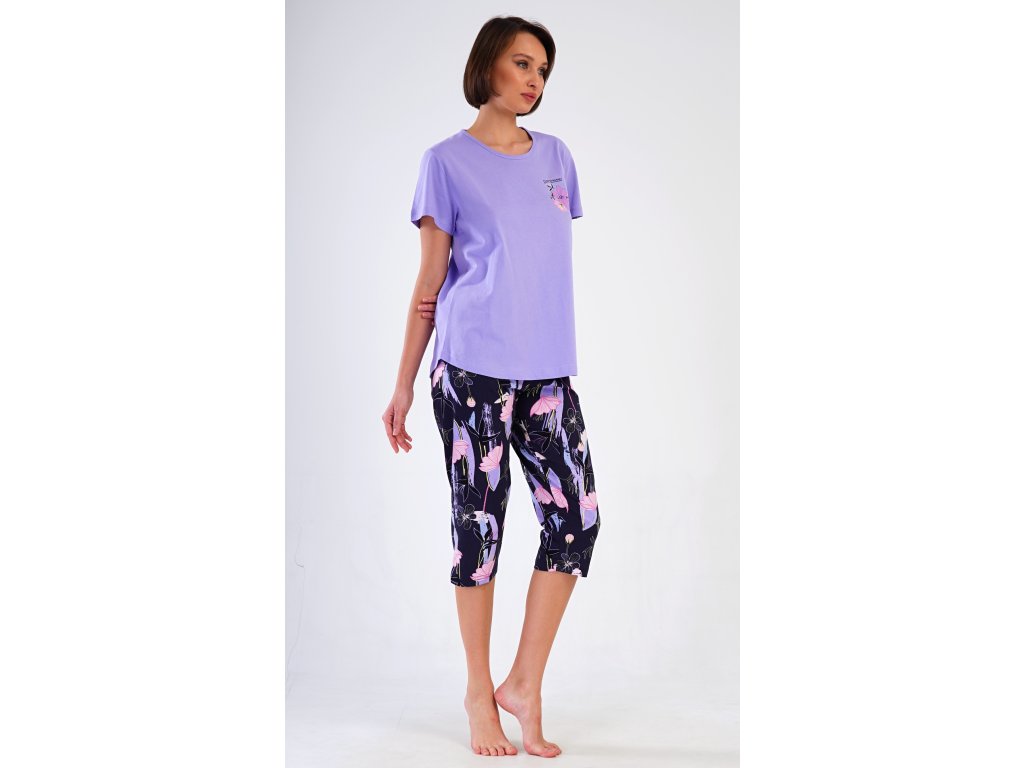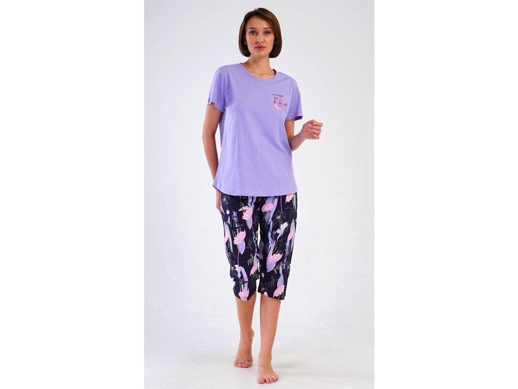 Dámské bavlněné kapri pyžamo Flowers. Dámské pyžamo se skládá z trička s krátkým rukávem a tříčtvrtečních kalhot. Tričko s kulatým výstřihem má na hrudi obrázek květu. Tento motiv se opakuje i na kalhotách, které mají v pase gumu a šňůrku na stažení, jsou bez kapes. Použitý bavlněný materiál je příjemný a poddajný na dotek.