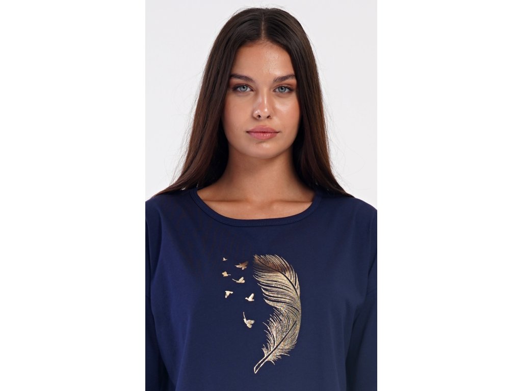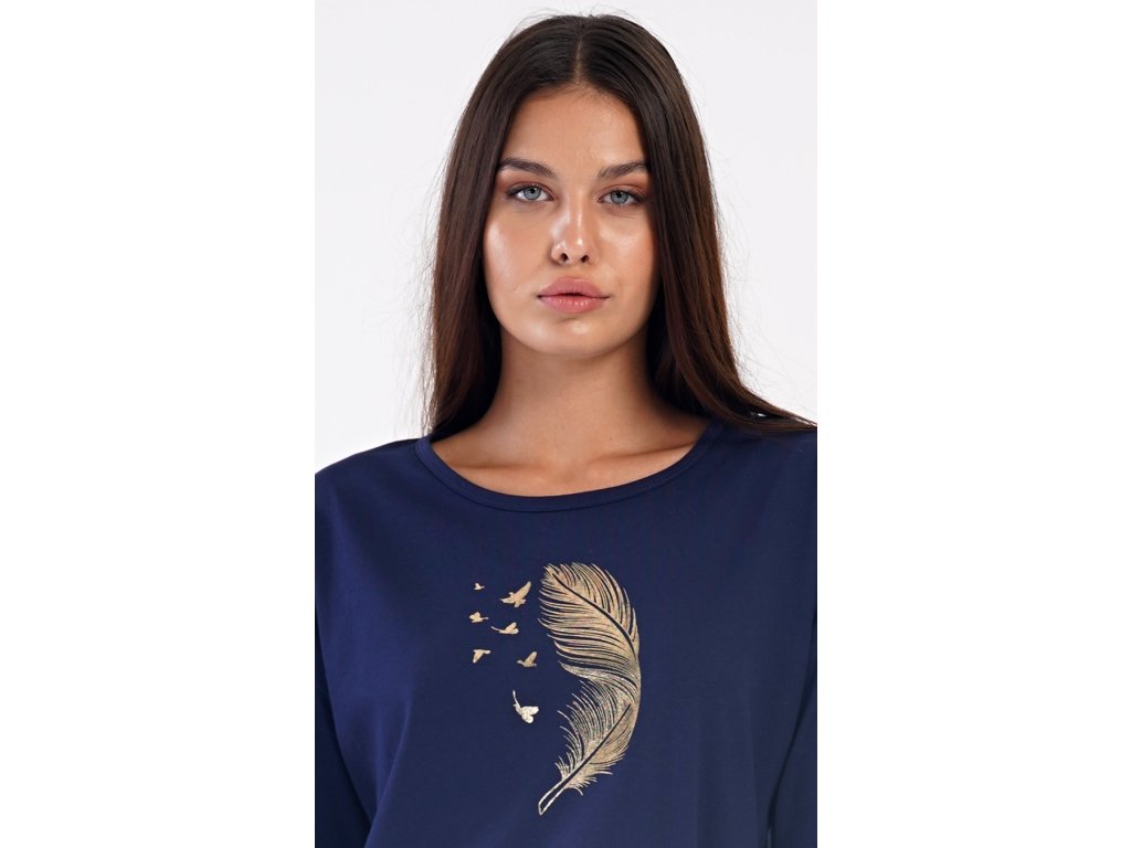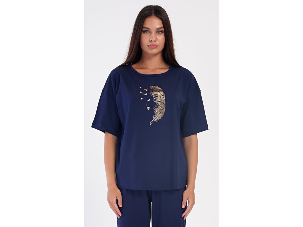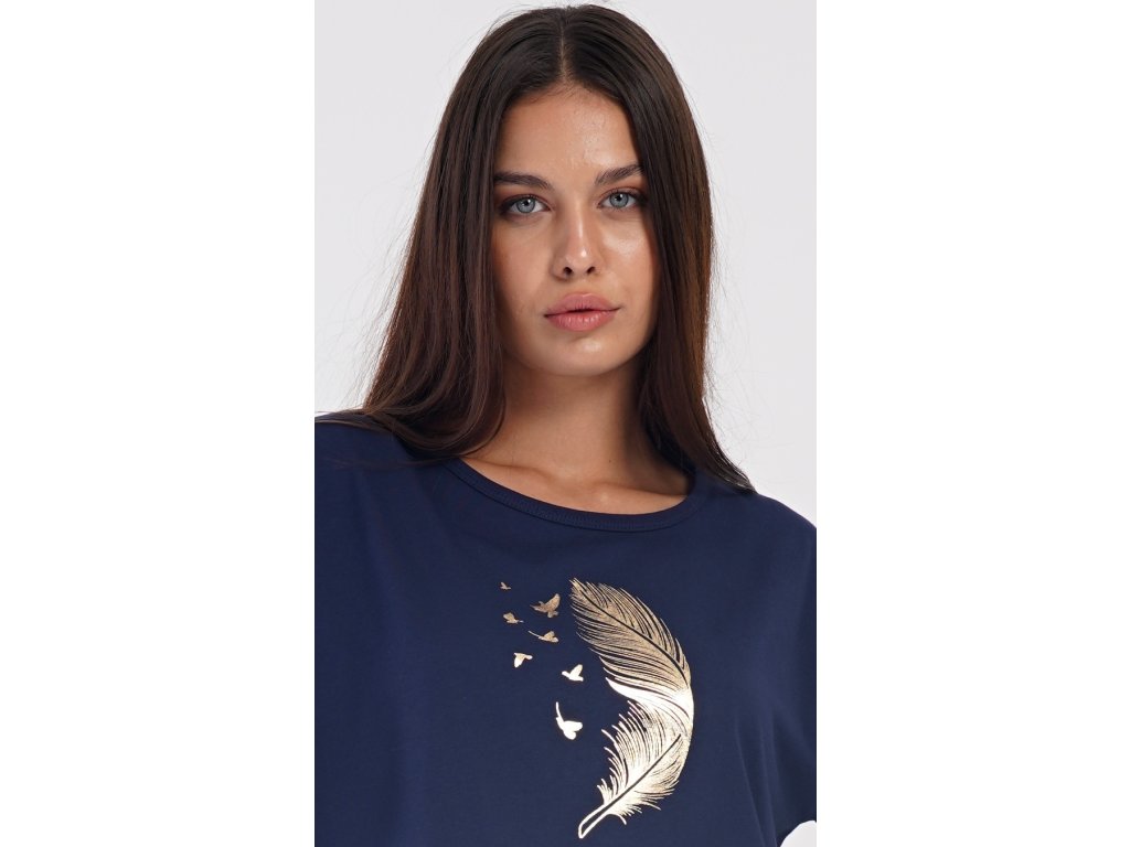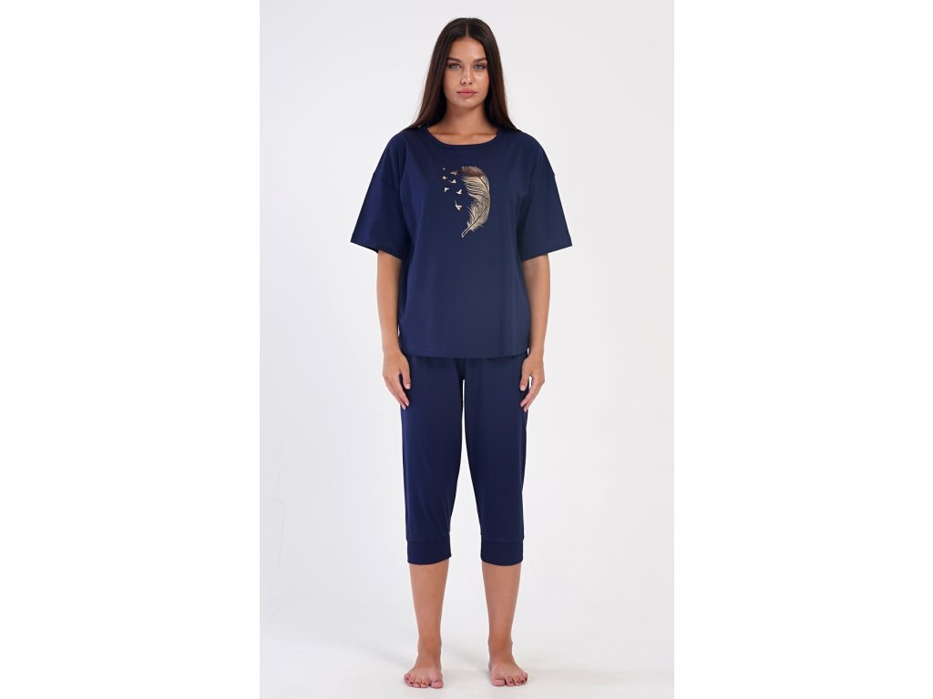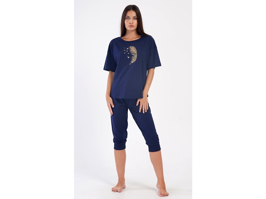 Dámské bavlněné kapri pyžamo Pírko. Dámské pyžamo se skládá z trička s krátkým spadeným rukávem a tříčtvrtečních kalhot zakončených lemy. Tričko s kulatým výstřihem má na hrudi obrázek zlatého peří. Kalhoty mají v pase gumu a šňůrku na stažení, jsou bez kapes. Použitý bavlněný materiál je příjemný a poddajný na dotek.