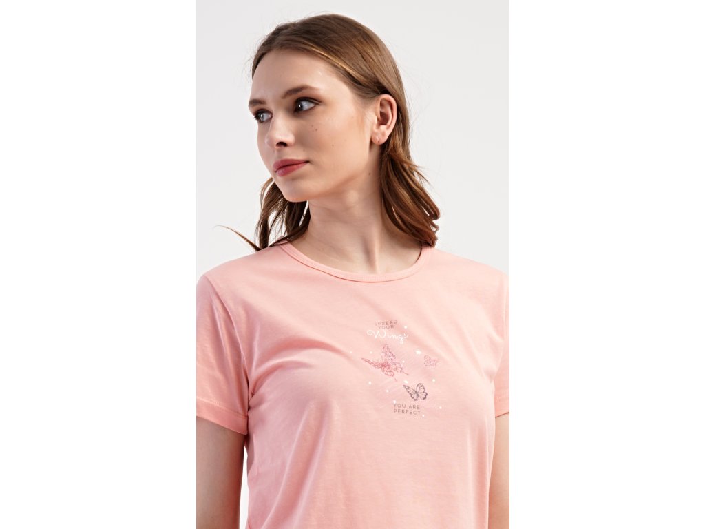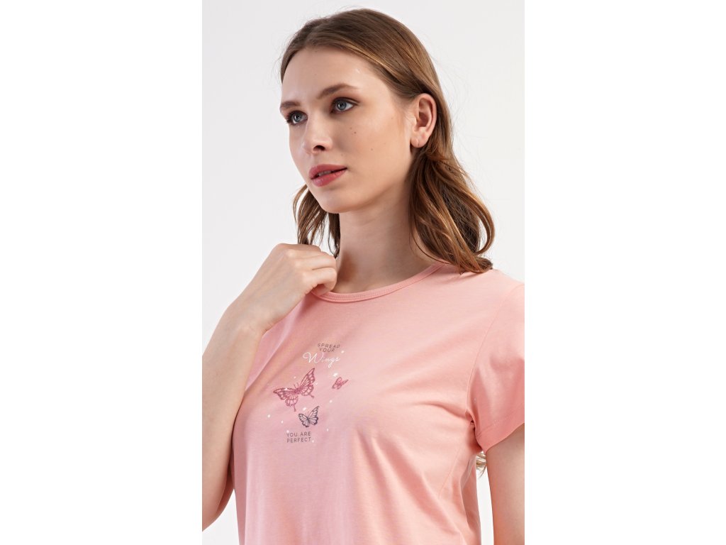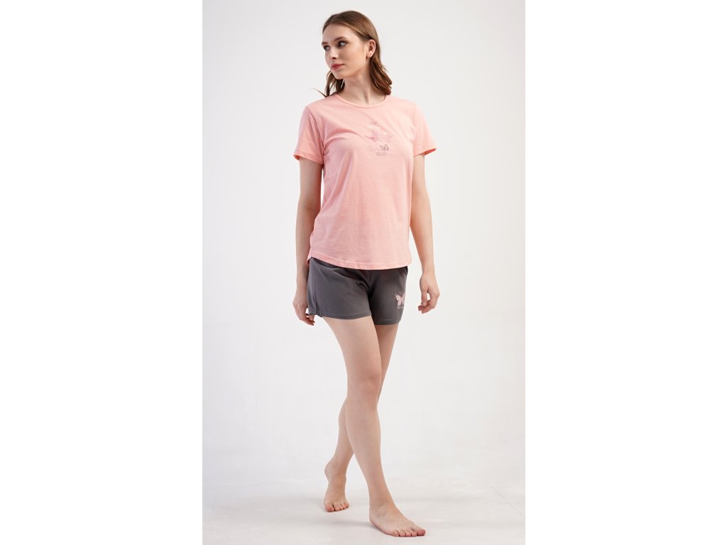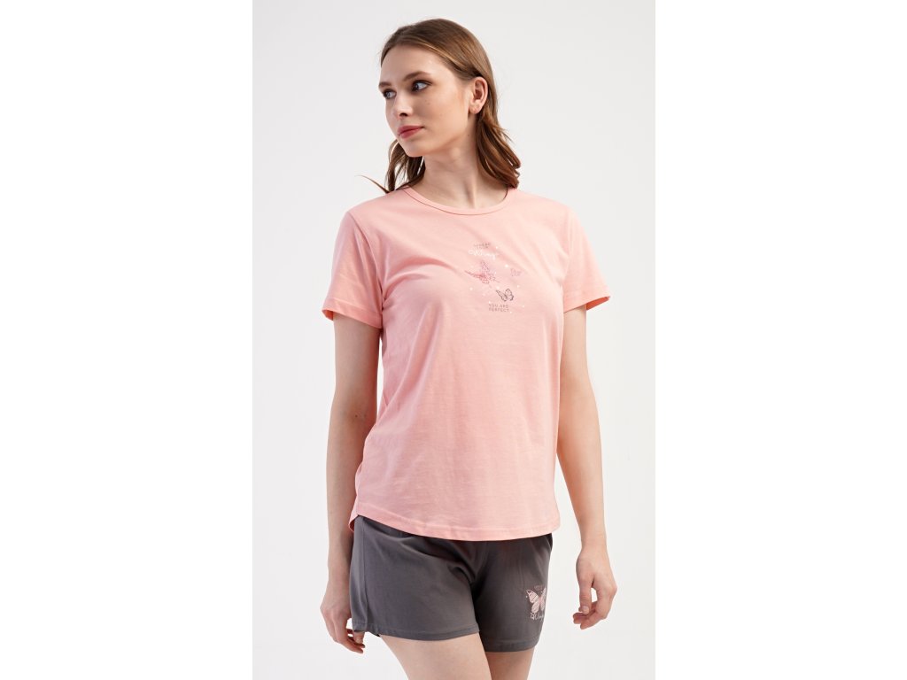 Dámské bavlněné šortkové pyžamo Motýlci. Dámské pyžamo se skládá z trička s krátkým rukávem a šortkových kalhot. Jednobarevné tričko zdobí obrázek motýlků. Stejný motiv se opakuje i na šortkách, které mají v pase gumu a šňůrku na stáhnutí, jsou bez kapes. Použitý bavlněný materiál je příjemný a poddajný na dotek.
