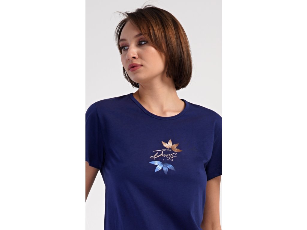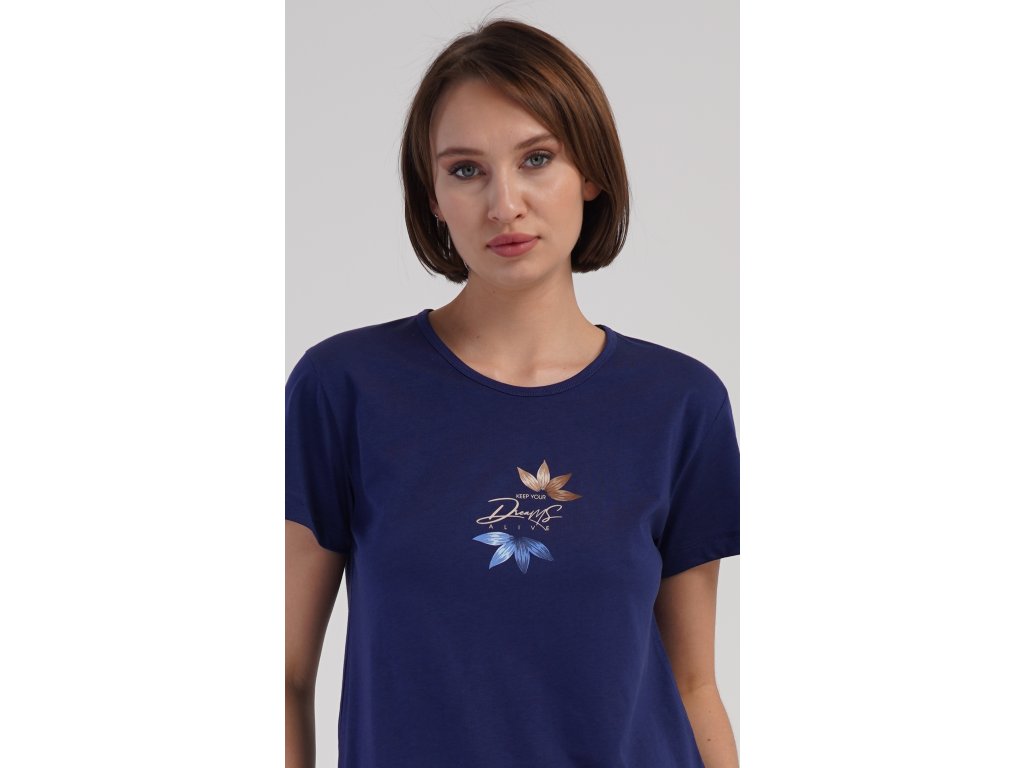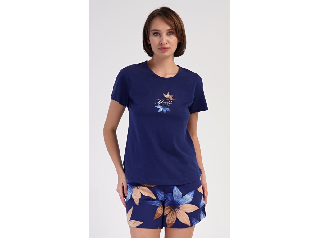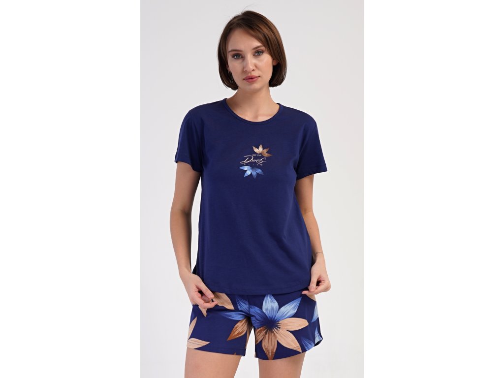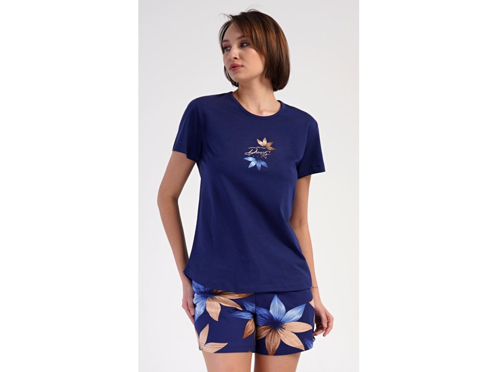 Dámské bavlněné šortkové pyžamo Sára. Dámské pyžamo se skládá z trička s krátkým rukávem a šortkových kalhot. Jednobarevné tričko zdobí obrázek květu. Květinový motiv se opakuje i na šortkách, které mají v pase gumu a šňůrku na stáhnutí, jsou bez kapes. Použitý bavlněný materiál je příjemný a poddajný na dotek.