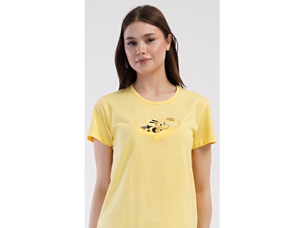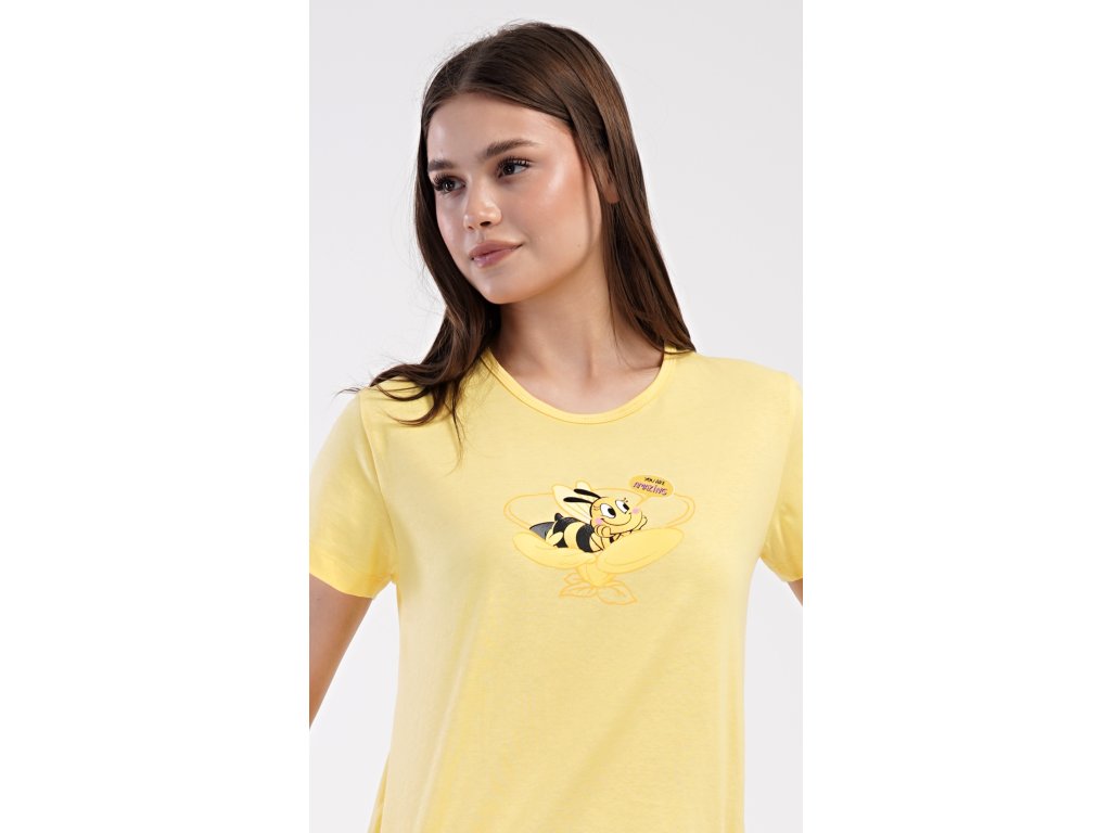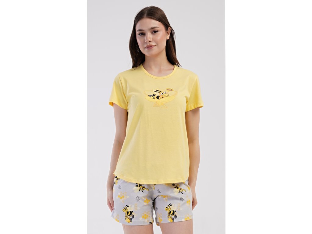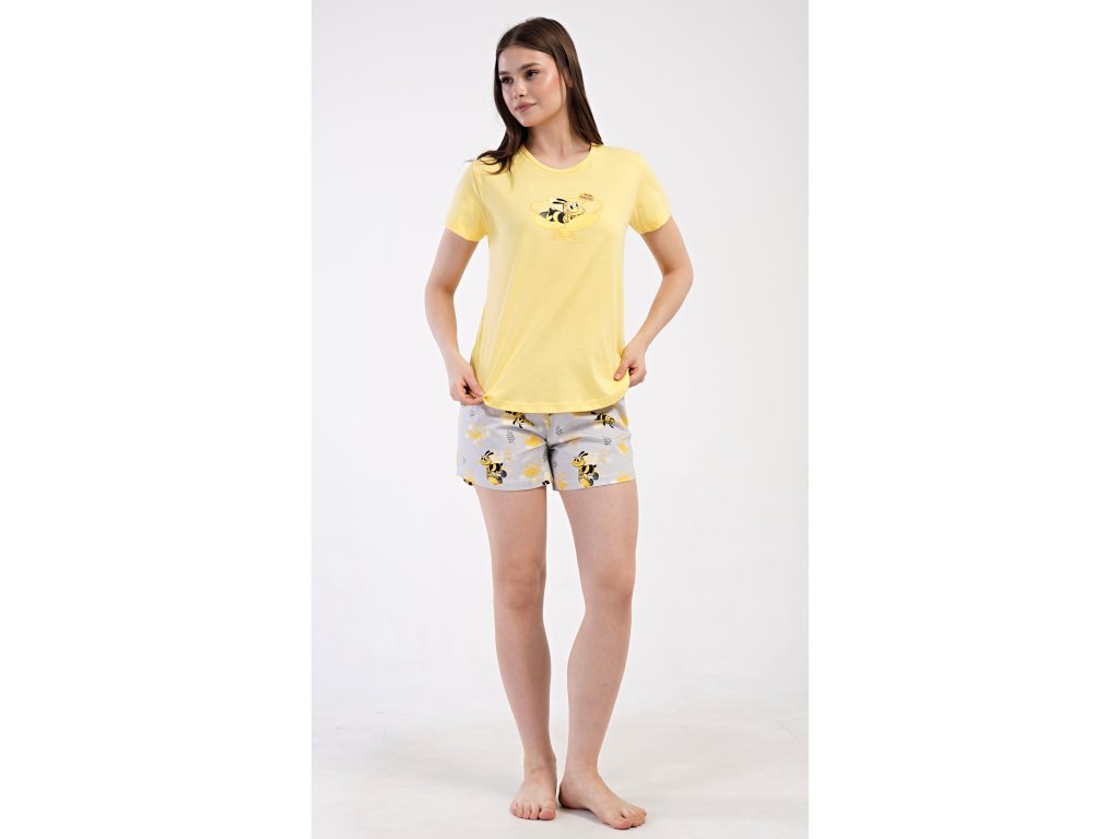 Dámské bavlněné šortkové pyžamo Včelka. Dámské pyžamo se skládá z trička s krátkým rukávem a šortkových kalhot. Jednobarevné tričko zdobí obrázek včelky. Stejný motiv se opakuje i na šortkách, které mají v pase gumu a šňůrku na stáhnutí, jsou bez kapes. Použitý bavlněný materiál je příjemný a poddajný na dotek.