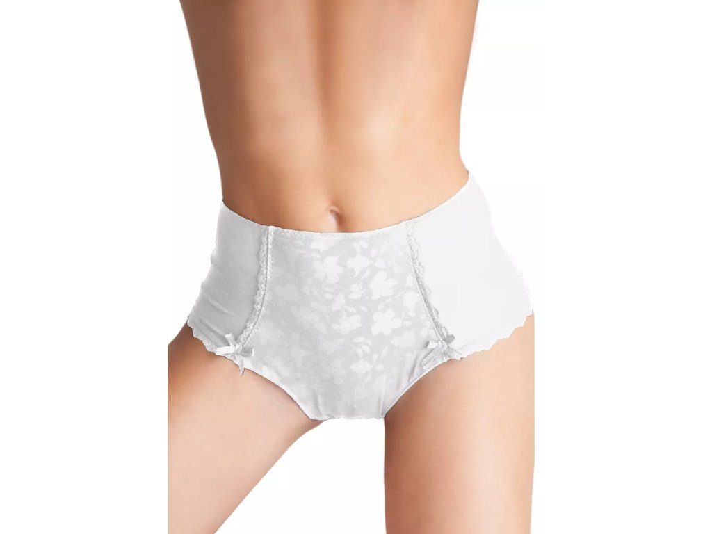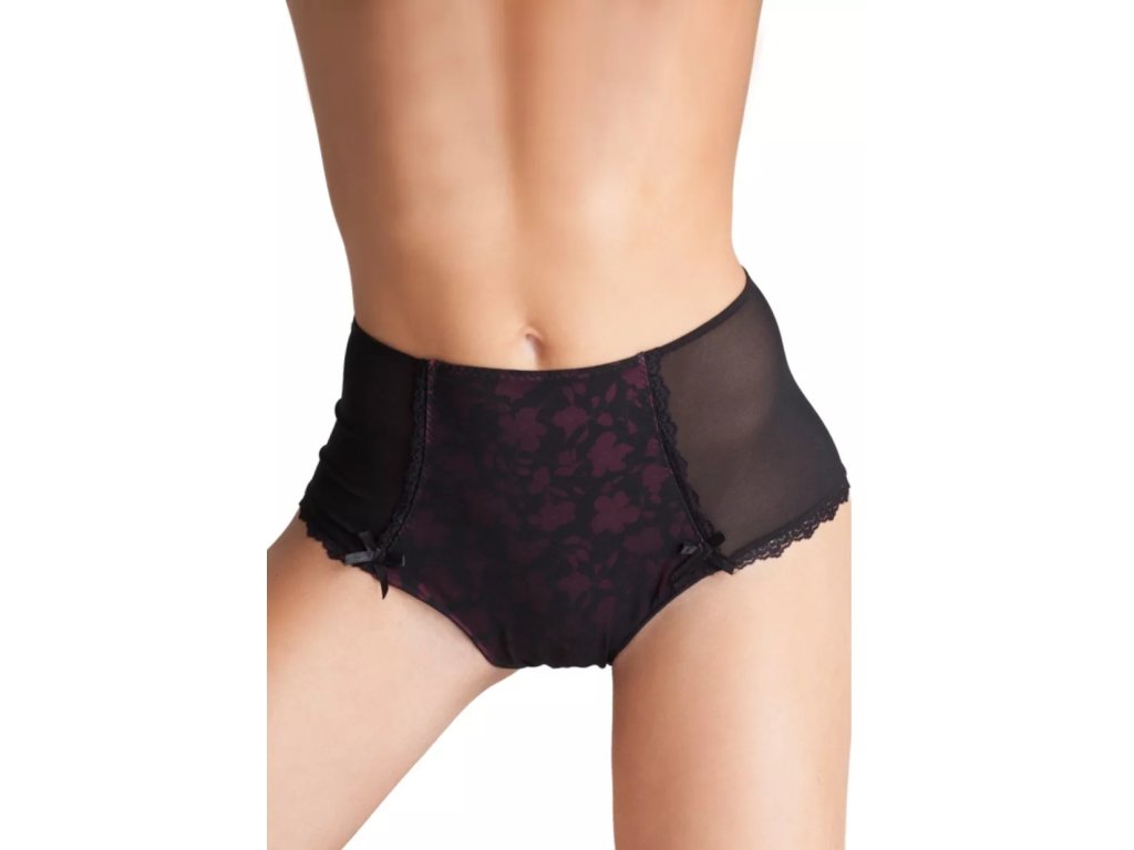 Dámské vyšší krajkové kalhotky z průhledného tylu vpředu jsou ozdobeny vzorem drobných květů lemovaný krajkou . Vnitřní část rozkroku kalhotek je podšita bavlněnou látkou.