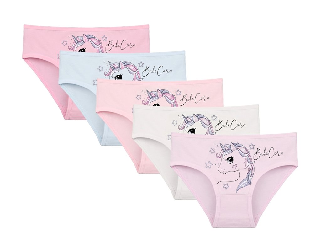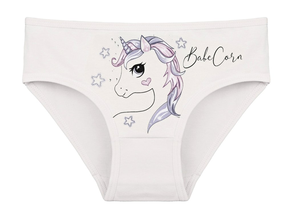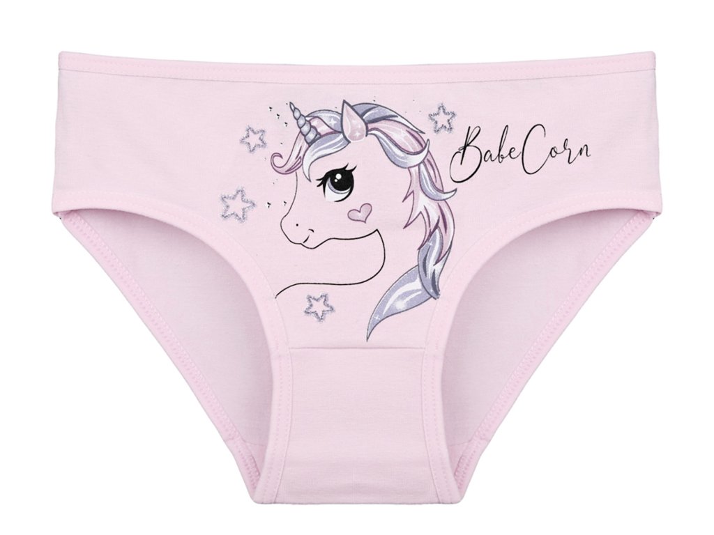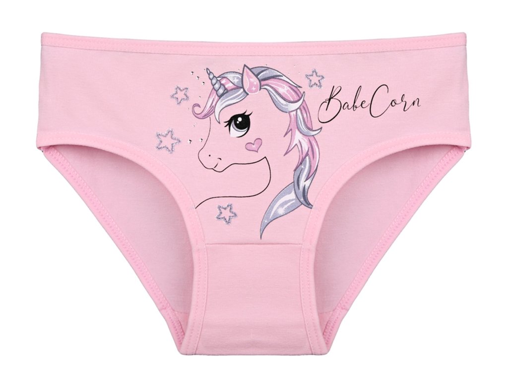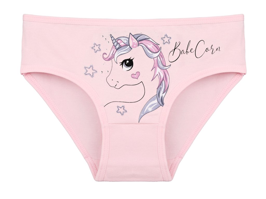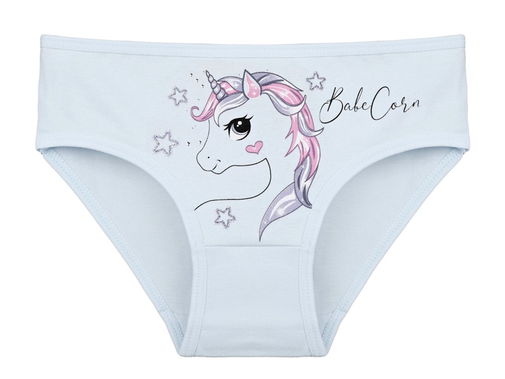 Dětské bavlněné kalhotky Amelia. Dětské kalhotky klasického střihu jsou pohodlné a slušivé, zdobí je obrázek jednorožce. Obzvláště oceníte materiálové složení - 95% bavlna a 5% elasten. Použitý materiál je příjemný a poddajný na dotek.