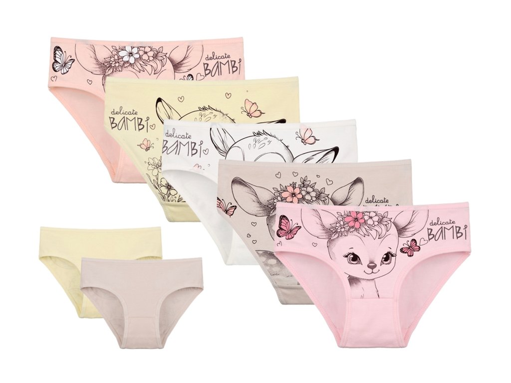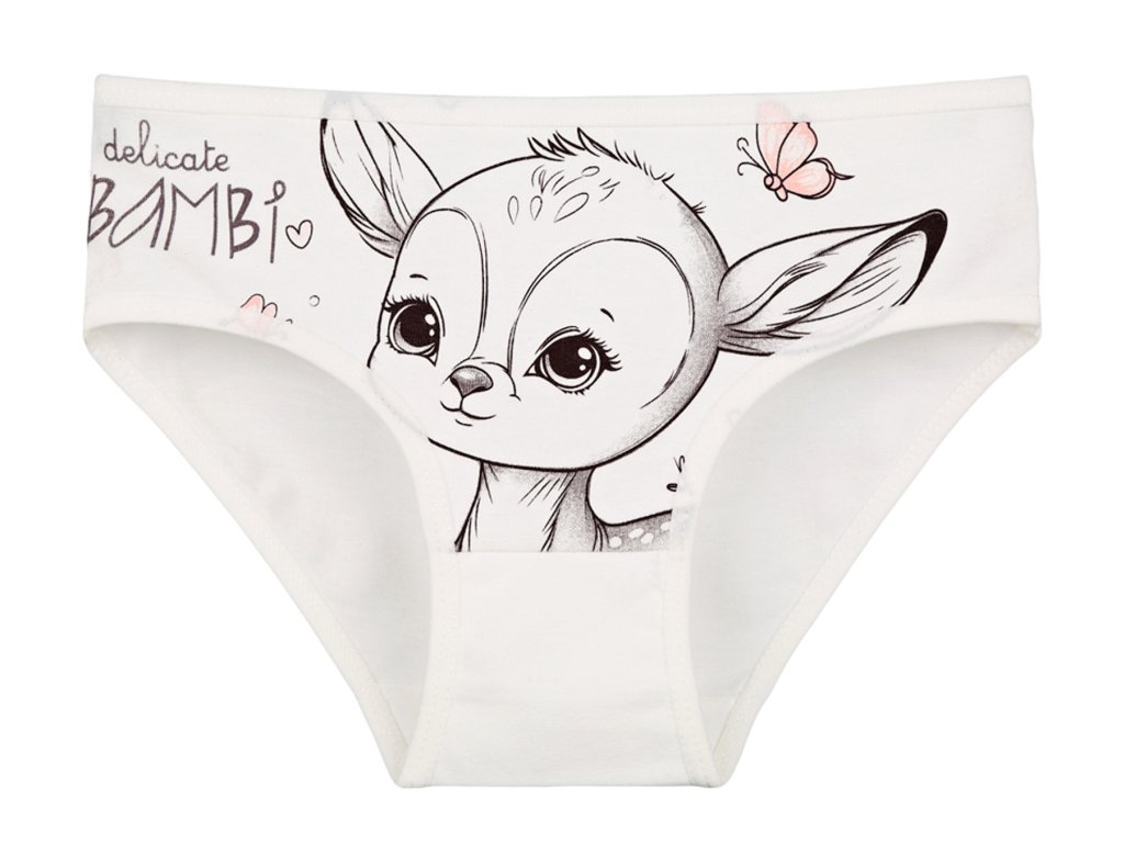 Dětské bavlněné kalhotky Bambi. Dětské kalhotky klasického střihu jsou pohodlné a slušivé, zdobí je obrázek malé srnečky. Obzvláště oceníte materiálové složení - 95% bavlna a 5% elasten. Použitý materiál je příjemný a poddajný na dotek.