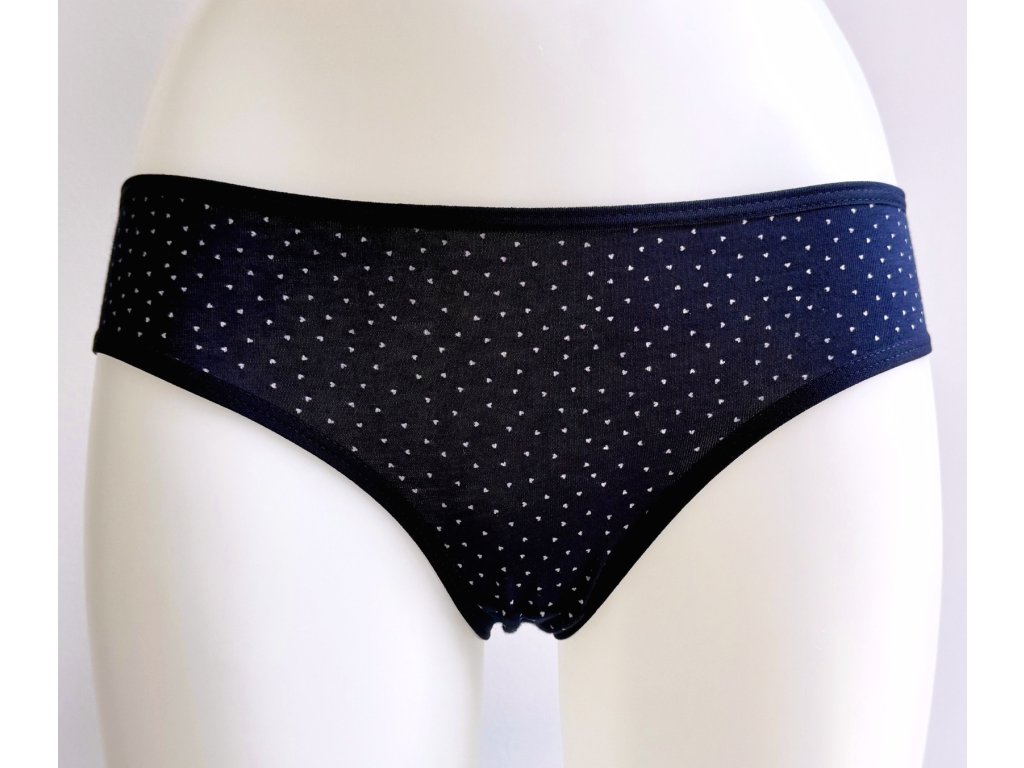 Dětské bavlněné kalhotky Kika. Tmavě modré kalhotky klasického střihu jsou pohodlné a slušivé, zdobí je malá srdíčka. Obzvláště oceníte materiálové složení - 95% bavlna a 5% elasten. Použitý materiál je příjemný a poddajný na dotek.