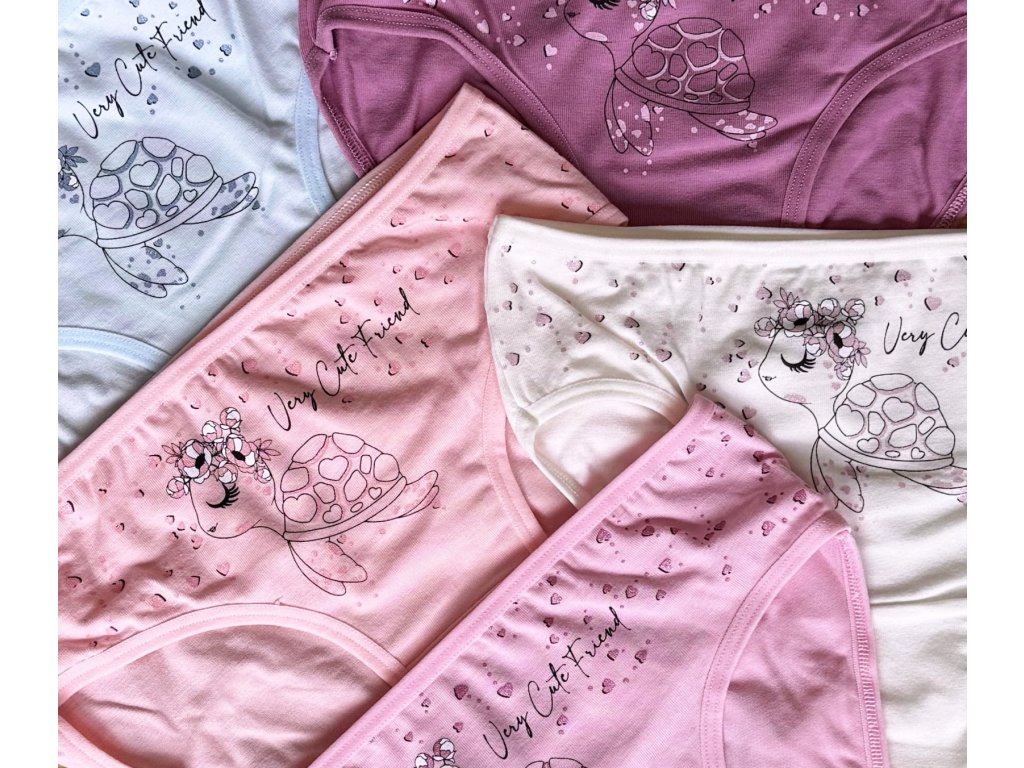 Dětské bavlněné kalhotky Želvička. Dětské kalhotky klasického střihu jsou pohodlné a slušivé, zdobí je obrázek a želvička. Obzvláště oceníte materiálové složení - 95% bavlna a 5% elasten. Použitý materiál je příjemný a poddajný na dotek.