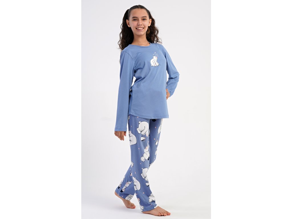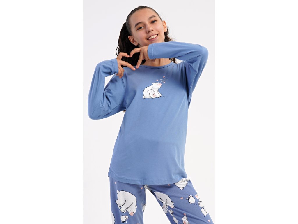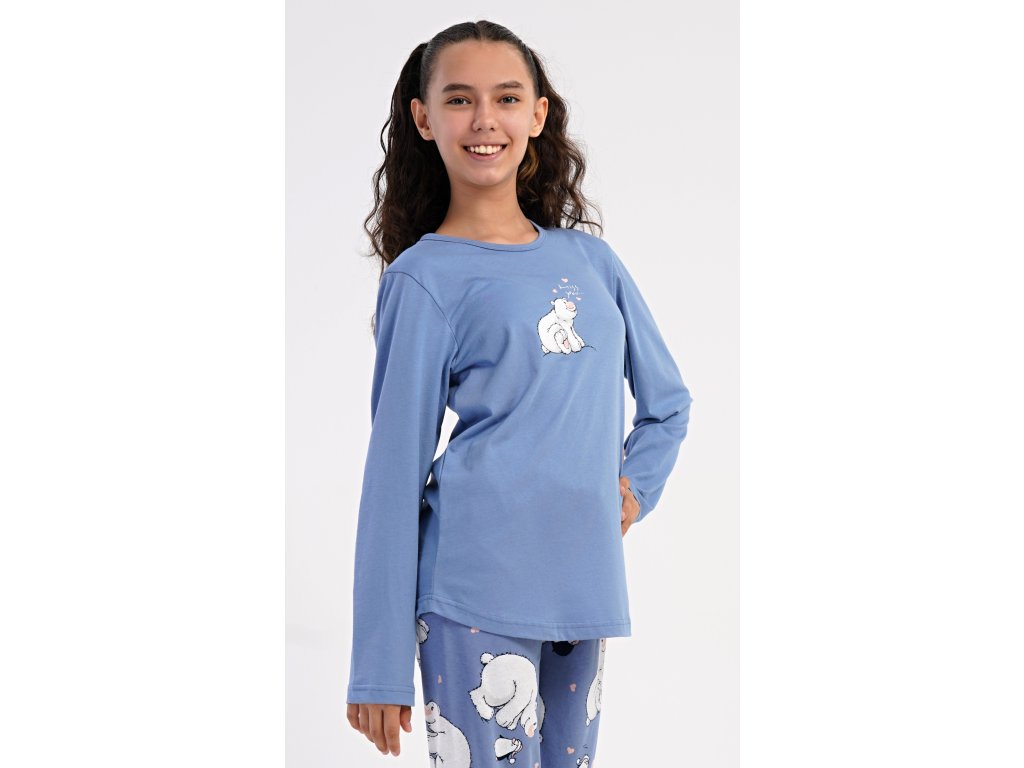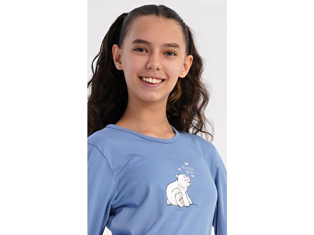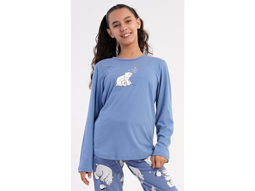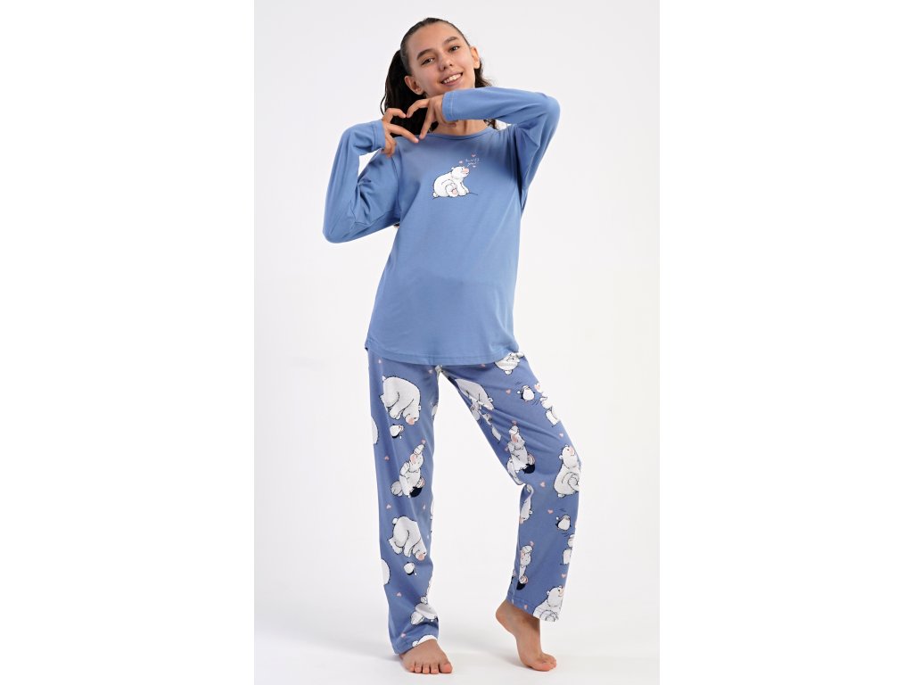 Dětské bavlněné dlouhé pyžamo Méďa a tučňák. Dívčí pyžamo se skládá z trika s dlouhým rukávem a dlouhých kalhot. Triko s kulatým výstřihem je ozdobeno obrázkem ledního medvěda. Tento motiv se opakuje i na kalhotách, které mají v pase gumu a šňůrku na stažení, nemají kapsy. Použitý bavlněný materiál je poddajný a příjemný na dotek.