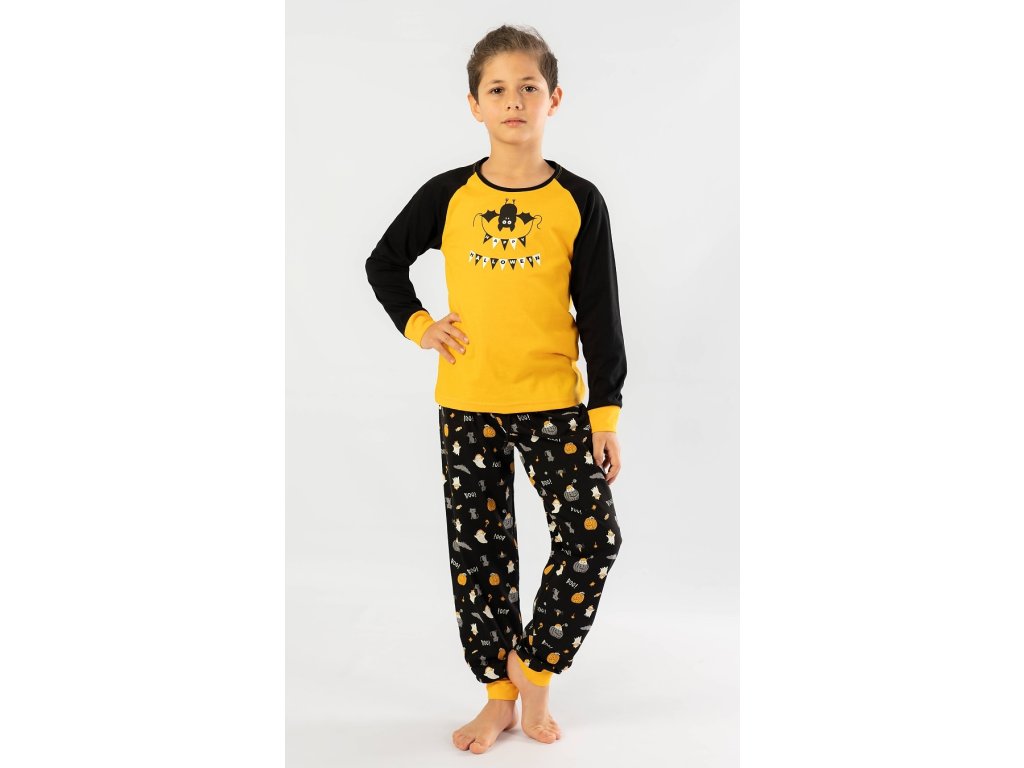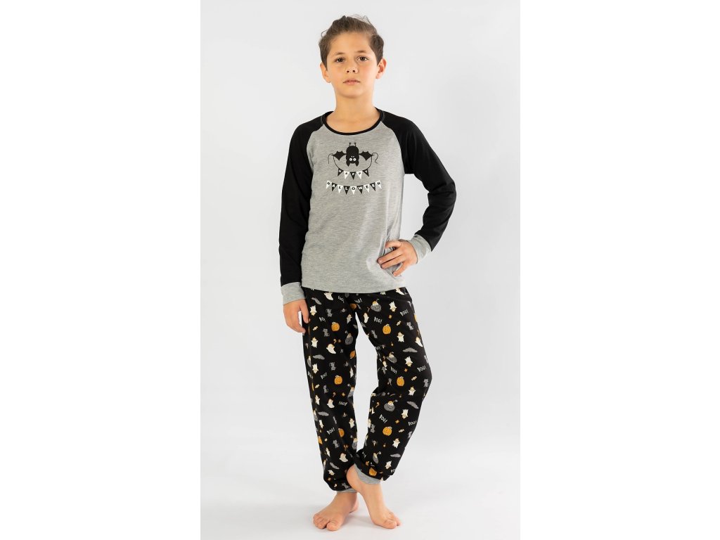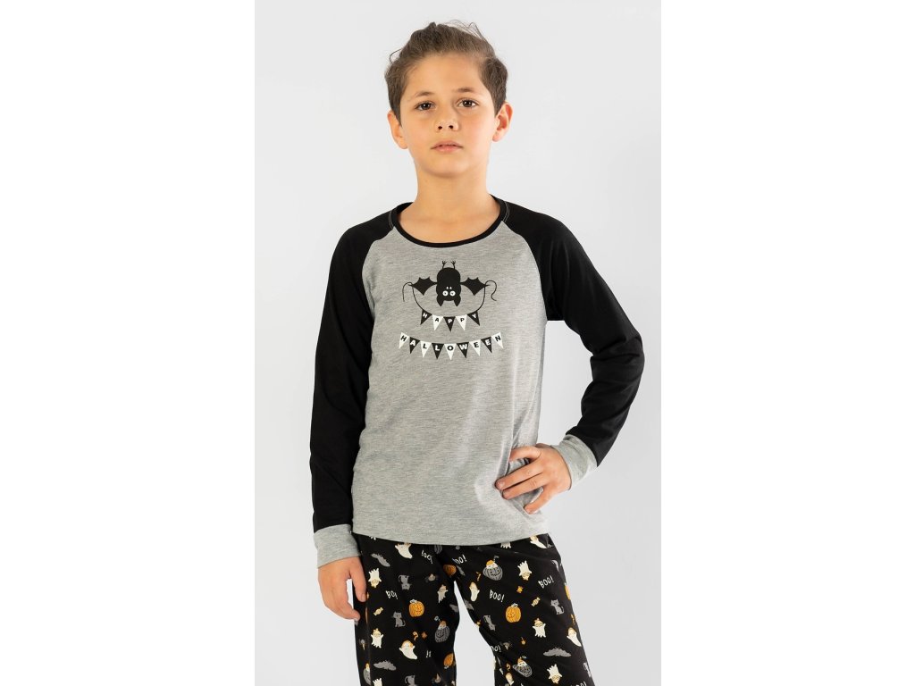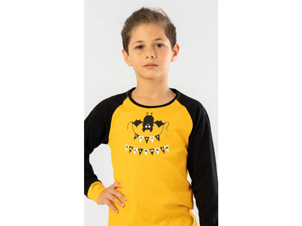 Dětské pyžamo dlouhé Netopýr. Pyžamo se skládá z trička s dlouhým rukávem a dlouhých kalhot. Na tričku, které má barevně odlišené rukávy, je obrázek netopýrka visícího hlavou dolu, který drží girlandu s nápisem Happy Halloween. Tričko je zakončeno panty. Panty jsou zakončeny i dlouhé kalhoty s halloweenskými motivy. Použitý materiál je jemný a poddajný na dotek. Pyžamo je vhodné i na denní nošení.