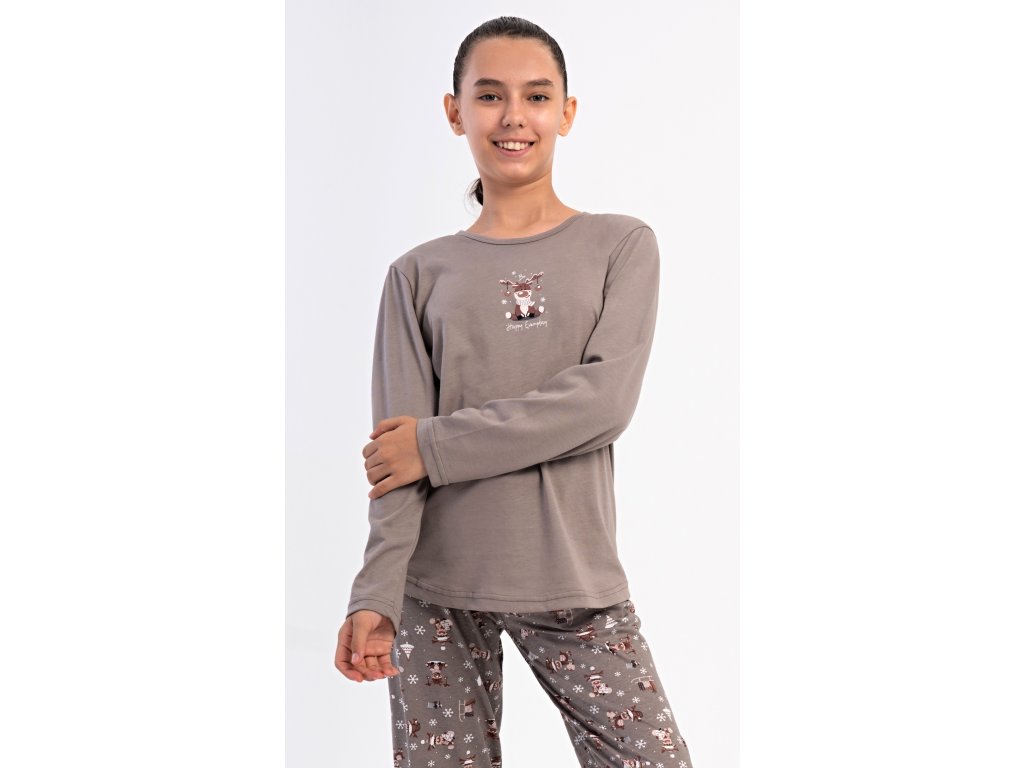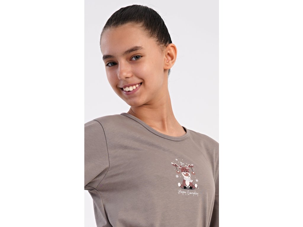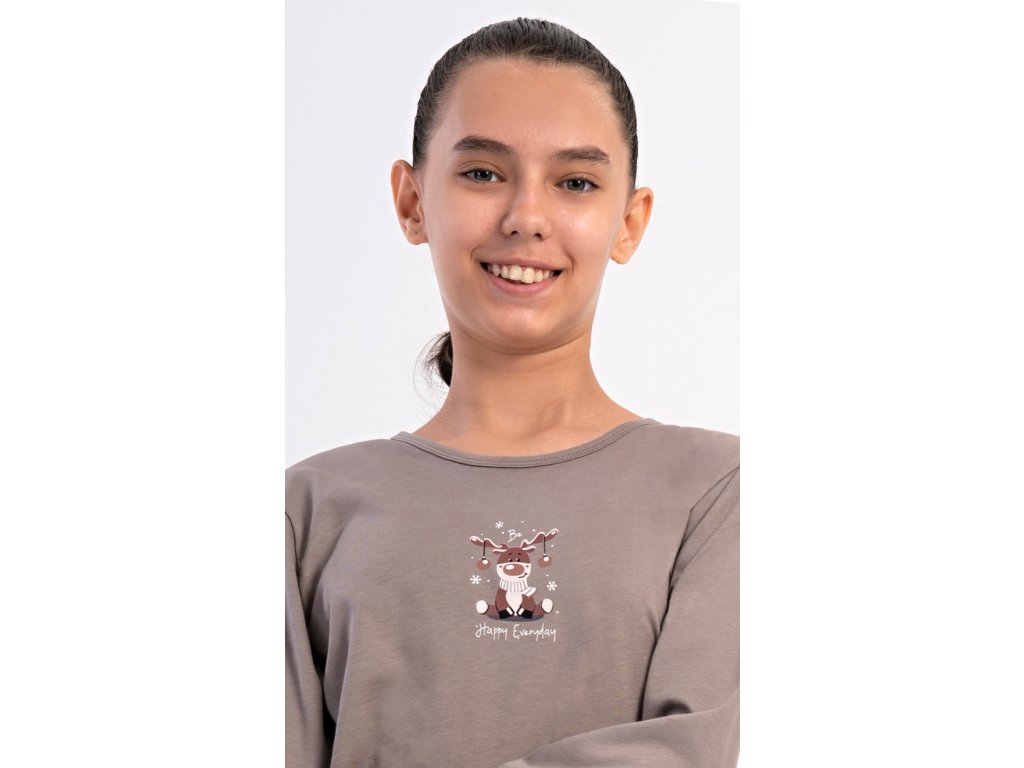 Dětské bavlněné dlouhé pyžamo Sobík. Dívčí pyžamo se skládá z trika s dlouhým rukávem a dlouhých kalhot. Triko s kulatým výstřihem je ozdobeno obrázkem malého vánočního soba. Tento motiv se opakuje i na kalhotách, které mají v pase gumu a šňůrku na stažení, nemají kapsy. Použitý bavlněný materiál je poddajný a příjemný na dotek.