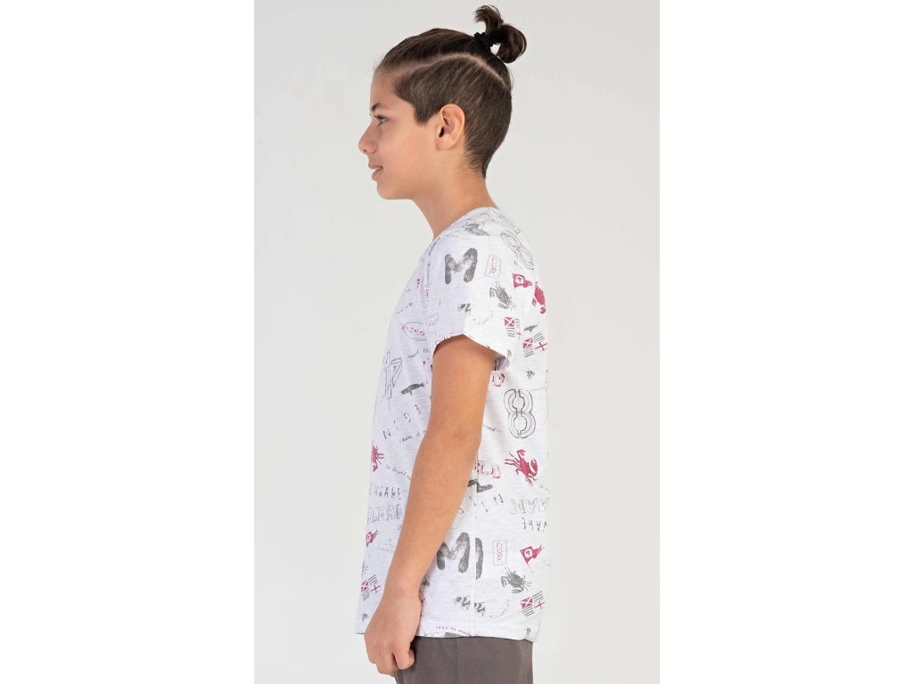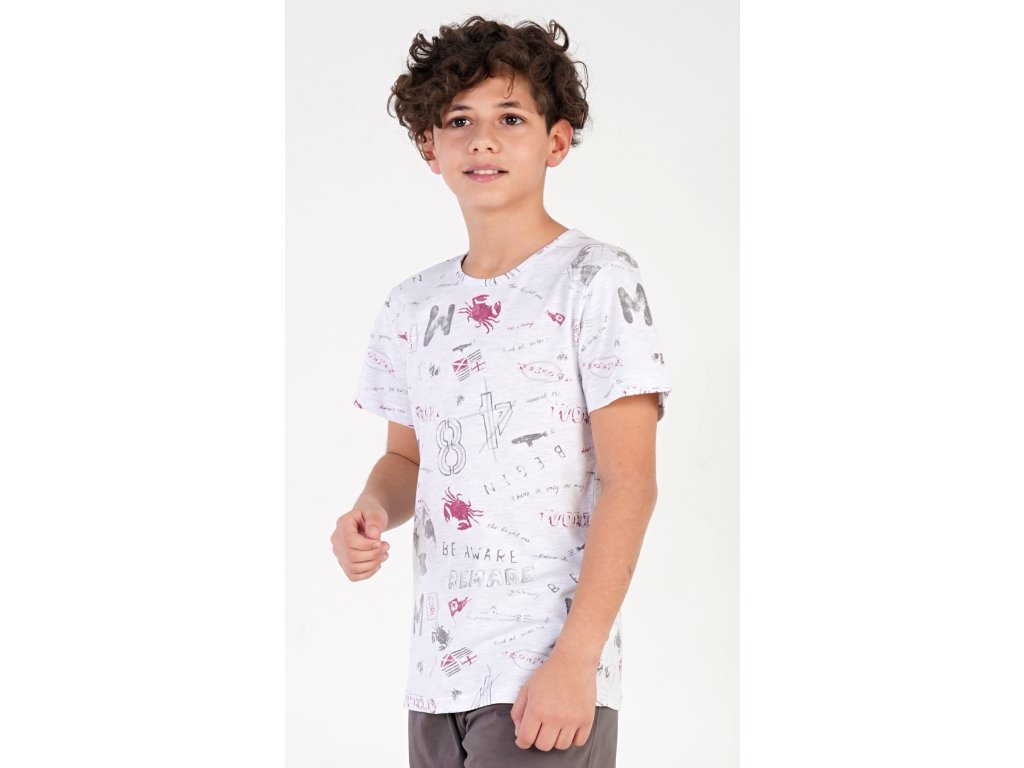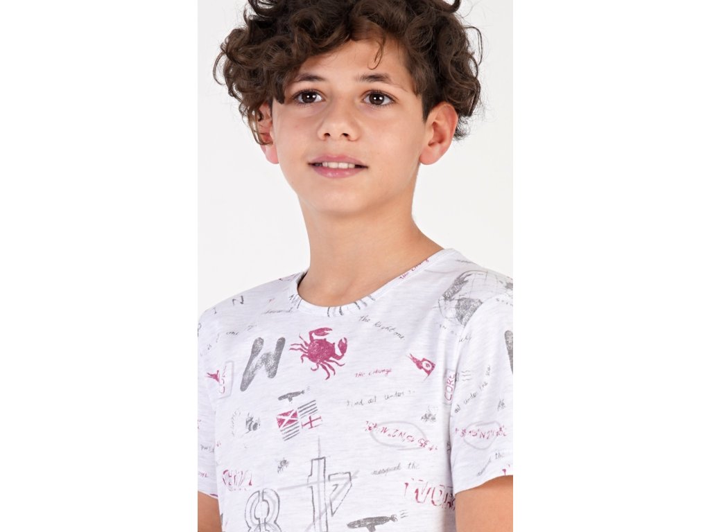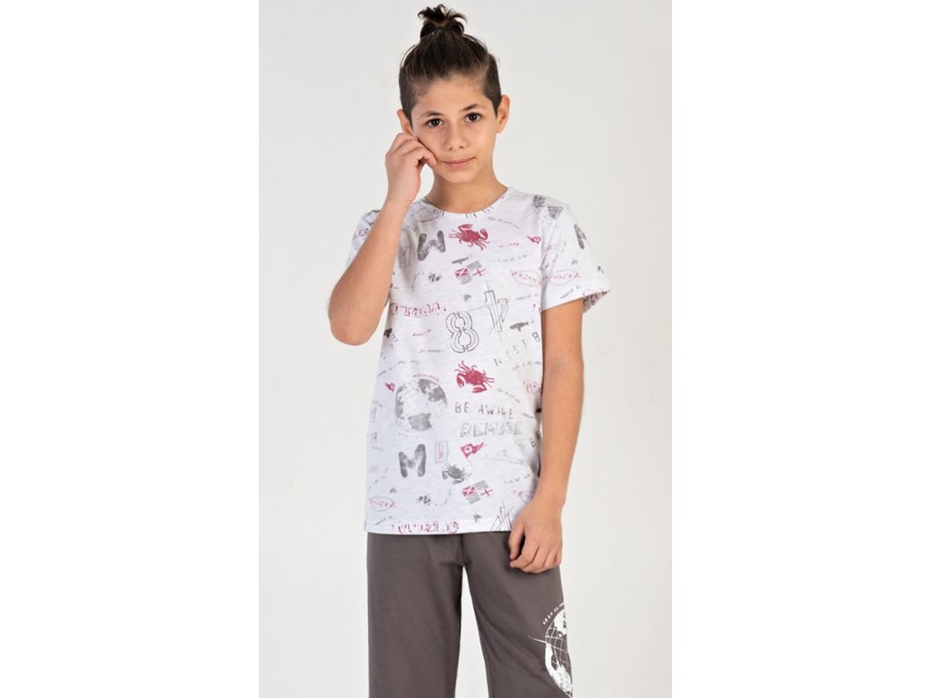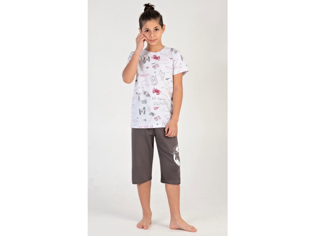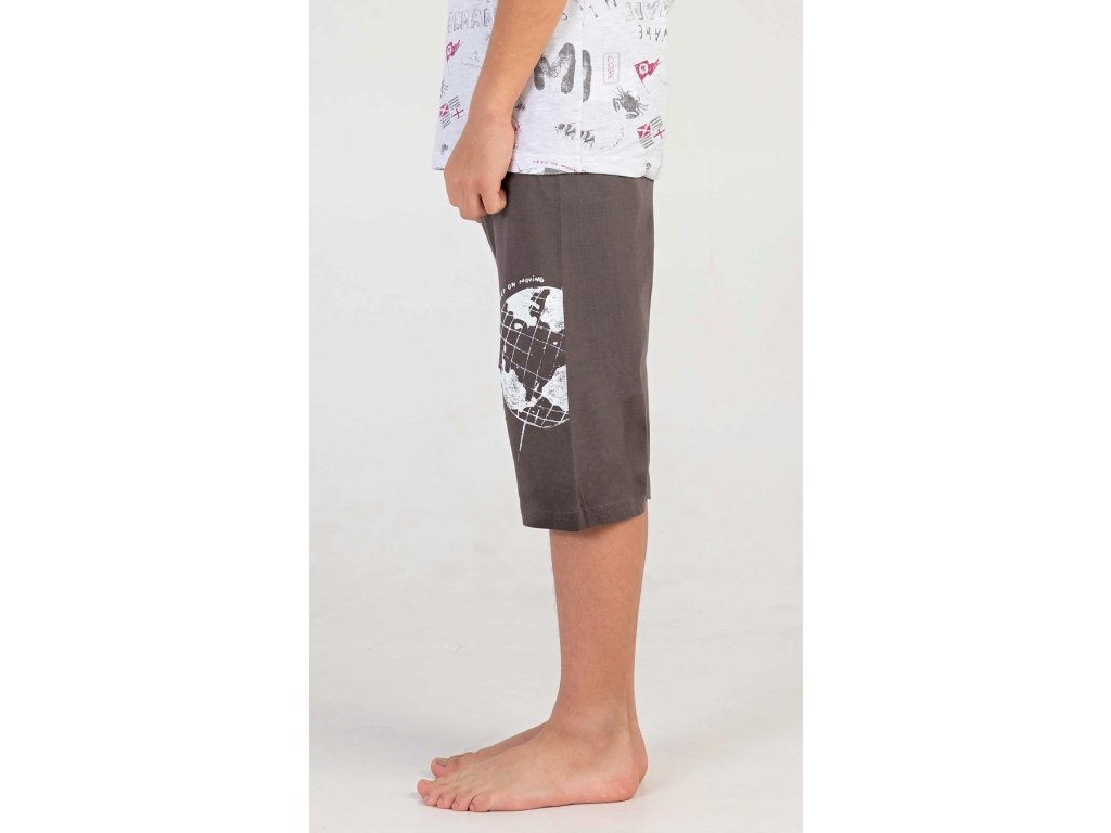 Dětské chlapecké kapri pyžamo Jakub. Dětské pyžamo se skládá z trička s krátkým rukávem a tříčtvrtečních kalhot. Tričko je potištěno motivy moře a cestování. Jednobarevné kapri kalhoty mají v pase gumu, šňůrku na stažení a nemají kapsy. Použitý bavlněný materiál je příjemný a poddajný na dotek. Obsah bavlny u trička je 70% a u kalhot 100%.