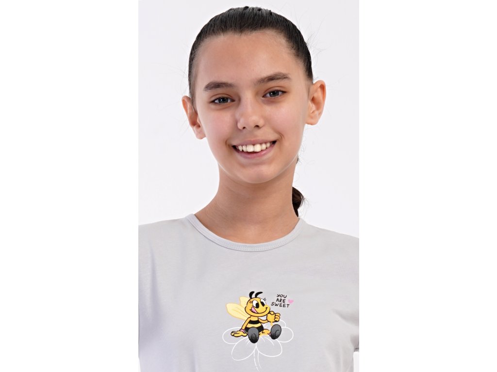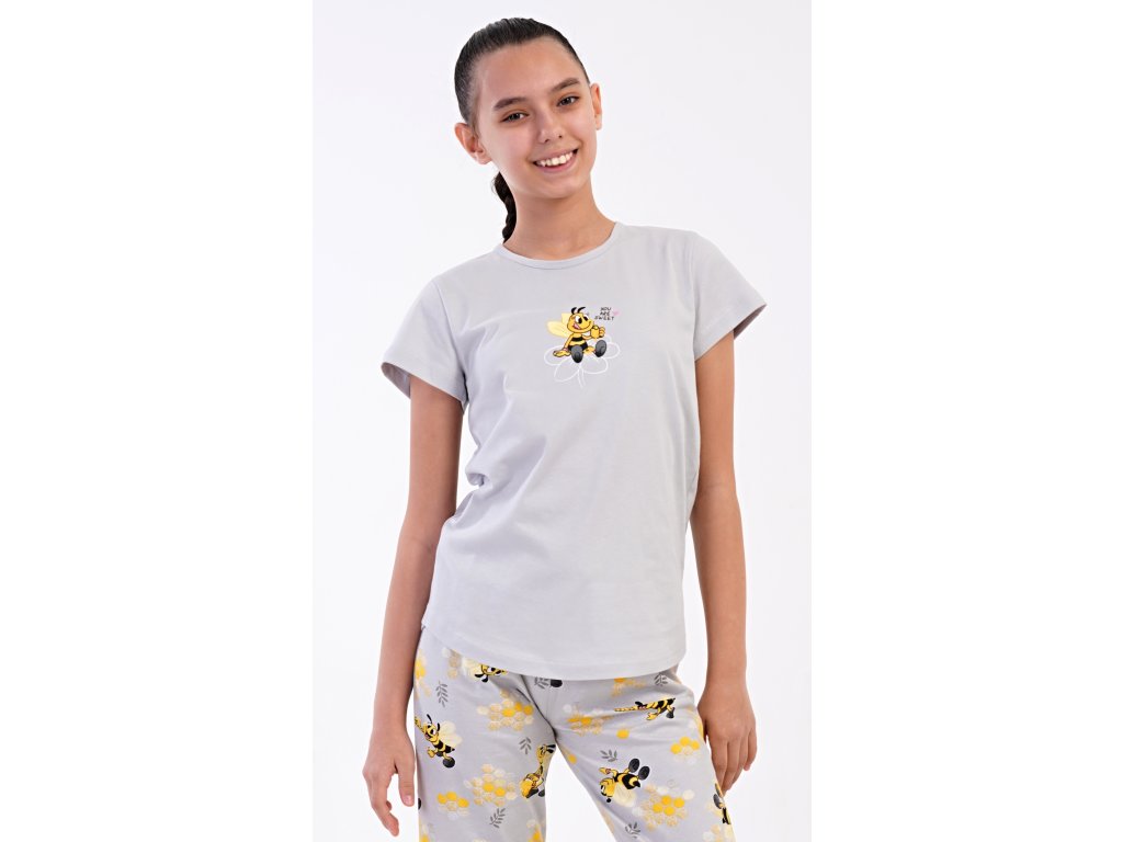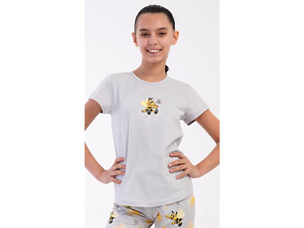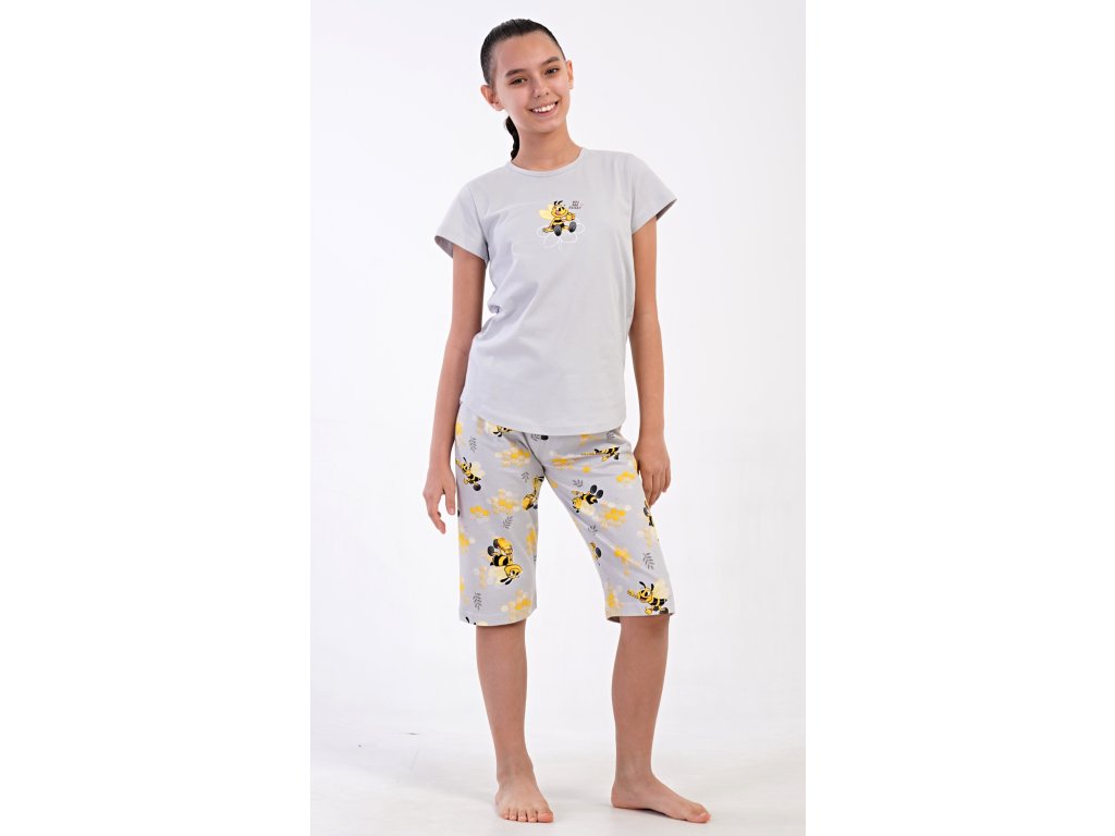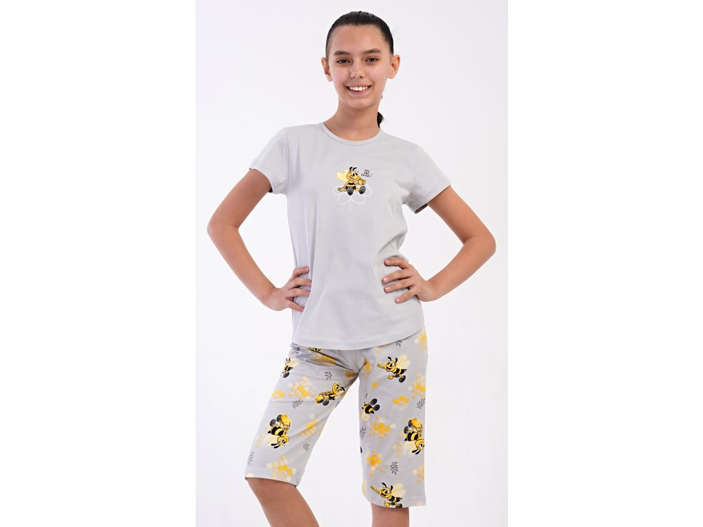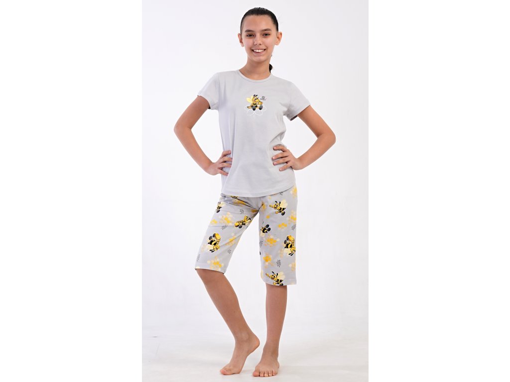 Dětské bavlněné kapri pyžamo Včelky. Dětské pyžamo se skládá z trička s krátkým rukávem a tříčtvrtečních kalhot. Na jednobarevném tričku je obrázek včelky. Tento motiv se opakuje i na kalhotách. Použitý bavlněný materiál je příjemný a poddajný na dotek.