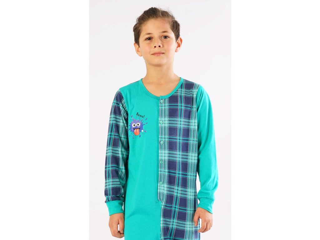 Dětský overal Matěj. Dětský celopropínací overal se pohledově skládá ze střídající se jednobarevné a kárované látky, kdy na jednobarevné látce je malý obrázek bubáčka s nápisem Boo, károvaná strana je bez potisku. Záda jsou celokárovaná. Rukávy a kalhoty jsou zakončeny panty. Použitý materiál je jemný a poddajný na dotek. Pyžamo je vhodné i na denní nošení.