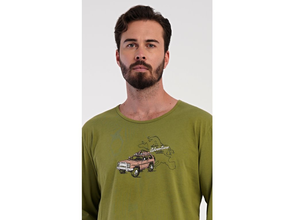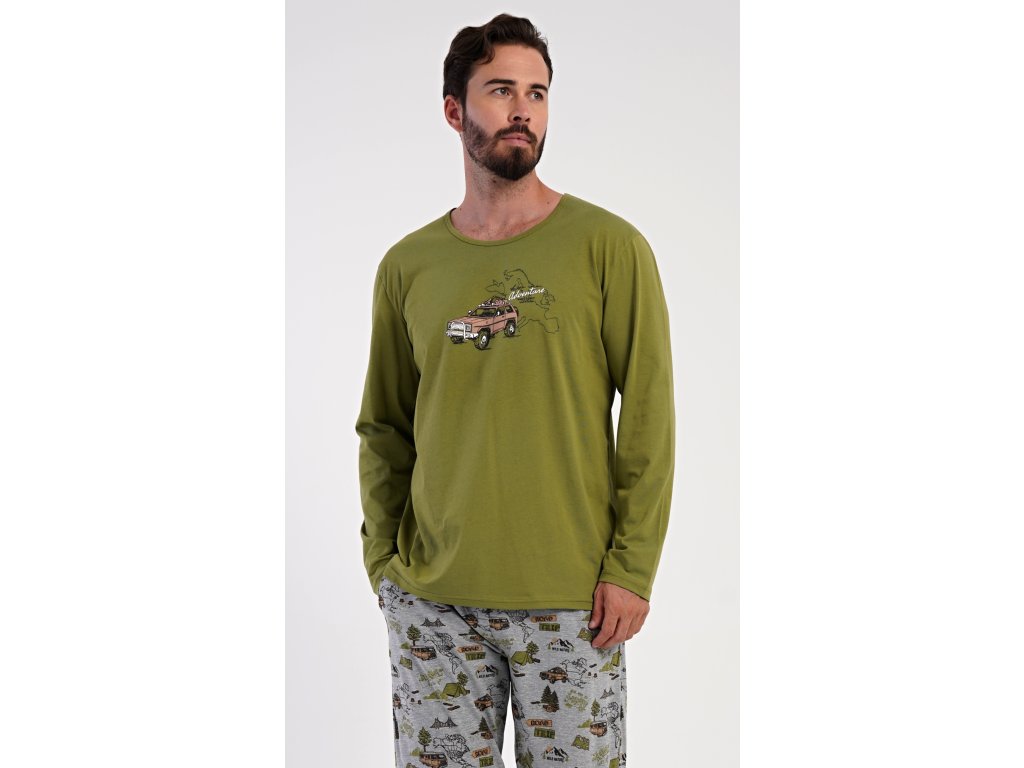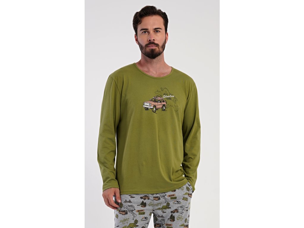 Pánské dlouhé pyžamo Adventure. Pánské pyžamo se skládá z trika s dlouhým rukávem a dlouhých kalhot. Triko je jednobarevné, zdobené na hrudi obrázkem terénního auta. Kalhoty mají v pase gumu, šňůrku na stažení a praktické kapsy. Použitý materiál je příjemný a poddaný na dotek. Obsah bavlny u trika je 100% a u kalhot 70%.
