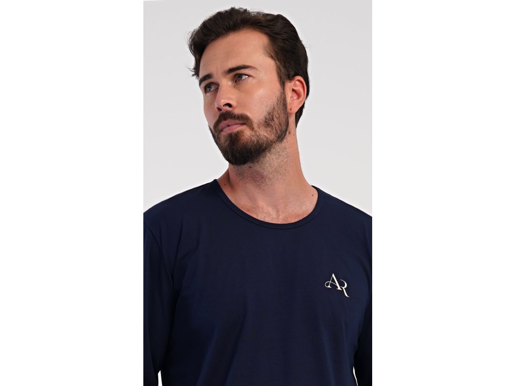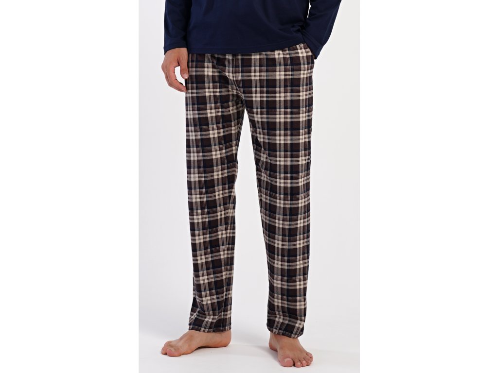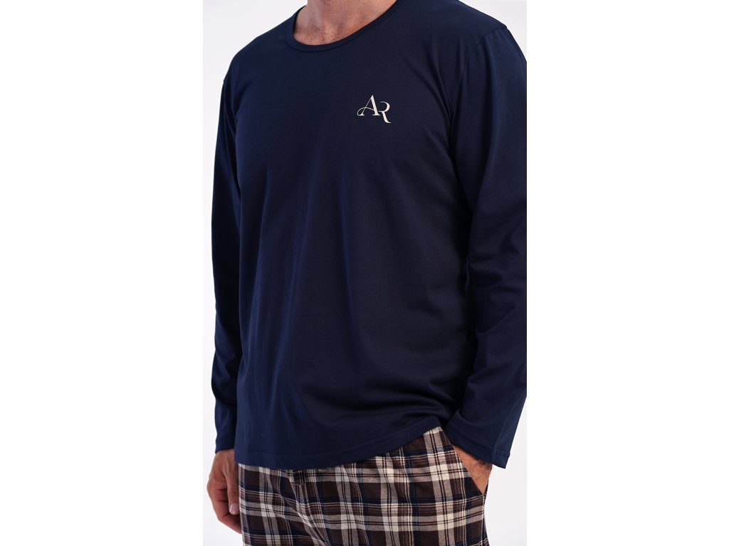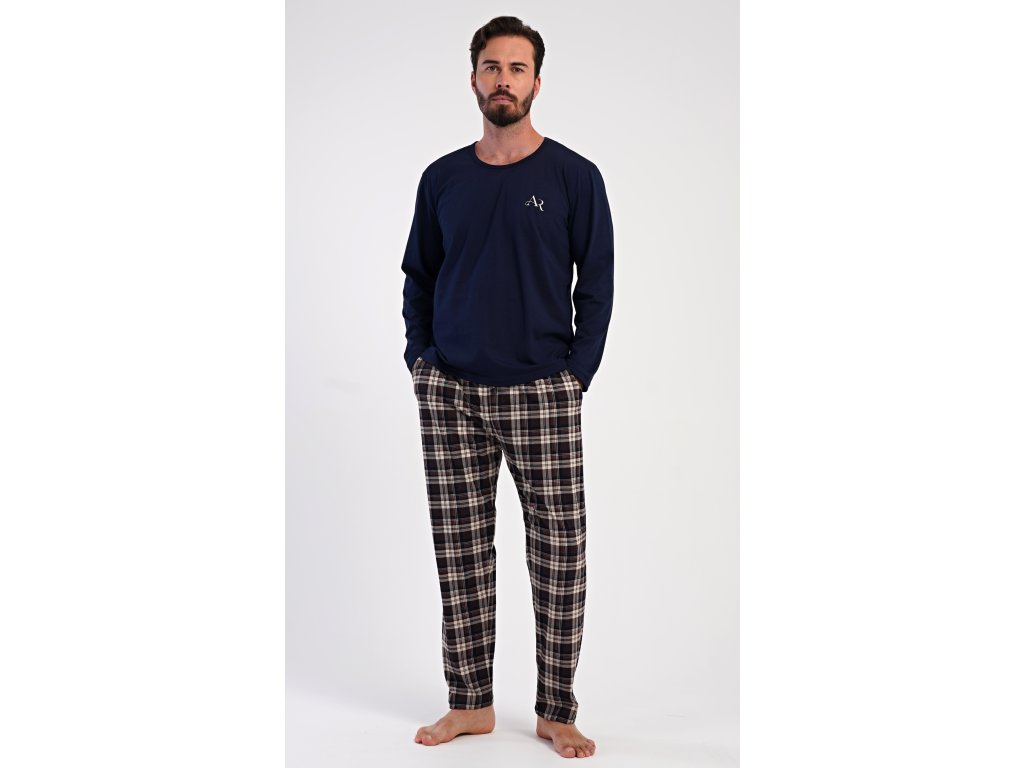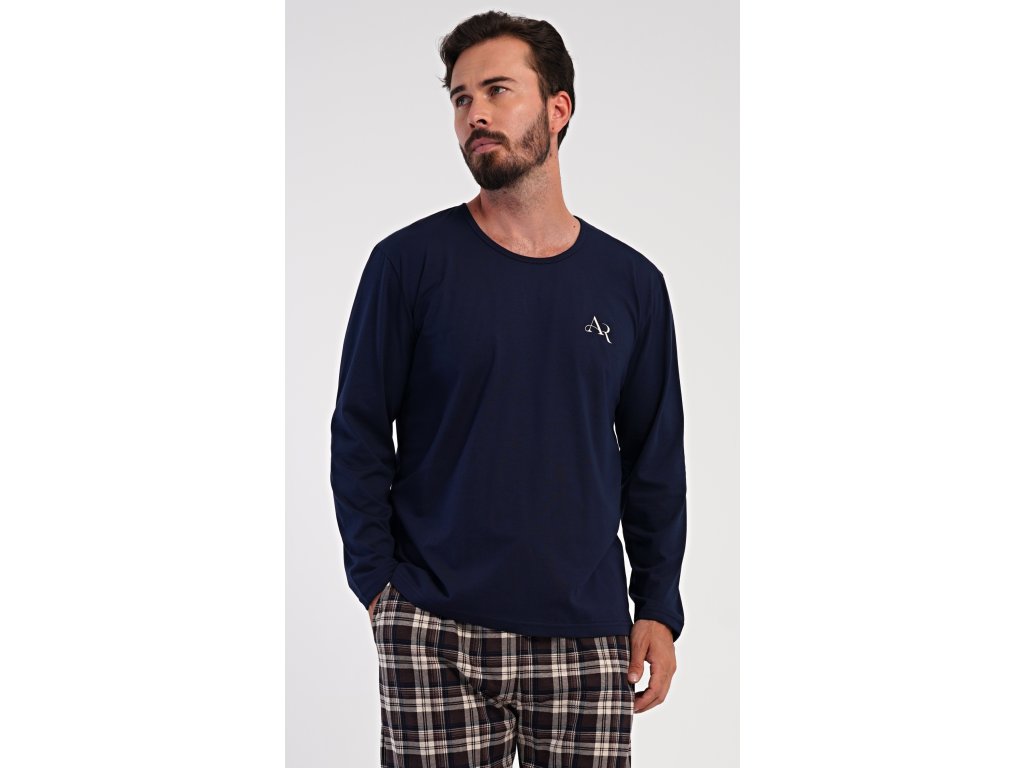 Pánské dlouhé bavlněné pyžamo Armando. Pánské pyžamo se skládá z trika s dlouhým rukávem a dlouhých kalhot. Triko je jednobarevné, zdobené na hrudi drobným obrázkem. Kostkované kalhoty mají v pase gumu, šňůrku na stažení a praktické kapsy. Použitý materiál s obsahem bavlny 100% je poddajný a příjemný na dotek.